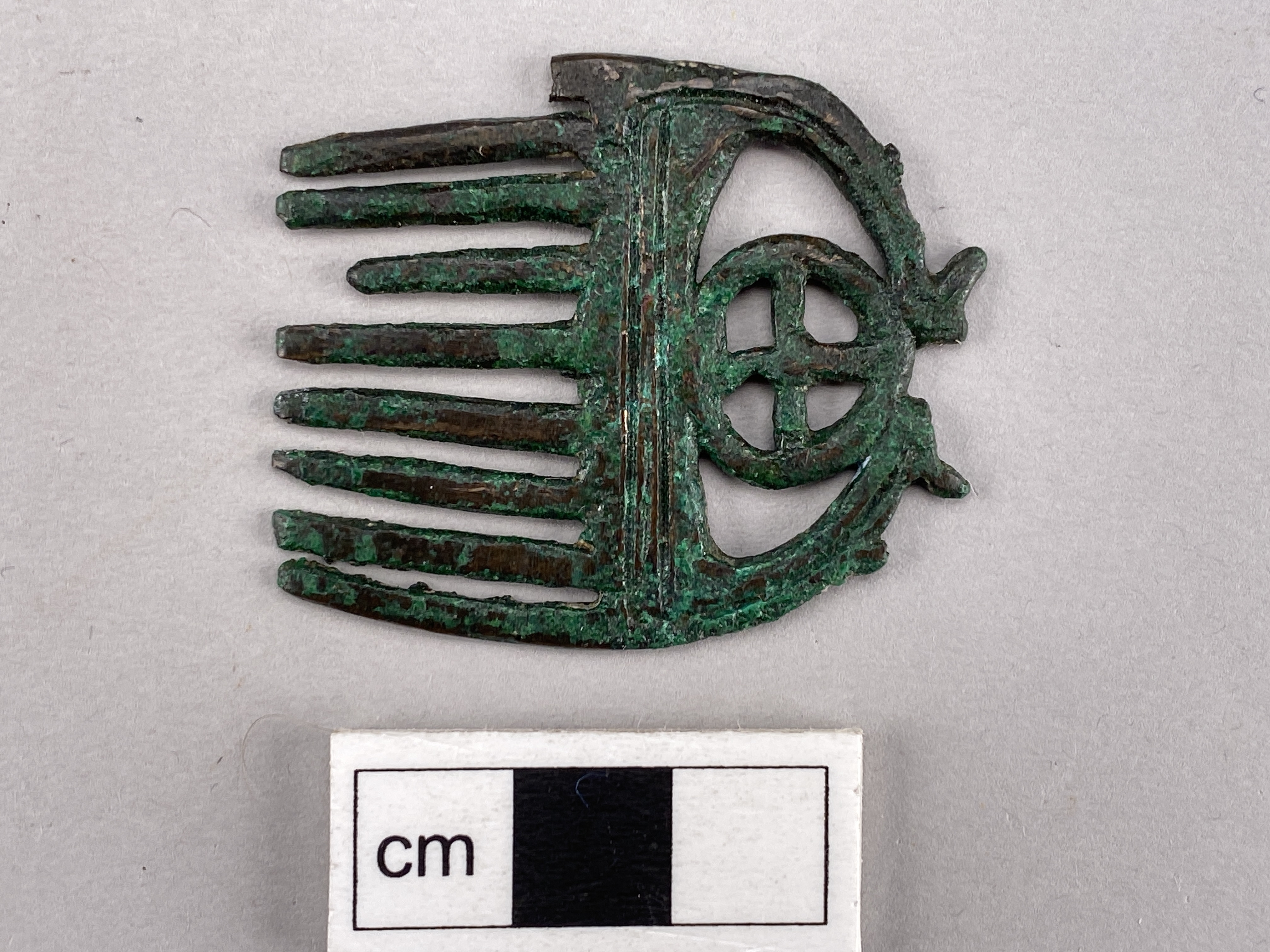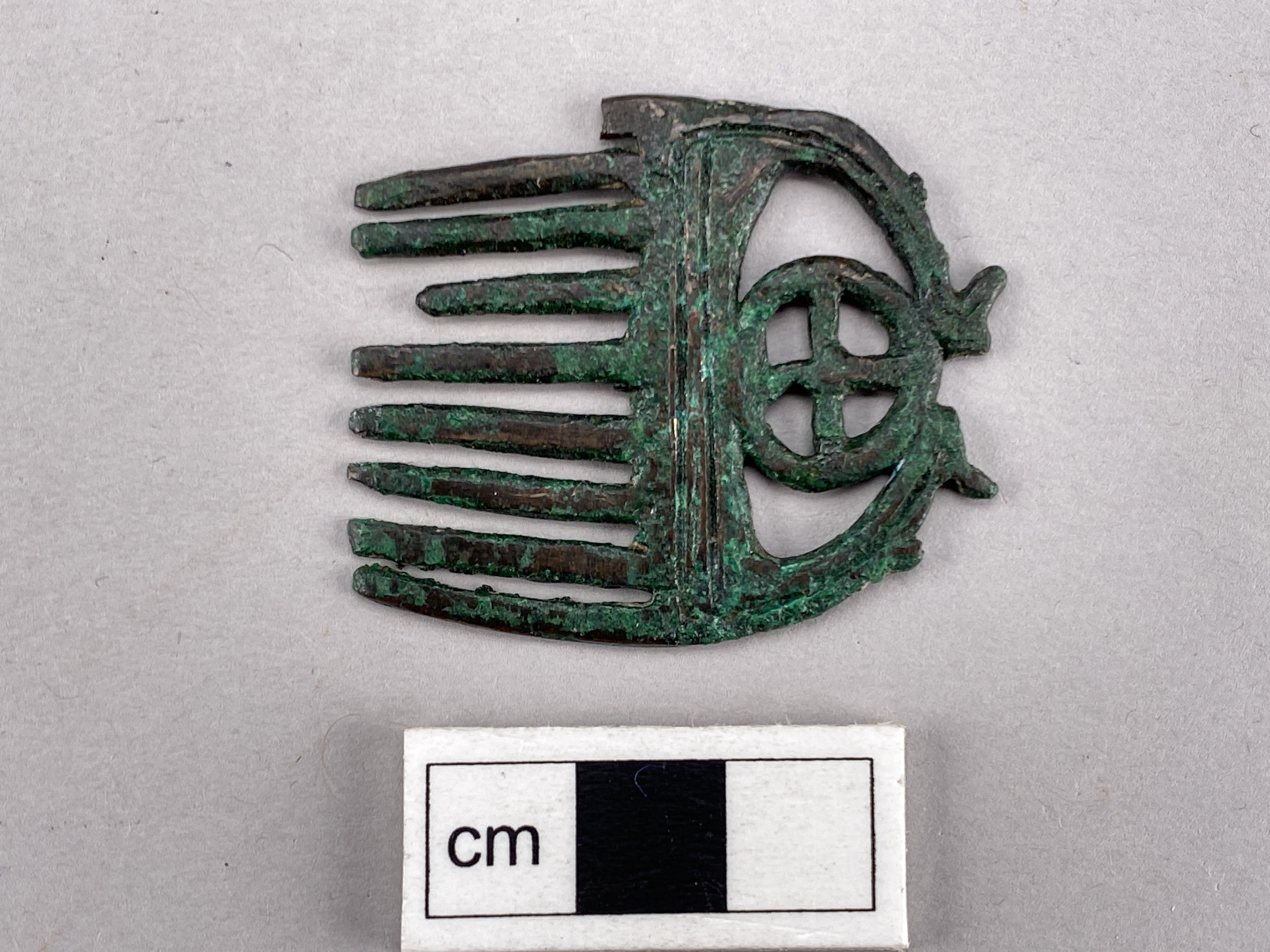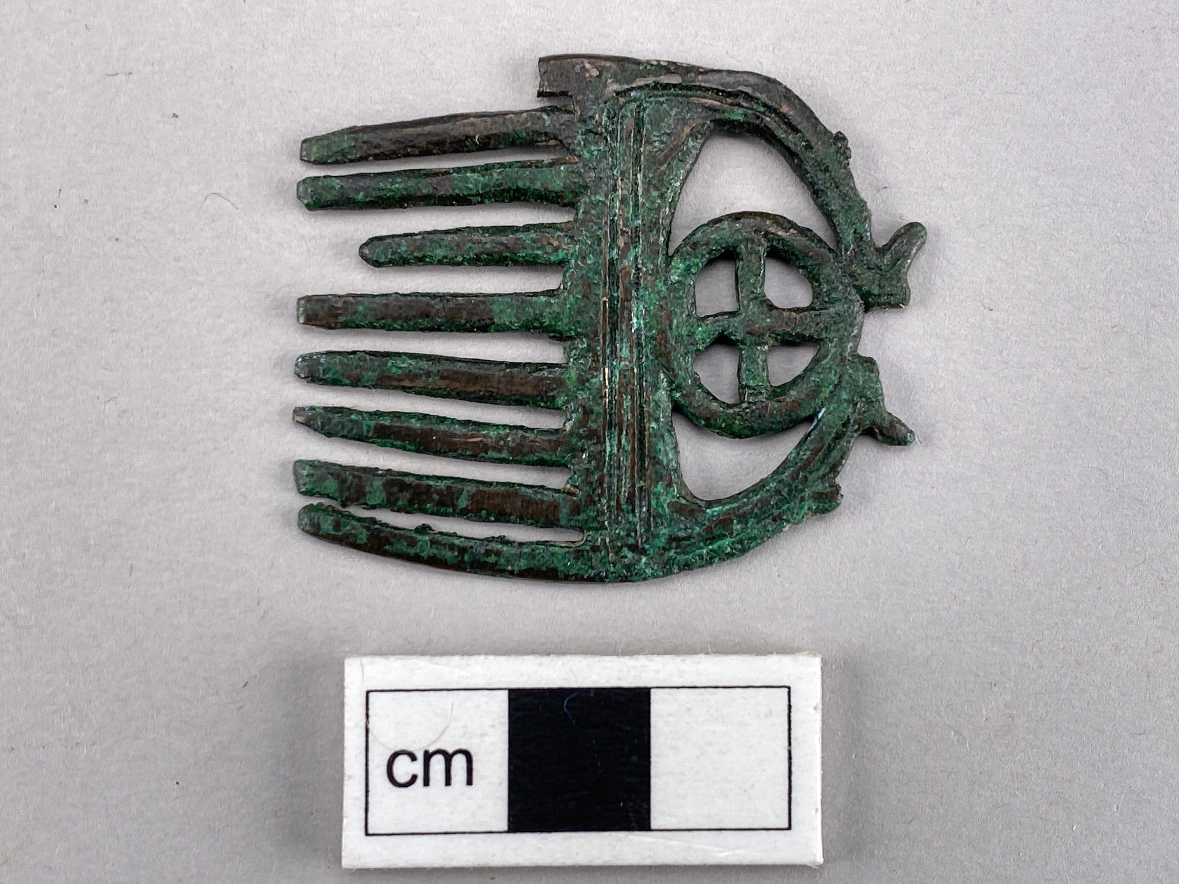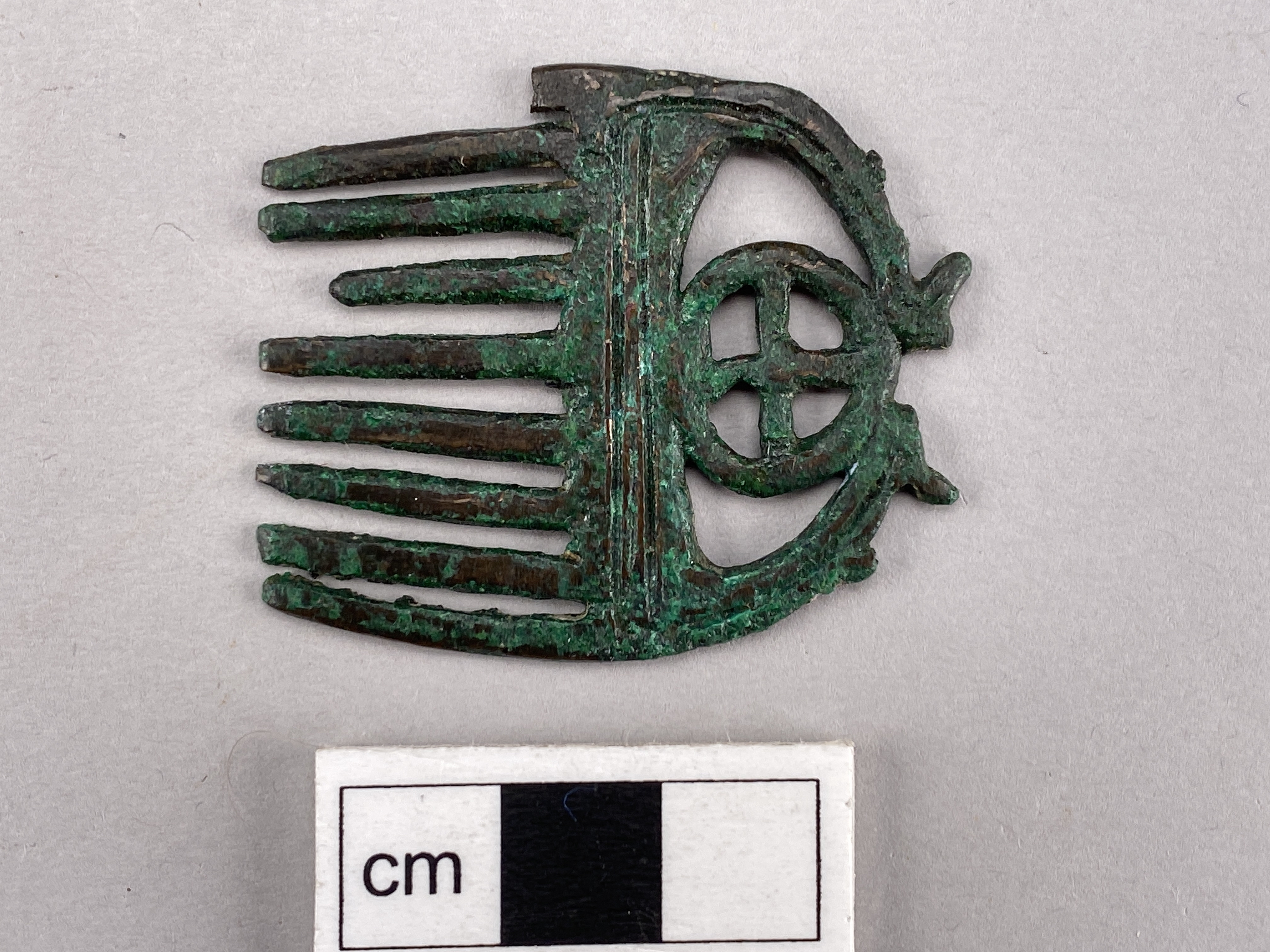 Liten kam av brons med nio tänder och en hjulformig prydnad i övre delen.