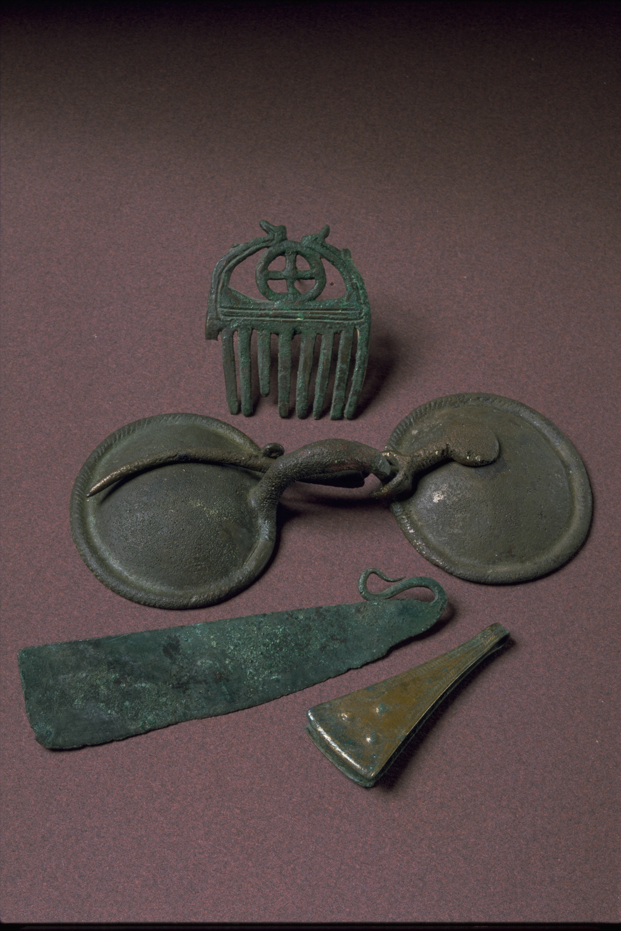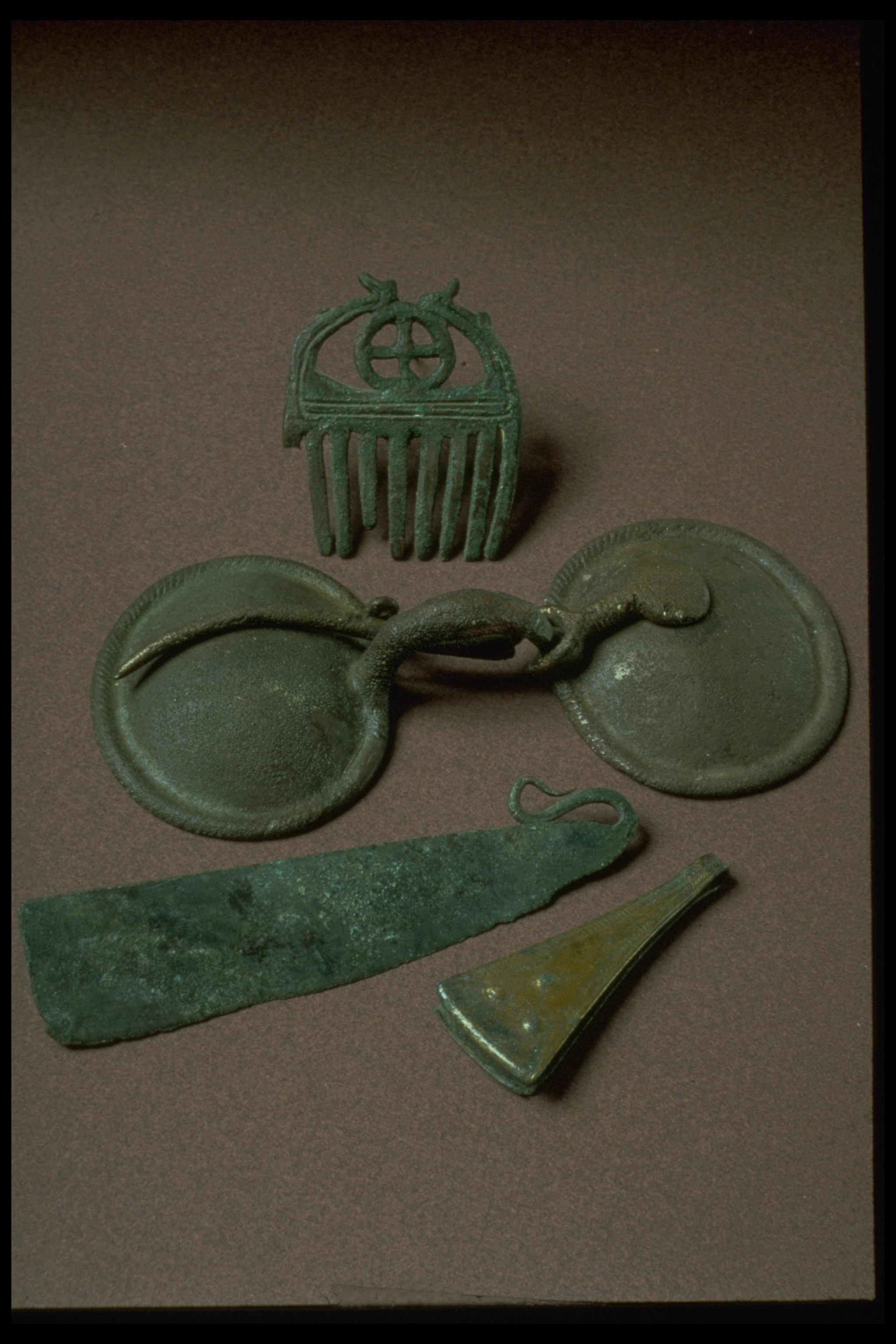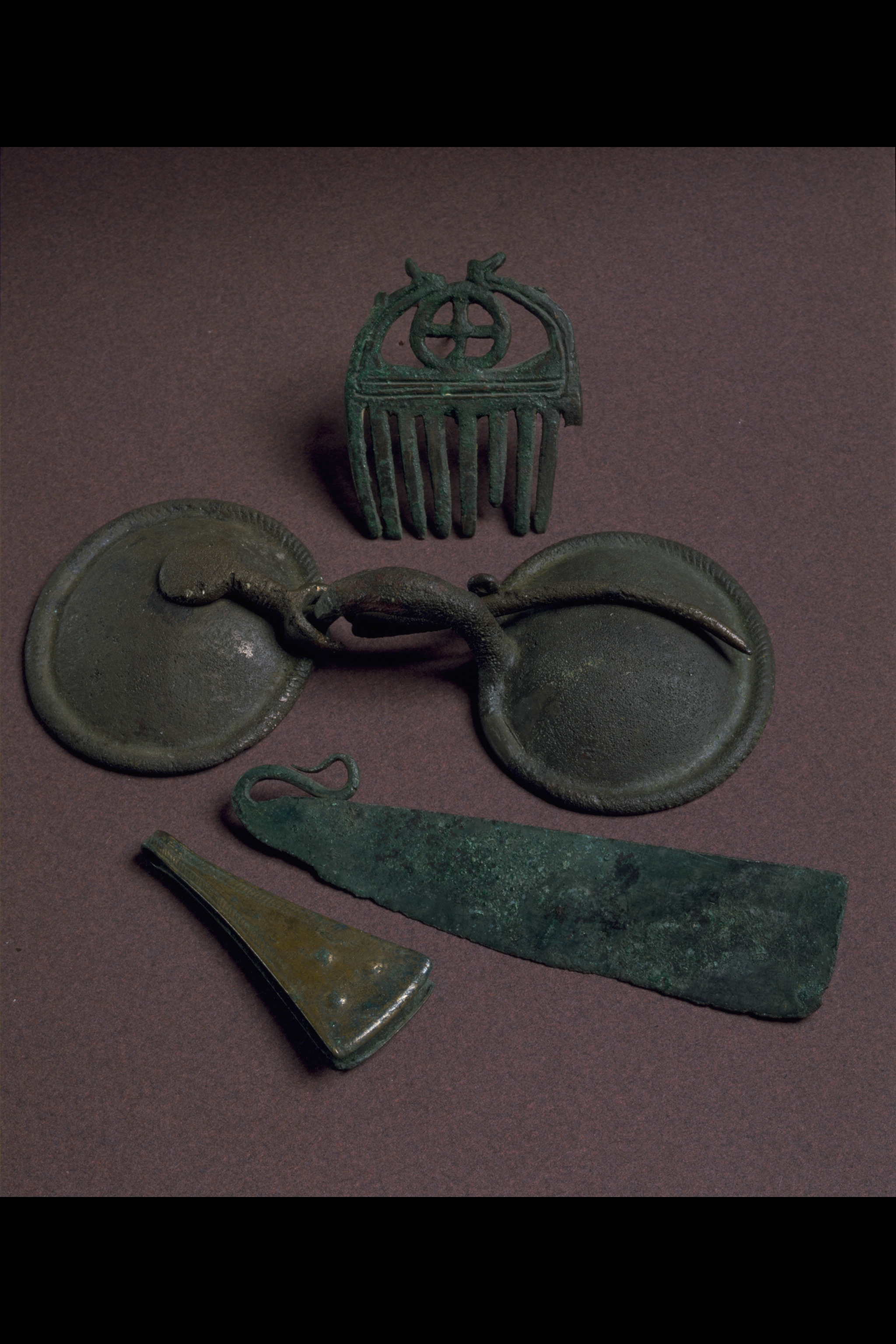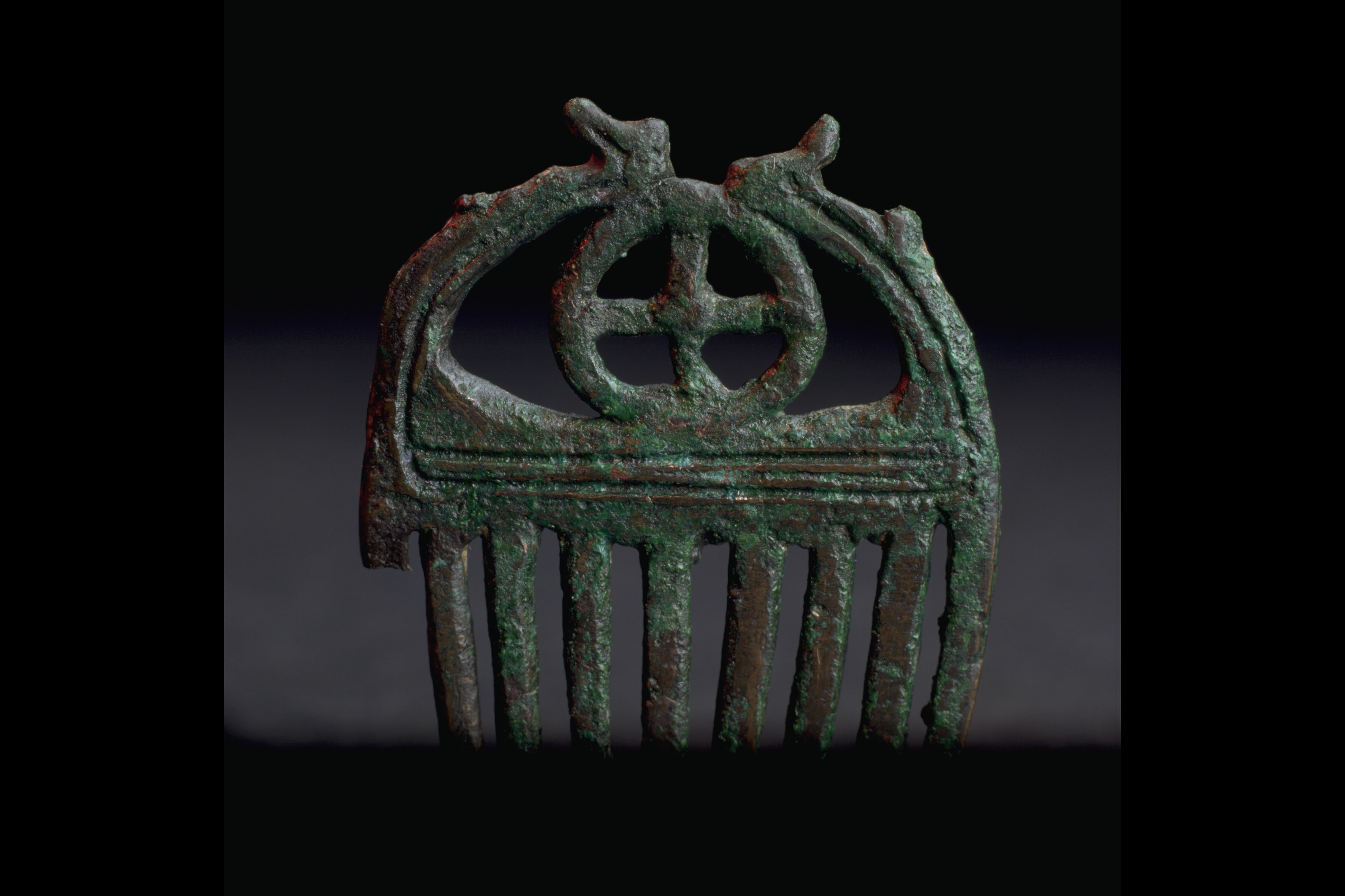 Liten kam av brons med nio tänder och en hjulformig prydnad i övre delen.