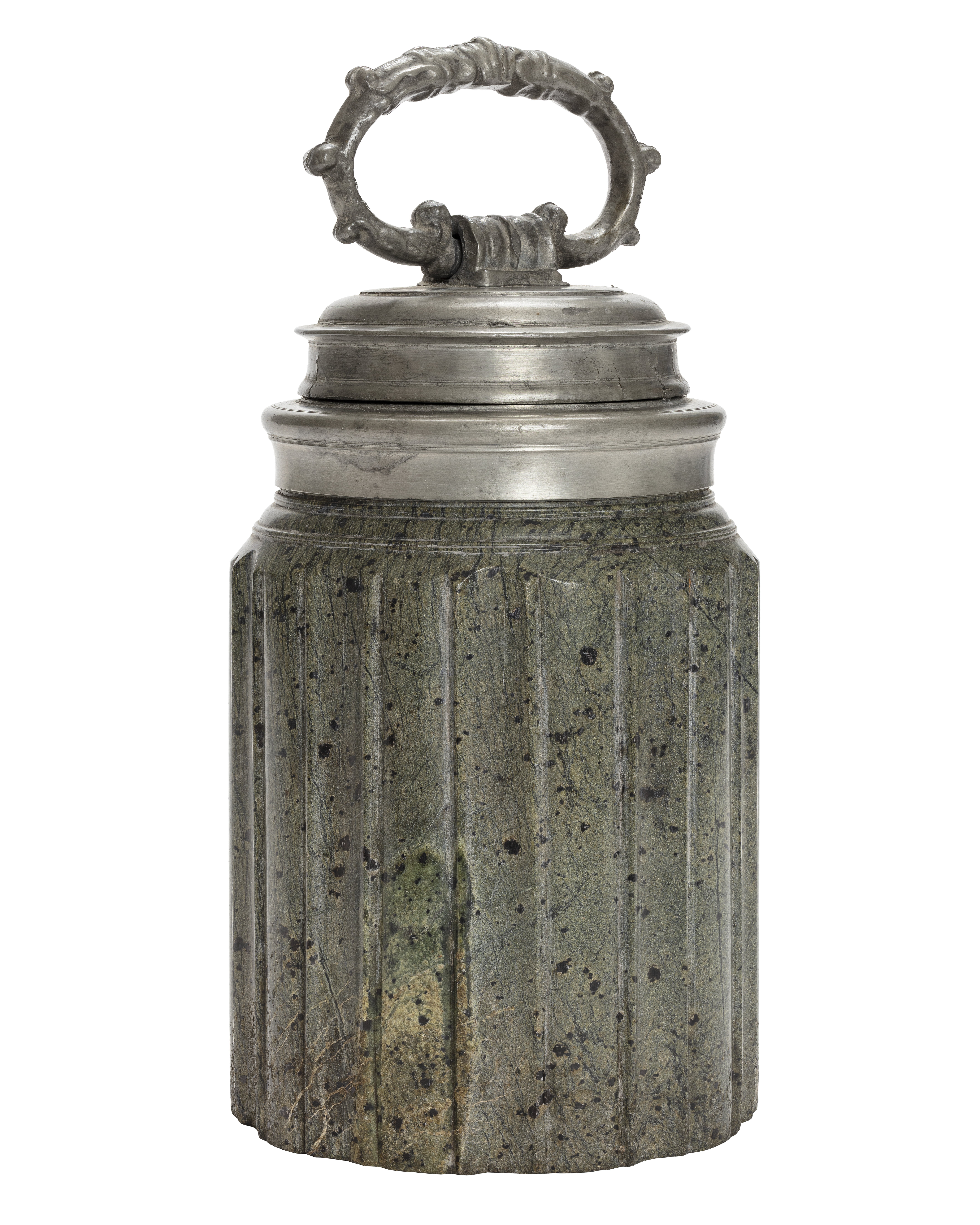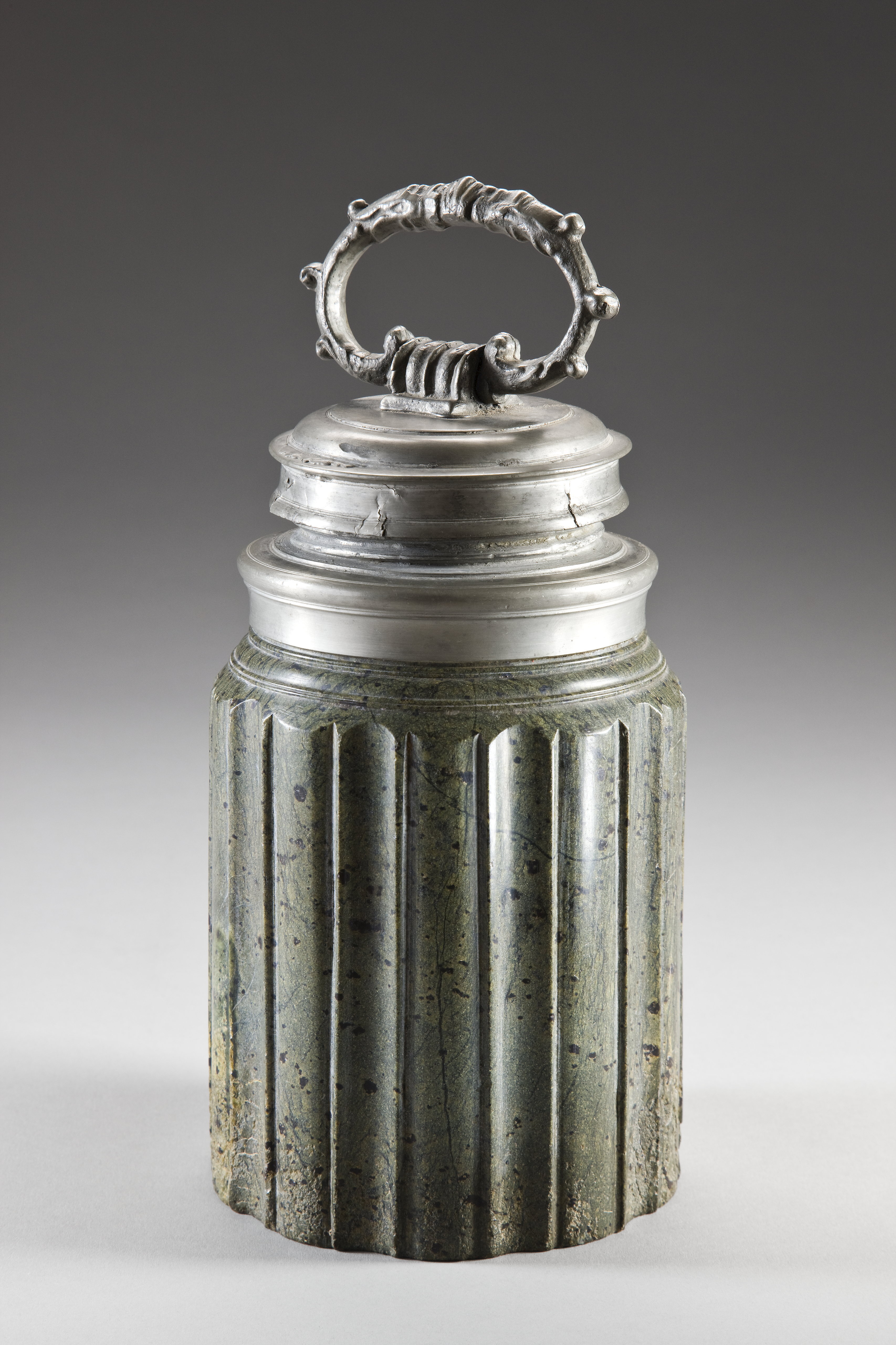 Flaska av svarvad grön serpentin med dubbla lock av tenn.