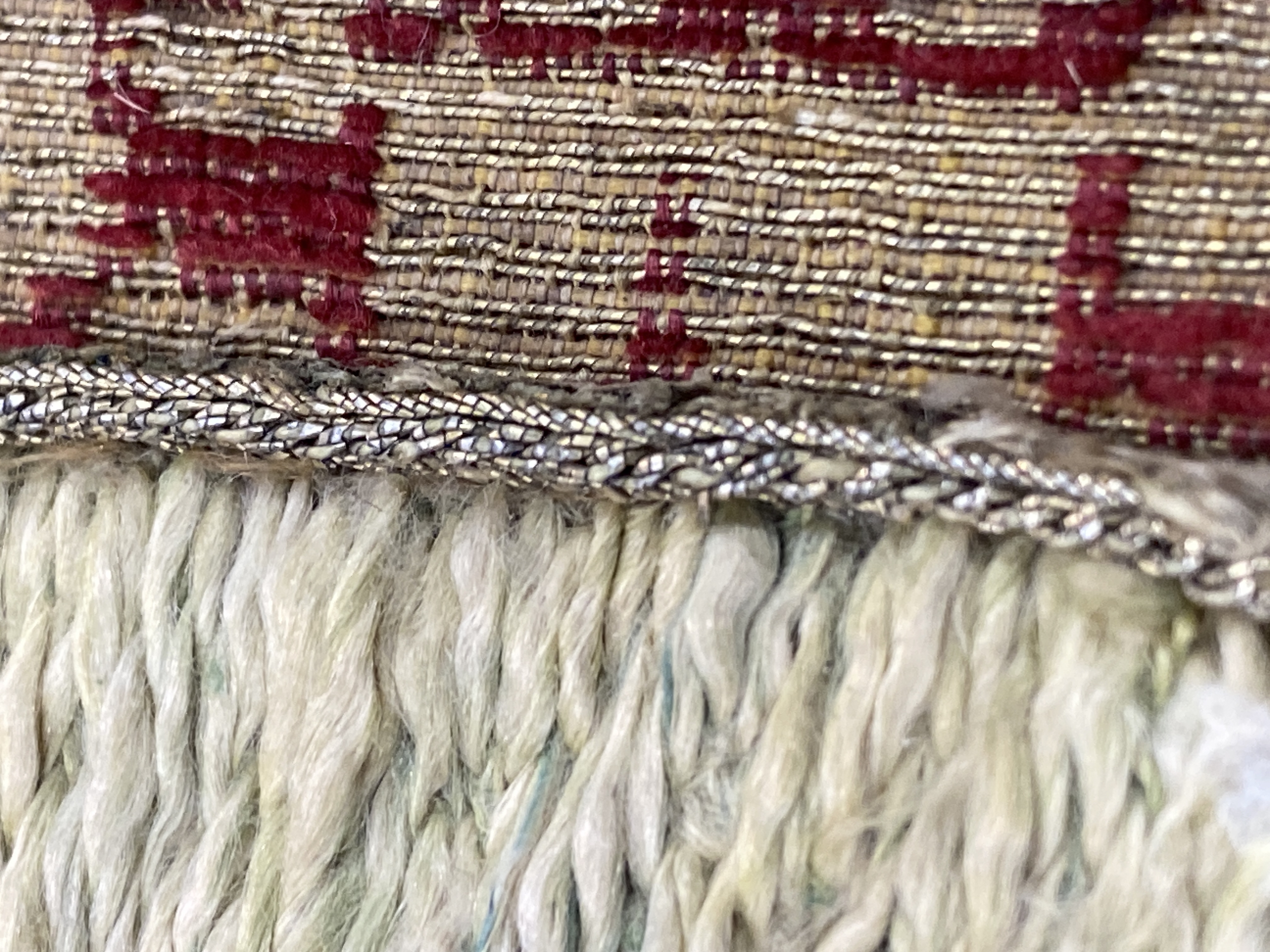 Ursprungligen röd silkesammet, omsytt och återanvänt. På ryggsidan kors och på framsidan bård av röd granatäpplemönstrad sammetsbrokad av två slag, senmedeltida. På korset krucifix med kors broderat i grönt och brunt silke. kristusfiguren kraftigt nött, karnation av ursp benvit sidenatlas därunder mönstervävdt linne, brunt hår, grön gloria. Golgatakulle av sidenatlas, dödskalle i ursp vit sidenatlas. Foder av nu gråvit linnelärft. Deposition från Nordiska museet 1998 (Nm 9.937). (Mandelgren 30).