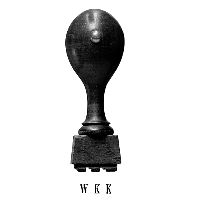Rektangulär skiva, på vars undersida i relief initialerna W K K (avtryck, se Planschverket). Skivan fäst på en fyrsidig träklots. Skaft svarvat, päronformigt, på lång smal hals samt brunbetsat och polerat, nedtill kring halsen en profilering; på den päronformiga delen ett vitkokat mässingsstift med kullrigt huvud, angivande, hur stämpeln skall hållas. Tillhört inventarierna på firman Wilh. H. Kempes (innehavare Walther von Hallwyl och Johanna Kempe, f. Wallis) kontor, inrymt i Blasieholmstorg 11, 1884 - 30 September 1896, och Hamngatan 4, 1 Oktober 1896 - 1909.