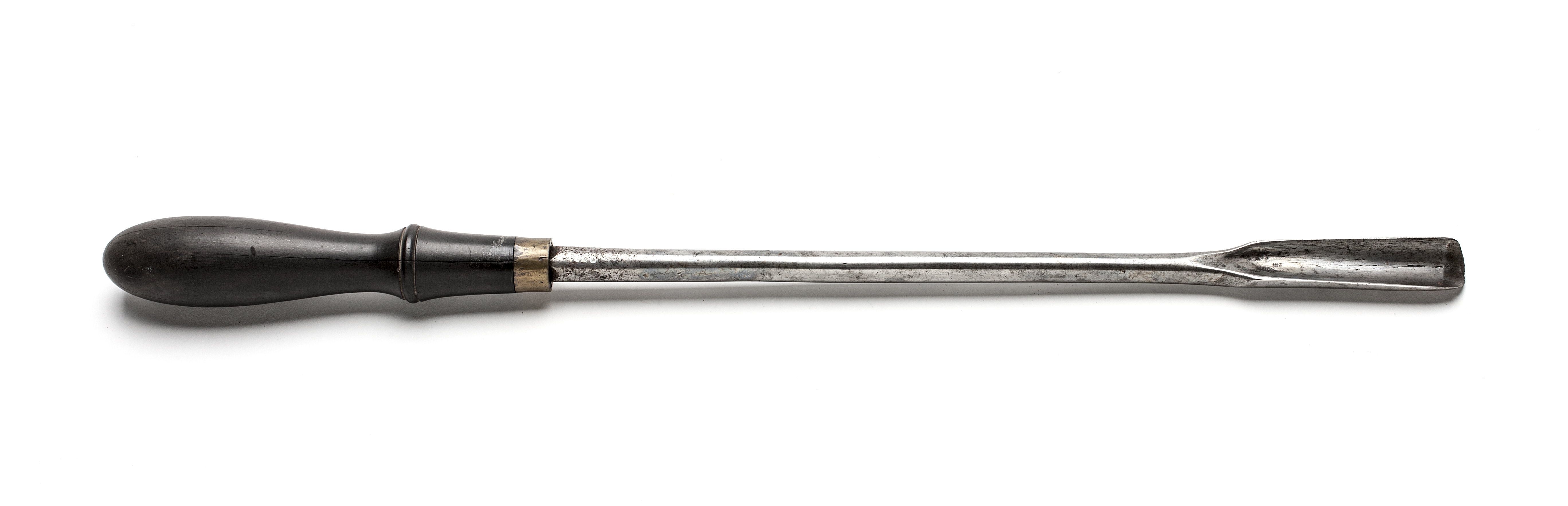 Rund klinga. Svarvat skaft av ebenholts med en vulst. Mässingsring.