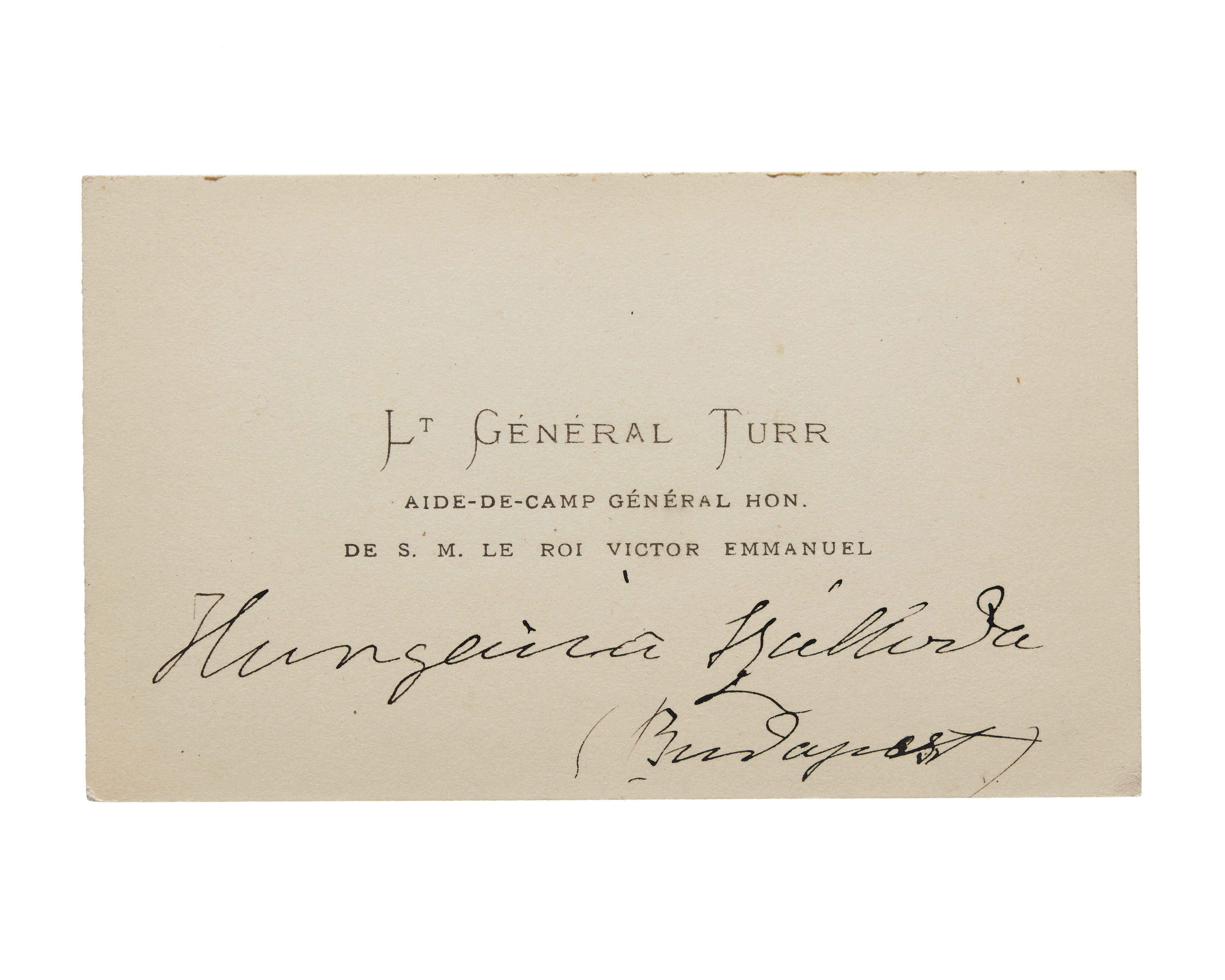 Ett visitkort med texten "Lt General Turr, Aide-De-Camp General Hon. De S. M. le Victor Emmanuel."