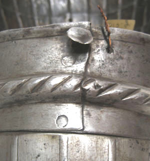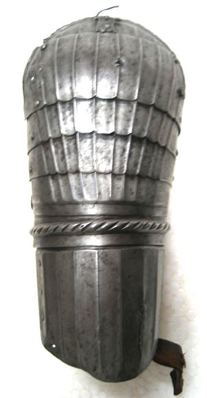 Driven räfflad stålplåt, sammanlagt sju delar. Axelstycke välvt, nedåt avsmalnande. Av fem skenor, i den översta rektangulärt remhål och sölja av stål. Övre kant omvikt och repstavsfilad, därefter slät bård, B 17 mm. På samtliga skenor vertikal räffling och släta sidor. Överarmsskena, rörformig med urtagningar mot armvecket. Av två delar varav den övre slät med driven horisontell ås med snedställda linjer. Mot insidan nitad söm, vid denna utstående nit med platt skalle, diam 10 mm. Nedre delen med vertikal räffling och släta sidor. Delarna sammanfogade med drivna åsar till en ursprungligen i sidled rörlig led, nu stel. Anmärkning: Sliten. Spridd svart korrosion. Söljan ursprunglig, ramen skadad. Nedre kanten stukad, 60 mm lång spricka i skenan. Märkt i rött 2615 h. Etiketter 2615 g, arm 20236. Enligt tradtion Magnus Ladulås rustning. Tidigare upptagen under Magnus Ladulås rustning och under 1800-talet utställd i Riddarholmskyrkan i den sk kungalängden med rustningar som påstods ha tillhört regenter från Birger Jarl till Gustav II Adolf.