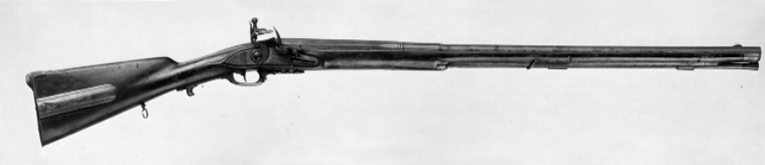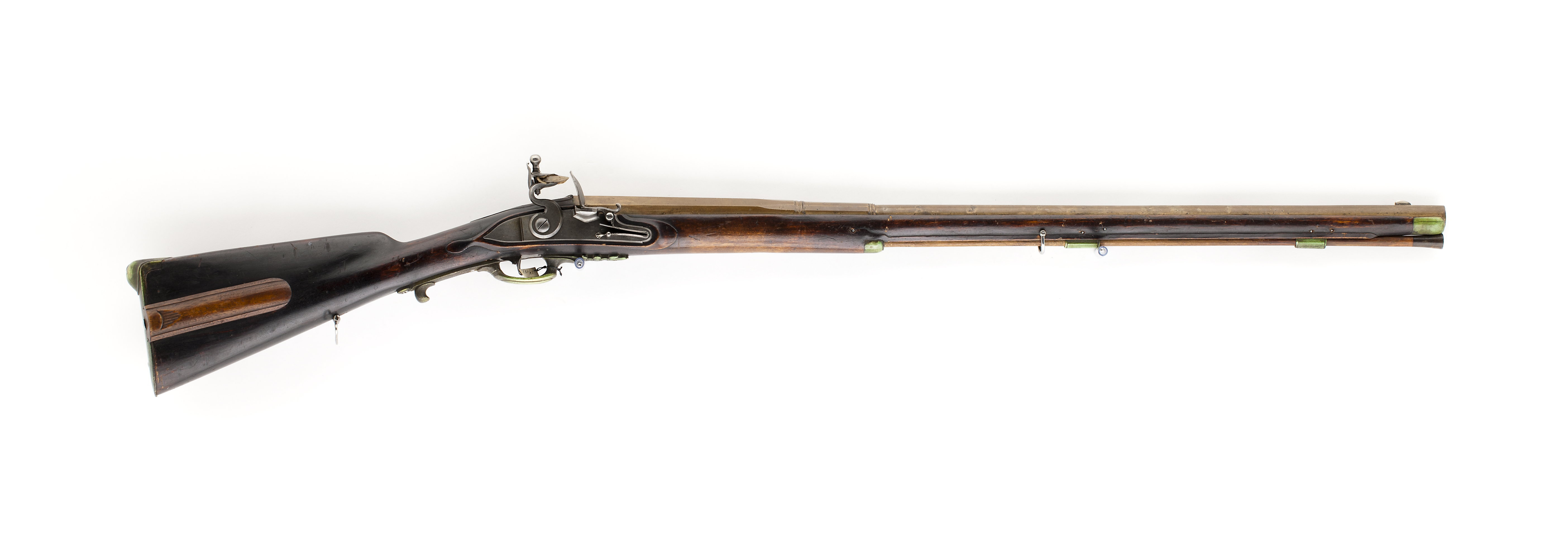 Rund, slätborrad, tunnväggig pipa av brons (malm), kammare med kantig ovansida och rundad undersida, kanterna framtill fasade och därframför ett mångsidigt övergångsparti, vid övergångarna svarvade ringar. Kraftig svansskruv av stål med rektangulärt svansskruvblad med rundat ändblad. Riktmedel: Vid pipbasen en låg klack med skålat sikte. Spolformigt korn av silver. Fästning: Tre häften av stål, pipan fäst med krysskruv, bakre låsskruven i hak i svansskruvplattan, två pipstift av stål och däremellan främre rembygelns skruv. Flintlås av stål, plant låsbleck med fasade kanter och försänkt bakspets. S-formig, platt hane med fasade kanter, hanskruv med välvt huvud. Ovala käkar, överkäken lös, käkskruv med kulformigt huvud. Kantig fängpanna med skålad fals. Batteri med plant fängpannelock med fasade kanter, åsat eldstål med droppformig fasning upptill, uppsvängd fot med fasade kanter, batterifjäder med fasade kanter, litet, droppformig fjäderlöv med skada i nederkanten. Blånerad nöt, gulanlöpt avtryckarstång. Fästning: Två låsskruvar. Kort, böjd avtryckare. Konturerat avtryckarbleck av stål. Helstock av mörkt brunbetsad valnöt (?) kolv med kindstöd och kolvlåda, enkel, snidad dekor vid kindstödets framände, vid bakänden ristad volut. Kolvlåda med lock av ljusare trä, kantlister. Beslag av grönfärgat horn, kolvkappa med kort flik på kolvryggen, rundad ände, näsband och två kantiga rörkor, rundad spetsrörka, varbygel med profilerad främre arm, låg relief, låg bygel med mittlist, bakre arm med c-formigt fingerstöd vid bakänden. Helt sidbleck av brons, plant med svagt fasade kanter.På stockens undersidan rembyglar av stål, den bakre bakom varbygeln, den främre mitt på framstocken. Tillbehör: Flinta i lädermantel, laddstock av trä, L: 804 mm, framtill skodd med horn, l: 28 mm.