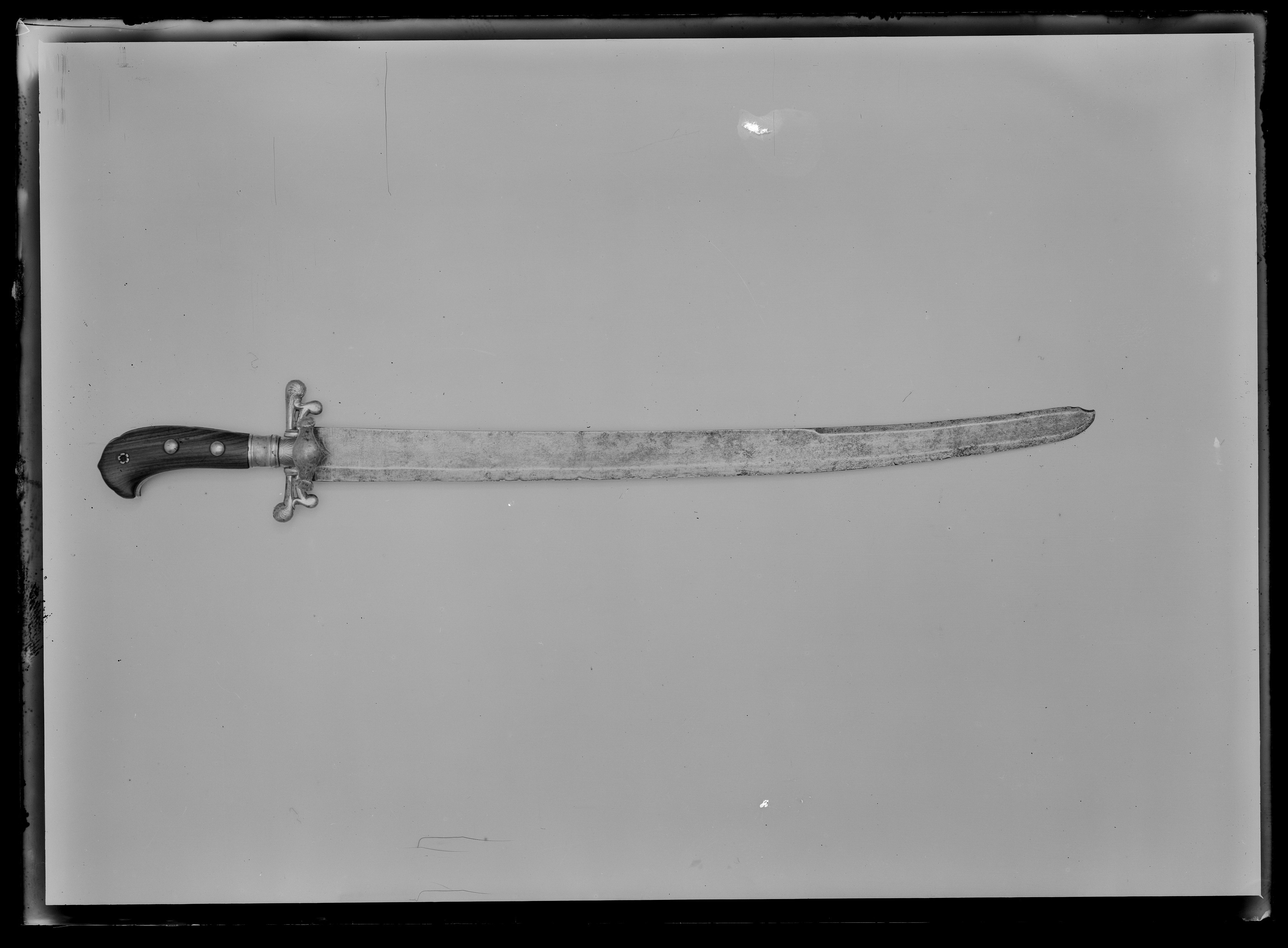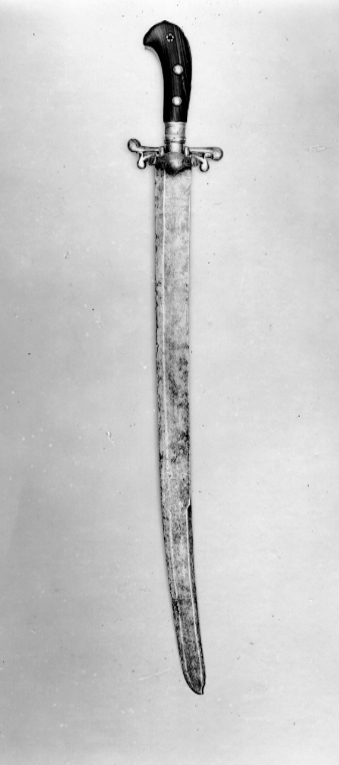 Fäste bestående av två plattor av brunt trä, kantade runtom med skena av mässing. Kaveln upptill konturerad och näbbformigt utdragen framåt. Svagt S-formade parerstänger med rundade ytterändar och punsad dekor. Nedanför dessa mindre, nedåtböjda parerstänger. Horisontell, liten parerplåt med vertikal, vågformad kant med inrullade ytterändar. Svagt punsad dekor på krysset. Plattorna fästade med tre genomgående nitar med runda huvuden på var sida av förgylld mässing. Klinga svagt böjd, eneggad med tvåeggat spetsparti, plan klingrygg. Utmed ryggsidan en hålkäl. Vid klingbasen prickpunsad dekor med krönt A F åtföljt ovanför och nedanför av rankornament. Gåva av hovkamrer Arvid Berghmans dödsbo 1962-06-20. Tidigare i John Ewerlöfs samling, LRK U 1321, inlämnad för undersökning och konservering 1930-09-04.