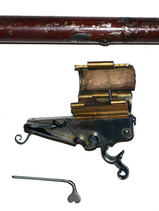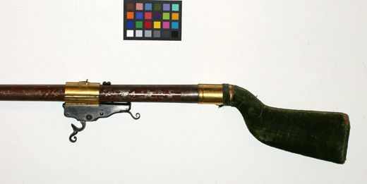 Brunmålad pipa av stål med loppet invändigt klätt med mässing, piptjocklek: 4 mm, diameter 19,8 mm. Baktill på pipan en fyrsidig, invändigt gängad mutter med öppning in till loppet (?). 172 mm från pipbasen på undersidan en iskruvad ventil med välvt huvud med skruvskåra. Riktmedel: Inlaxat ståndsikte på bakre pipbandet, stolpkorn på 8 mm brett, svagt välvt band runt pipan 12 mm från mynningen. Runt pipan vid ventilen fäst ett 48 mm brett mässingsband i två halvor med gångjärn på v sida och låsning med stålsprint på h, sprinten med hjärtformigt grepp. På bandets undersida fäst lås av stål i form av två skivor med konturerad nederkant och däremellan fäst hane, stång, stångfjäder och avtryckare. Hanen s-formigt svängd med en käke och därpå s-formigt svängt grepp med fasade kanter, avtryckaren likaså s-formigt svängd med inrullad ände. På låsets v. sida fäst komma-formig nöt och uppåt verkande slagfjäder. Hanen påverkar ventilstång på pipbandets insida som får in i ventilen på pipan. Mellan band och pipa packningar av textil i flera lager. Pipan inskruvad i mässingsband, l: 47 mm med 7 mm bred profilerad list framtill. Bandet baktill instucket i kolv av trä och fäst med två spikar. Kolven utvändigt helt klädd med grön sammet. Tillbehör: Laddstock av trä, l: 718 mm, framtill skodd med horn, l: 18 mm, framtill skiva med större diameter än stockens.