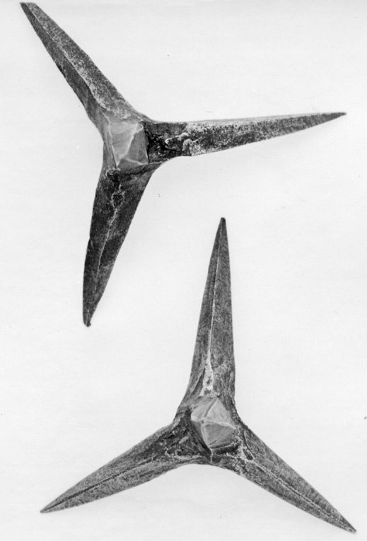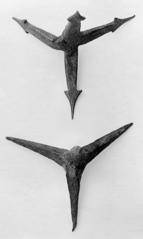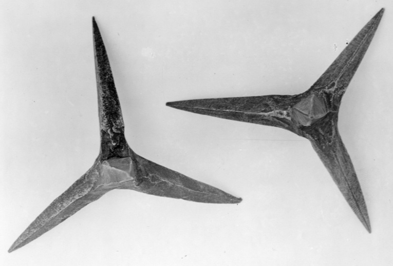Fotangel av stål med fyra utåt avsmalnande, grovsmidda spetsar, ca 35 mm långa.