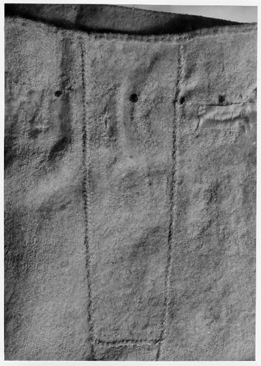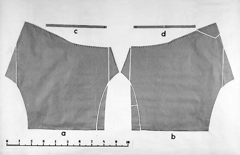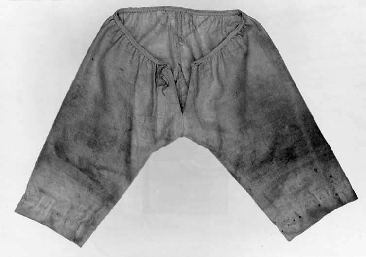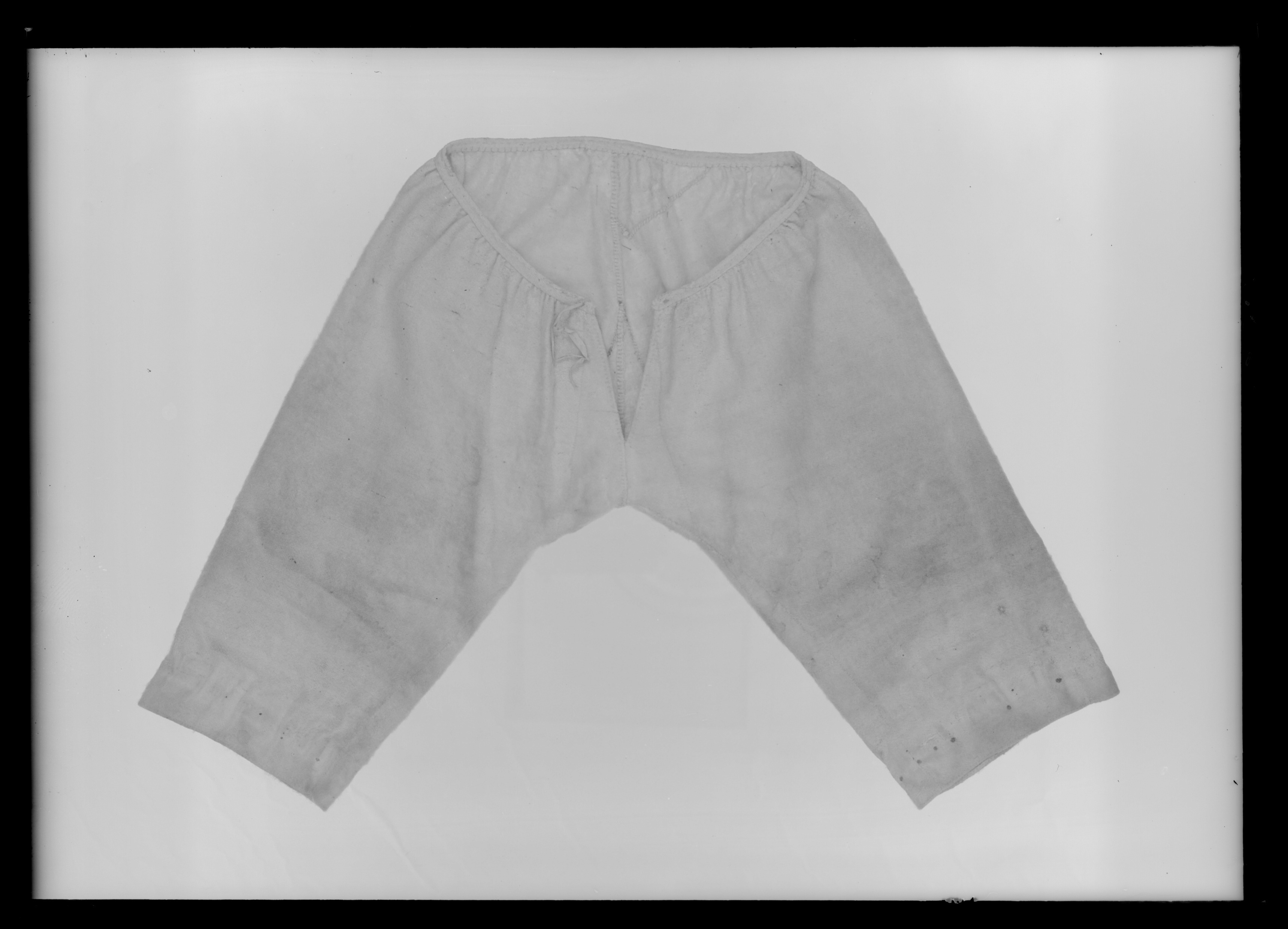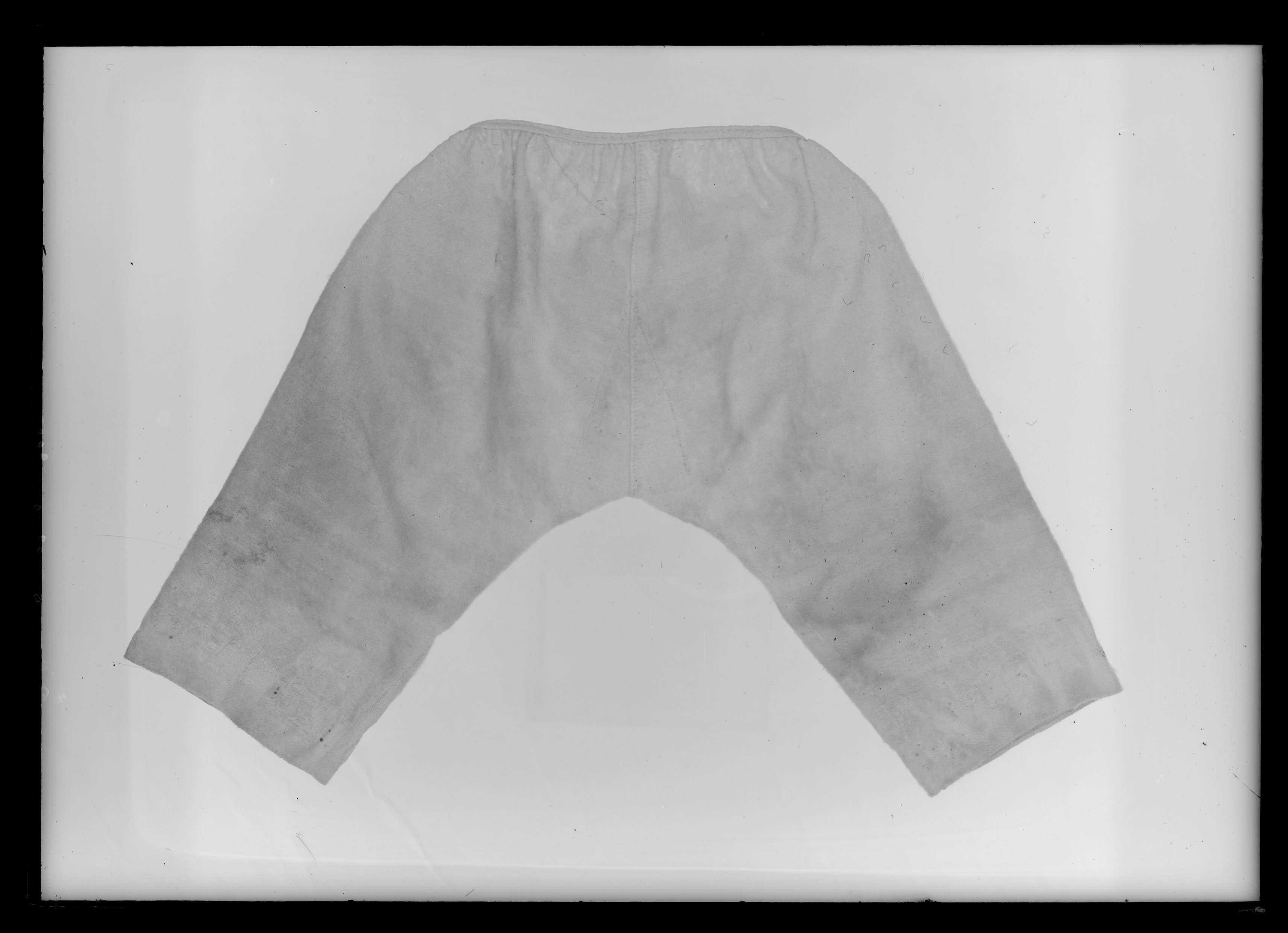 Byxor av vitt vadmal, rynkade i midjan samt med en 15 mm bred linning. Raka ben sydda i två stycken. Grenkil. Knäppes fram med två hål samt snöre i skinn, 10 mm brett i ena änden, 5 mm brett i andra. Sprund mitt fram, 170 mm långt. Infälld kil på högra bakstycket, vid mittsömmen mot linningen, bredd: 110 mm, höjd: 100 mm. Dräkten syddes, tillsammans med tre andra dräkter, på 1750-talet till Ornässtugans museum i Torsångs församling, Dalarna, där Gustav Vasa skulle ha övernattat. Skräddarmästare var Erik Säterbeck, uppdragsgivare var ägaren Jakob Brandberg. Materialet levererades av provisor Nils Fahlbeck, Falun. Den var utställd fram till 1950-talet då dräkterna plockades ner för konservering i Livrustkammarens konserveringsateljé och ersattes av kopior.