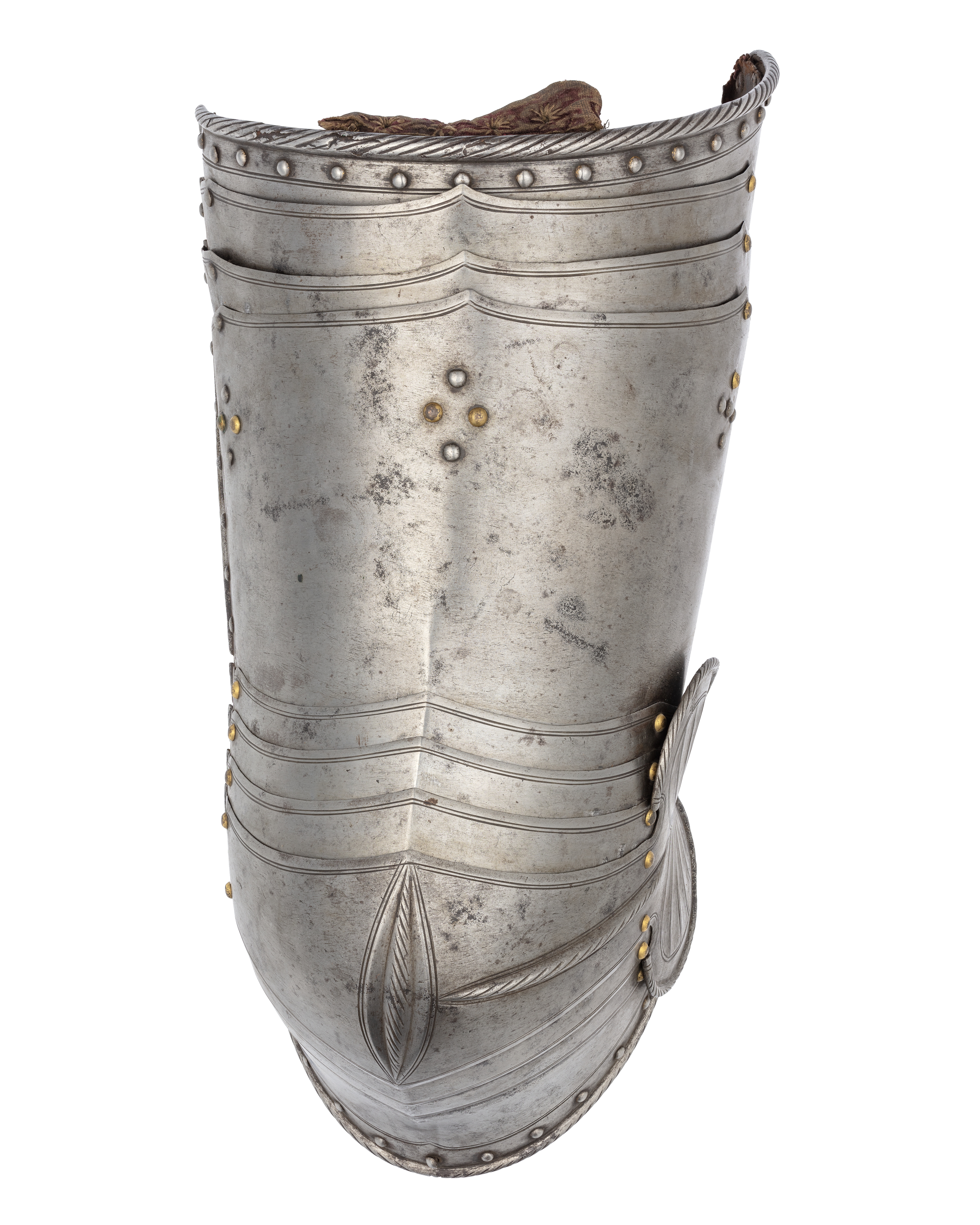 TILLÄGG. Längs musslans överkant samt på den översta skenans yttre hörn återfinns en stämpel med ett "M" följt av en krönt sköld med tre fleur de lys och sedan ett "P". Knäledens nitar är alla utbytta under 1900-talet till kopparnitar med guldfärgad yta. Det har också suttit ett en rem för att spänna fast lårpansaret vid knävecket. I jämförelse med 23120 framstår denna lårskena som hårt polerad och saknar all tidigare blånnering. Den utgör däremot ett par med 23120. Den utmed överkanten på den översta skenan nitade läderremmen bär spår efter stygn. Profilerna på skenornas överkanter är samstämmiga med axelstyckena inv.nr. 23164 och inv.nr. 23170 samt bukskena inv.nr. 22912.