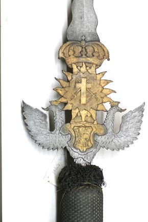Klinga av stål med punsad och snidad dekor. Vingar i form av polsk dubbelörn med förgyllda kronor och tungor. Mellan vingarna vapensköld, kvadrerad. Polens och Litauens vapen, vapenskölden förgylld. Därovanför strålande, snidad sol, förgylld, med punsat mittparti varpå kors över korsade svärd. Ovanför solen kunglig krona, förgylld, snidad med punsad botten och punsade detaljer. Ovanför kronan flammig stålklinga, L: 233 mm, med mittås. Vid det flammade klingbladets bas punsad streckdekor. Båda sidor lika. Holk saknas. Klingan nedskruvad i skaftet. Runt skaft av brunbetsat trä med fastnitade stålskenor och konisk doppsko av stål, L: 92 mm. Kvast, L: 325 mm, bestående av knopp av trä, L: 107 mm, b: 77 mm med övre krans av snoddar av blått silke, ursprungligen lila silke och guldtrådar. Knoppen täckt av blå ursprungligen lila silkestrådar och däröver nät av guldtrådar. Frans av blå ursprungligen lila snoddar med knutar nära ändarna och ett mindre antal guldtrådar från nätet likaledes knutna.