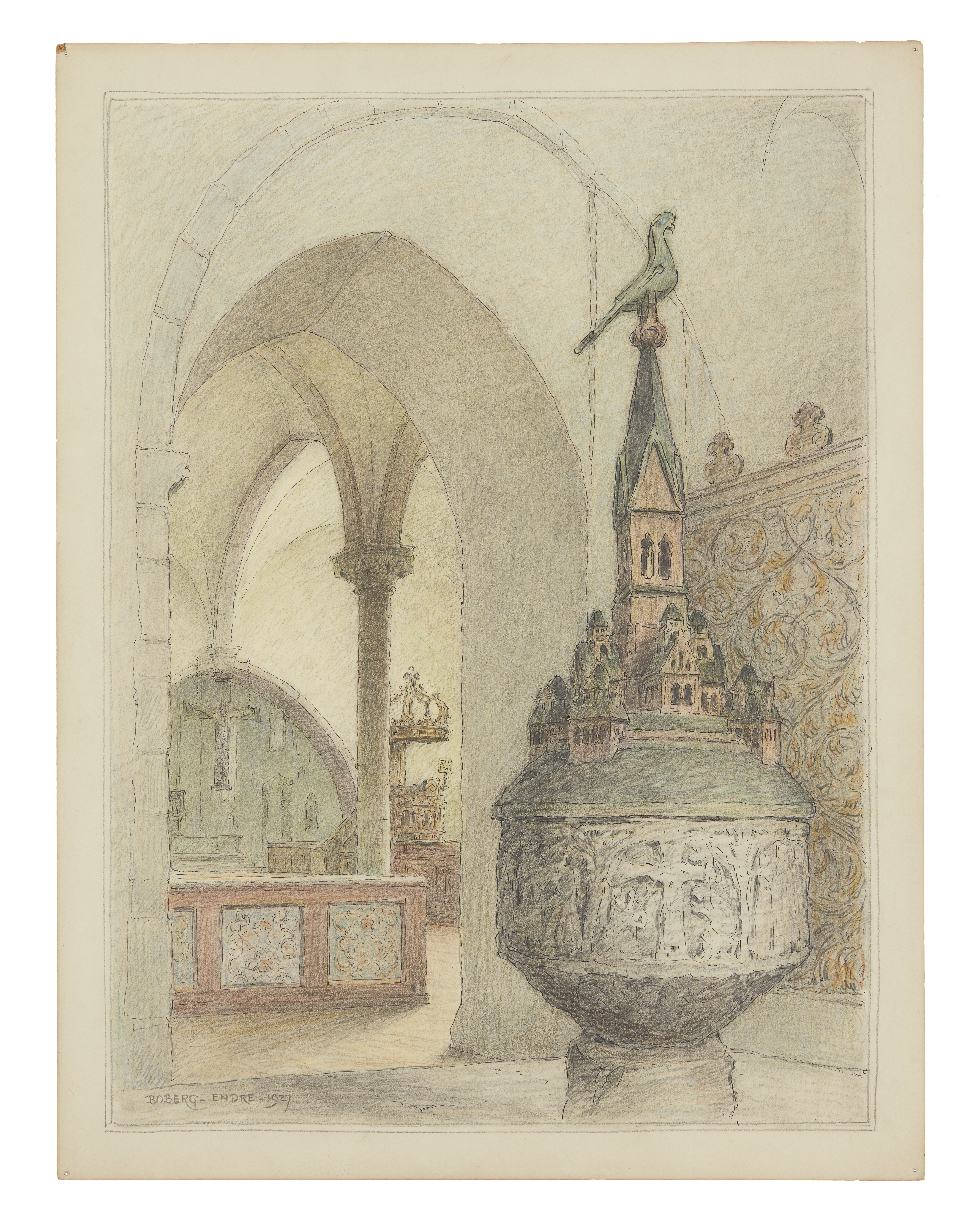 Endre, Gotland, 1927. Ferdinand Bobergs avbildningar av svenska kyrkointeriörer utförda i kol och färg av F. Boberg, ramade i förgyllda trälister (535x420 mm)