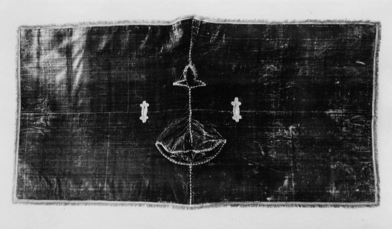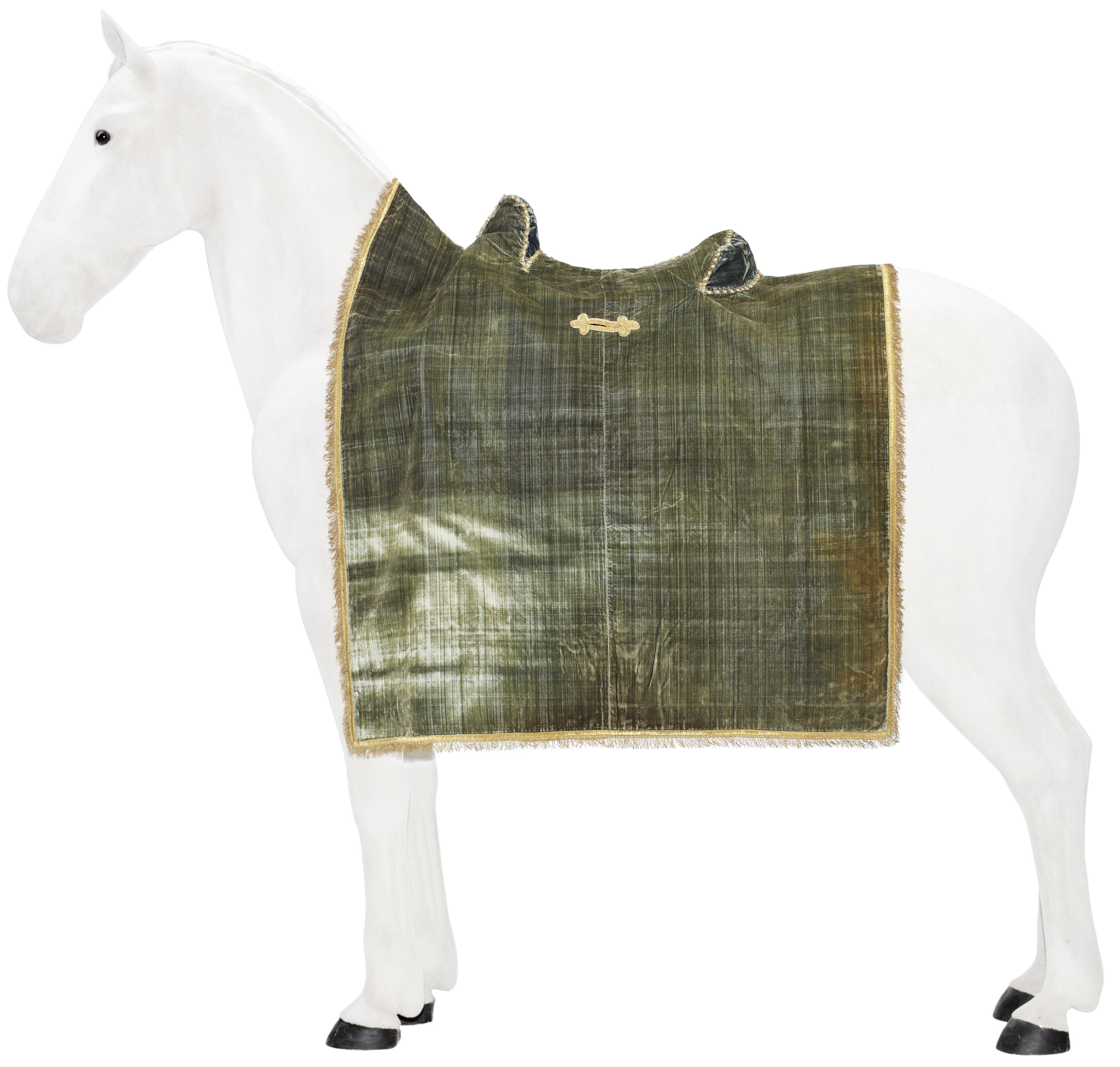 Sadeltäcke av blå (numera blekt grön sammet) i fyra våder kantat med guldfrans fodrat med gult siden och mellanliggande foder av tuskaftat rosa linne. Utmed mitten samt runt formsyningarna för sadelns bommar rullfrans med omväxlande naturfärgat silke och guldtråd. Utsidan av bakbommen och insidan av frambommen blå (ej blekt). Ca 260 mm från mittbården smala hål kantade med guldgalon vid ändarna formade till klöverblad. (Hålen för stigläder) Gåva 1650 tillsammans med en blå bärstol till drottning Kristina från Johan IV Portugal, överlämnad av ambassadören José Ponto Pereira. (Johan IV, hertig av Braganca frigjorde 1640 Portugal från Spanien)