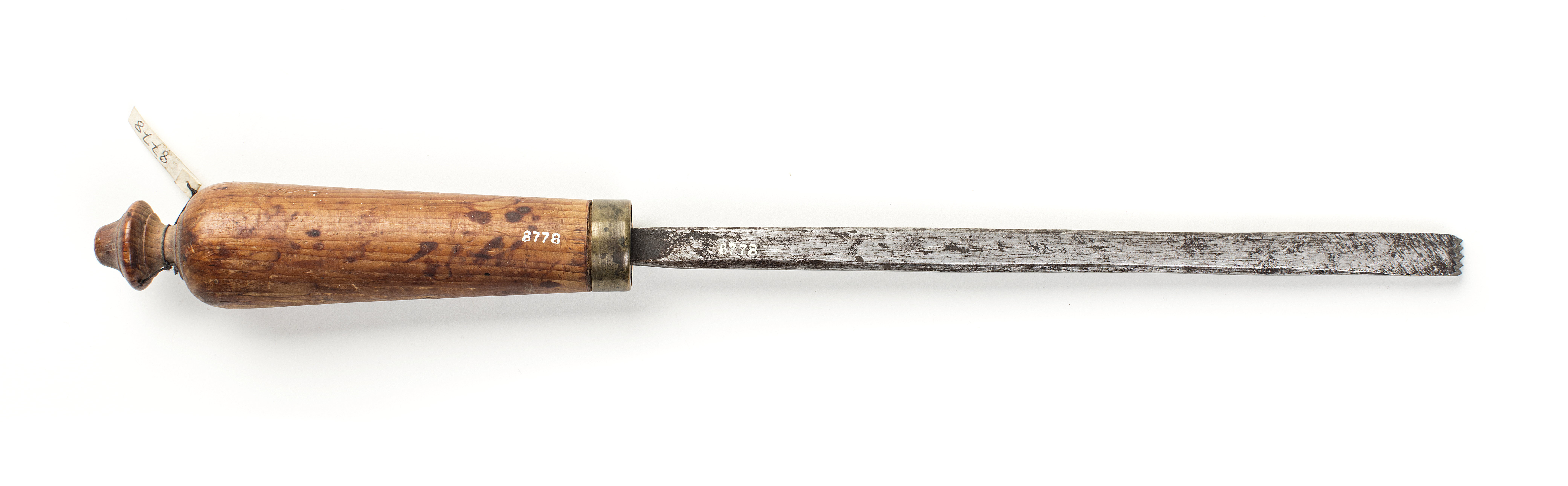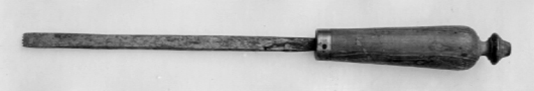 L: 325 mm, skaftl: 127 mm, d: 29,9 mm, antal tänder 5 st, stigning: 2 mm. Gängstål för utvändig gänga. Klinga med fyrsidigt tvärsnitt med avskurna hörn. Svarvat, koniskt skaft, avslutat med en flat, profilerad knopp. Fästet är skott med en mässingsring, dekorerad med två svarvade ringar. Tureholm