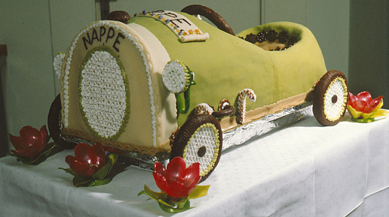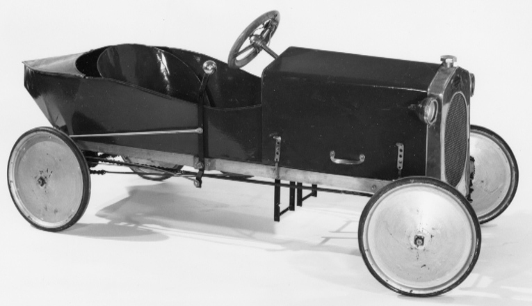 Frankrike eller Belgien ca 1910. Har tillhört dåvarande kronprins Gustaf Adolfs barn, födda 1906-1916. Trampbil med plats för ett barn. Stomme av trä, chassi av grönmålad stålplåt, spetsig baktill, framtill rakt avslutad med blank kylare, oval grill samt därovanför firmamärke, rektangel med stora, runda utbuktningar på långsidorna och mindre på kortsidorna, text: "EUREKA" samt i övre v. hörnet: "L.I.N.", i högra: "K.B.", i nedre vänstra "BRE.TE", i nedre högra: "S.G.D.G.". I de stora utbuktningarna rankornament. Låtsaslock för kylarvattentank, två runda strålkastare med lampor, dynamo bakom kylargrillen. På vardera sidan om den avlyftbara motorhuven ett handtag samt två fjäderspännare. Invändigt brunmålad, stoppat säte klätt med vaxduk, rundat ryggstöd av plåt. Ratt och instrumentbräda av trä. Fyra silverbronsmålade hjul med gummiskoning, dito reservhjul på v. sida. Broms på h. sida. Hjulaxlar med fjädring.