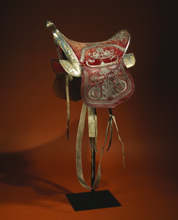 Framvalvet utformat med snett uppåtriktat horn. Sätet klätt med röd sammet och broderat med silvertråd i plattsömsteknik, motiv med palmetter och akantusblad i orientalisk stil. Kåpor av rött läder, något lökformiga samt med broderade silverblommor i läggsöms- och plattsömsteknik. Stommens synliga delar, vid fram- och bakvalv är helt silverbeslagna samt har små kartuscher med förgylld och graverad dekor. Sätets invändiga längd: 430 mm. Hela sadeln invändigt klädd med rött ylletyg. Kåporna fodrade med brunt läder. På stommens vardera sida finns vita läderstroppar och remmar. Tillbehör. Sadelgjord i vitt läder med spänne av stål.
