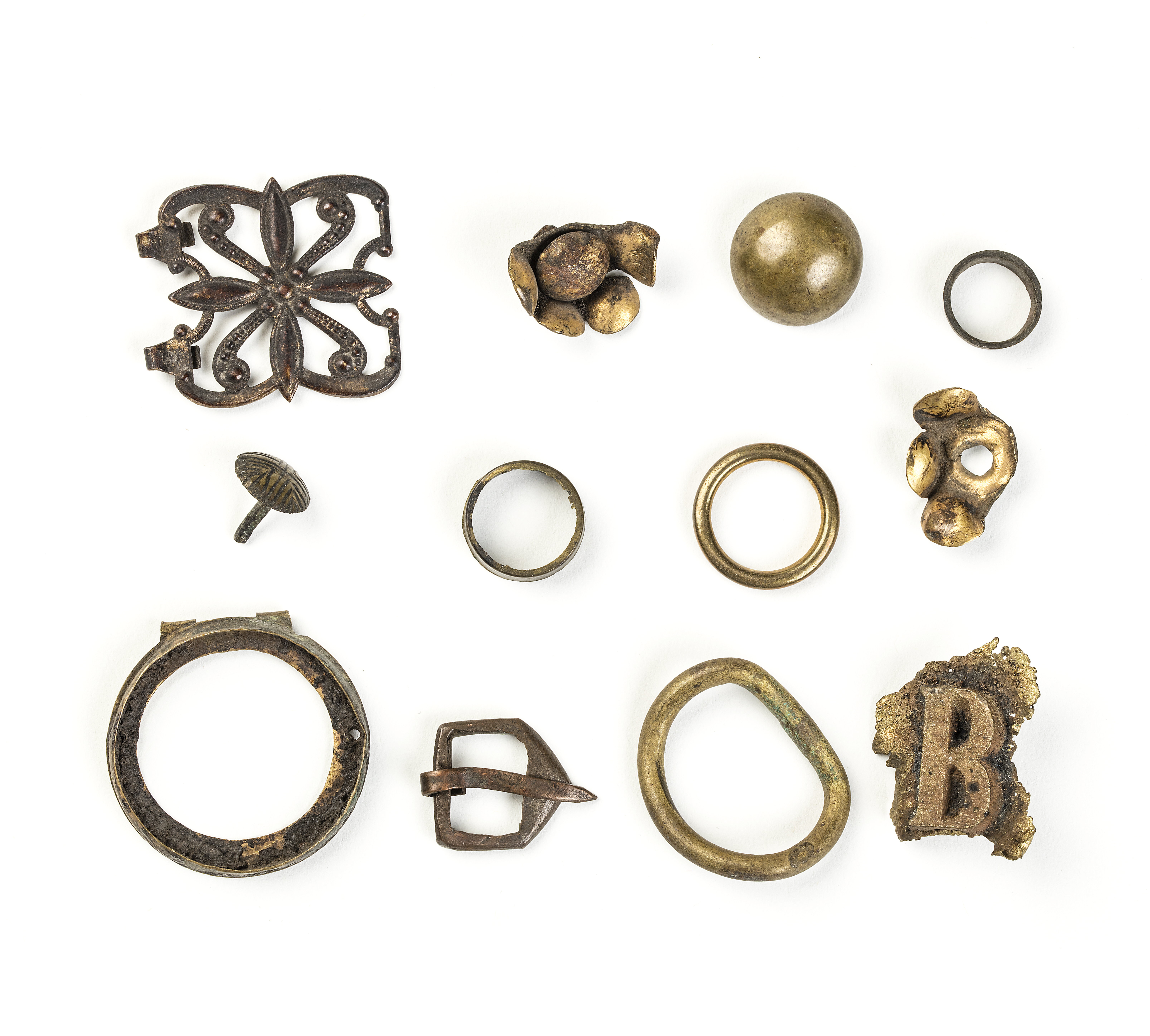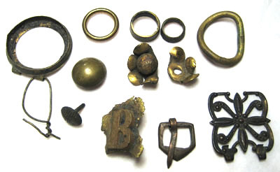 *Fyra ringar varav en deformerad. *Två fragment av blomformig dekornit. *Välvd och slät knapp. *Nit med skuren dekor av linjer i korsform. *Mindre spänne av koppar. *Boettliknande ring med rester av lim och två fästen med genomdragen metalltråd. *Ornament, genombrutet likt fyrbladig blomma med fyra armar, rester av förgyllning. *Fragment av mässingsplåt med bokstaven B i relief.