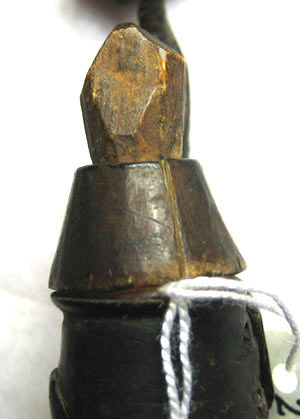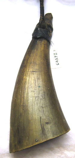 Kruthorn av ett lätt svängt stycke gulaktigt horn, uppåt avsmalnande med ovalt tvärsnitt. Upptill en rund pip, l 11 mm, formad konisk med nedre kanten utskjutande från hornet likt en krage. Under pipen ett lindat svart läderband, l ca 50 mm, fäst i kruttyget. I pipen en 45 mm lång kork, tillskuren i trä. Nertill en platt bottenplatta av brunfärgat trä, fäst genom hornets sidor med fyra mässingsstift.