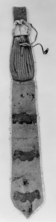 Flaskläder av ljust sämskat skinn, kantat och fodrat med vitt skinn, av utdraget koniskform, i den bredare änden spetsigt avslutad. Vid den smalare delen kulpung, rynkad upptill med smal dragsko av vitt läder med i enaänden två svarta kulor av litet hjärtformigt lock. På den bredare delen tre tvärgående konturerade stålbeslag med etsad enkel rankdekor.Fästade vardera med två nitar.