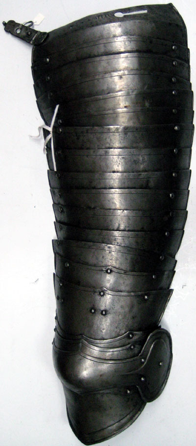 Stålblank stålplåt, insidan svartbrun, om 20 välvda skenor fästa i omlott med nitar i förlängda nithål och tre läderband på insidan. Närmast rektangulär till formen, avsmalnande nedåt med tillspetsad nederkant. Ytterkanten och innerkanten omvikt och rundsmidd. Skenorna (4 o 5) nedifrån har kantlinjer. De övriga har bara kantlinje i överkant. Översta skenan har nyckelhålshål och en gångjärnsförsedd fästanordning med regel och hål. Jämte hålet finns en markering i form av 6 vertikala linjer på en rad samt två tomma nithål och tre punsade hål. Översta skenan även invikt på mitten ca 45 grader. Bucklans vinge är närmast ovalformad och har en förhöjd mittyta. Knäspetsen har en försänkt bård. På den 11 skenan uppifrån finns två nithål i form av nyckelhål samt på nr 14 två sidställda nitar på mitten.