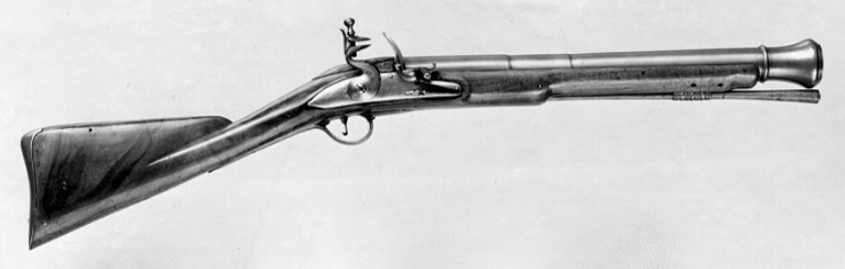 Mässingstrombonpipa, framåt avsmalnande i avsatser 115 och 175 mm från pipbasen, 60 mm från mynningen en profilerad ring. Därframför är pipan vidgad till en trumpetmynning, ansvälld till en rundad vulst ca 10 mm från mynningen. Vid pipbasen på ovansidan ett profilerat band. På v. sida stämplar: två ovala stämplar London View och London Proof (krönt V och krönt GP), däremellan en delvis utplånad stämpel: R W och däröver en sexuddig stjärna (JAAS I sid. 128 nr 36). Svansskruv av stål, svagt böjt svansskruvblad med vinkelformig bakände. Fästning: Två häften. Pipan fäst med krysskruv underifrån samt ett pipstift av stål. Flintlås av stål med slätt, välvd låsbleck, framför hanen graverad signatur: "Wilson". S-formig,välvd hane, ovala käkar, spetsoval, bred hangren, käkskruv med päronformigt huvud. Rundad fängpanna med fals, batteri med välvt fängpannelock och åsat eldstål, svagt uppåtböjd häl. Batterifjäder med litet, rundat fjäderlöv. Avtryckarstång, nöt(?) och nötstudel svärtade. Fästning: Liten, s-formigt svängd avtryckare. Helstock av valnöt med enkel, snidad kant runt svansskruvbladet. Beslag av mässing. Bakplåt med flik avsmalnande framåt i avsatser, vinkelformig ände. Genombrutet sidbleck i form av en trofégrupp med rokoko-sköld, fanor, kanon, trumpet och sabel. En kraftigt profilerad rörka. Slät varbygel med rundade armar, små ändkulor. Tillbehör: Laddstock av trä, l: 420 mm, kraftigt ansvälld i ena änden, välvt ändbeslag av mässing. I andra änden en fast krats av stål, fäst med rörformigt stålbeslag, l: 70 mm.