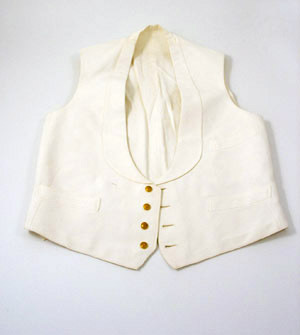 Fr. Kaedings Eftr., Stockholm, ca 1940-tal. Väst av vit bomullspiké med sjalkrage och tre fickor. Knäppning fram med fyra kullriga knappar i gul metall, med emblem: "SSS" krönt av en sluten krona, 12 mm i diam. Bakstycke av bomull, med spänntamp. På ena spänntampen finns ett knapphål och en bomullsklädd knapp på insidan, 11 mm i diam. Foder av bomull.