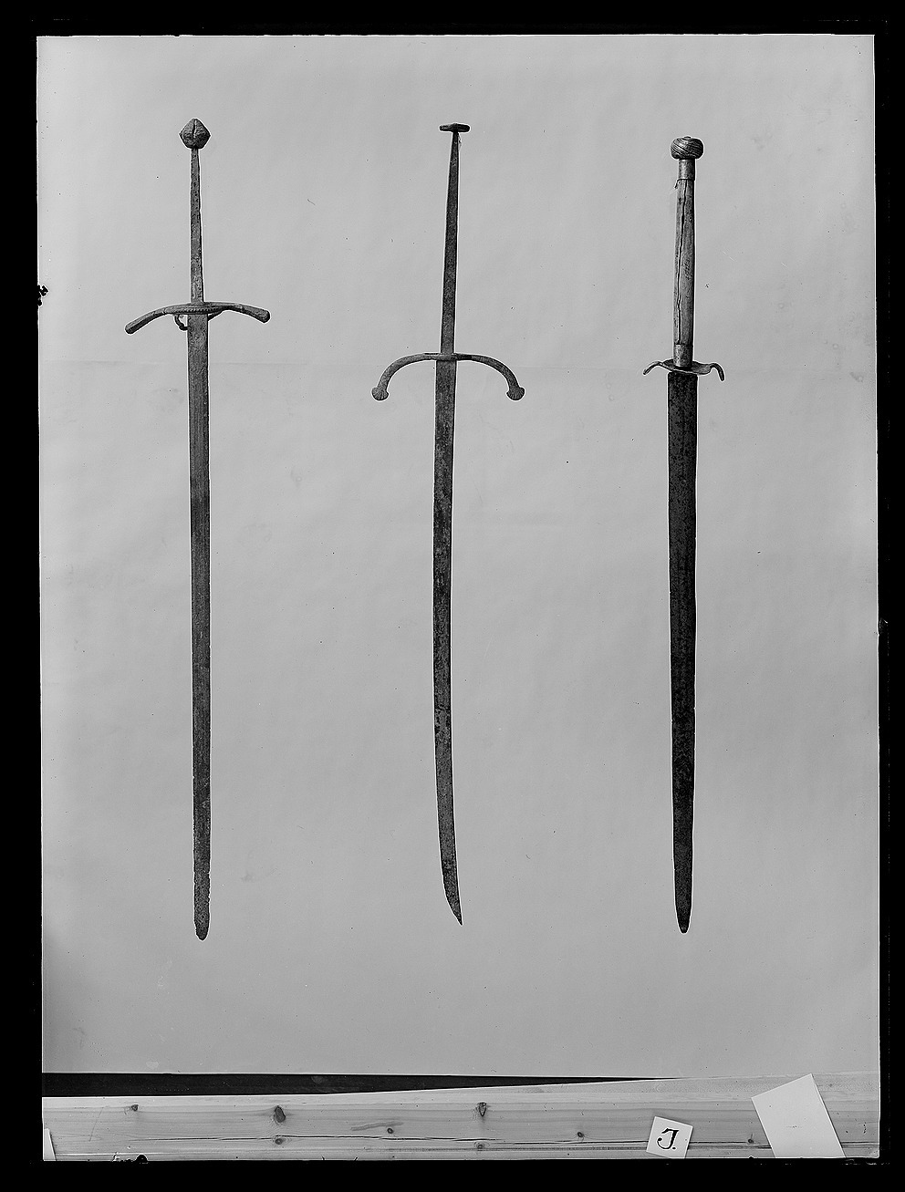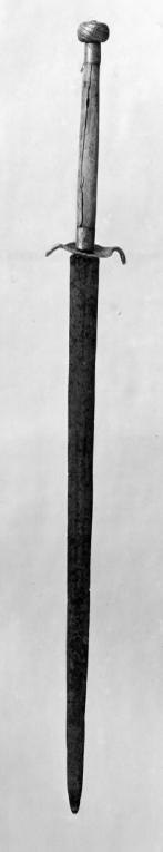 Fäste med stålbeslag. Knapp rund, tryckt i vertikalled, spiralrättlfad, ytan med något skrovlig patina. Parerplåt rundoval, slät, svagt skålad. Parerstänger korta, nedåtböjda, utgående från parerplåtens kant. Kavel av björk, l: 334 mm, upptill och nedtill ett ca 35 mm högt, slätt ringbeslag. Klinga rak, bred, tvåeggad och med spår av längsgående hålkälar. På båda sidor av starka delen tre inslagna tecken med kvarvarande fragment av inhamrad mässing; tecknen delvis påminnande om ett ulvmärke (Passau; här ej som tillverkningsort, endast som en föregiven kvalitetsbeteckning). Fästet en senare komplettering av primitiv karaktär, dock kan knappen vara äldre än fästet i övrigt.