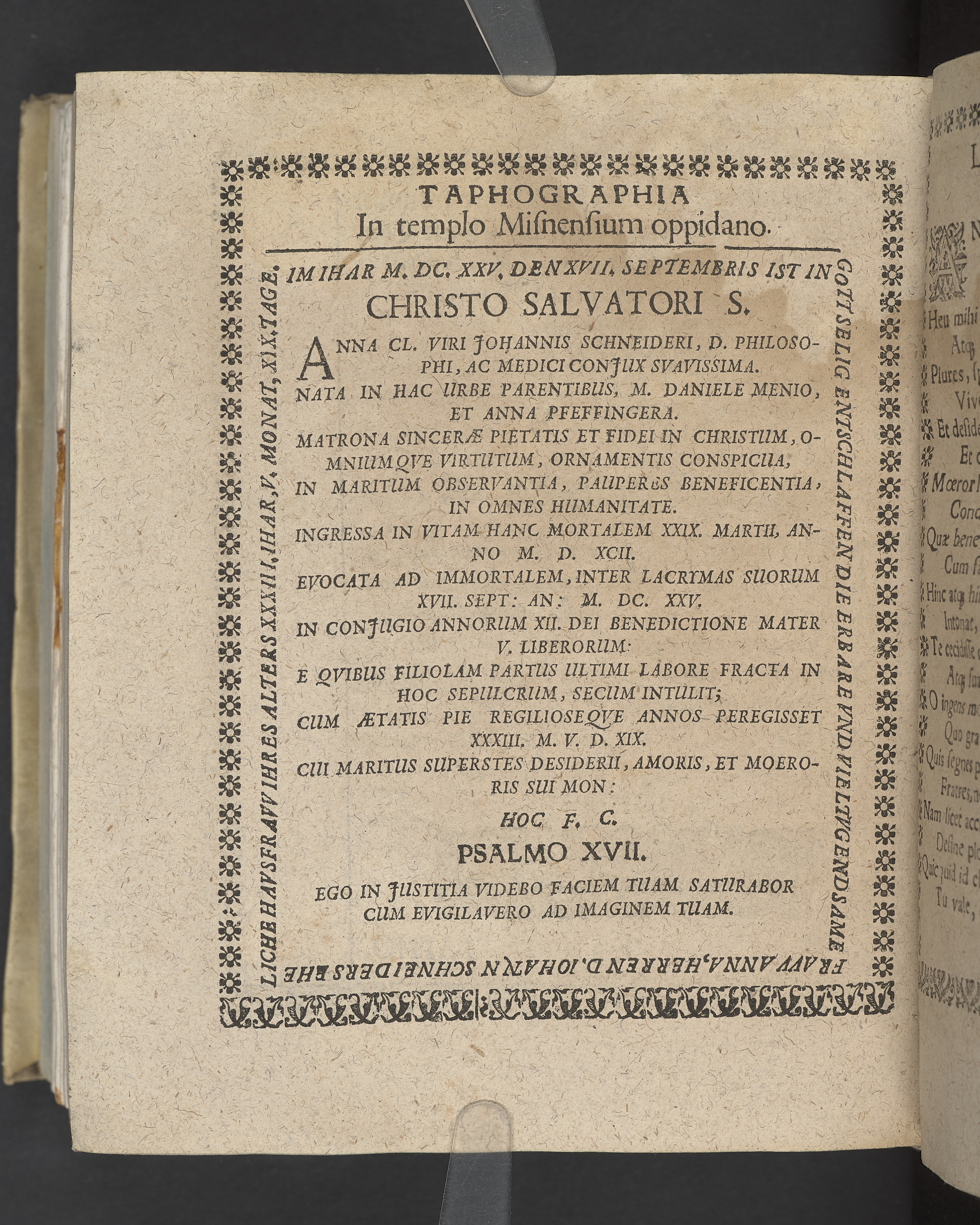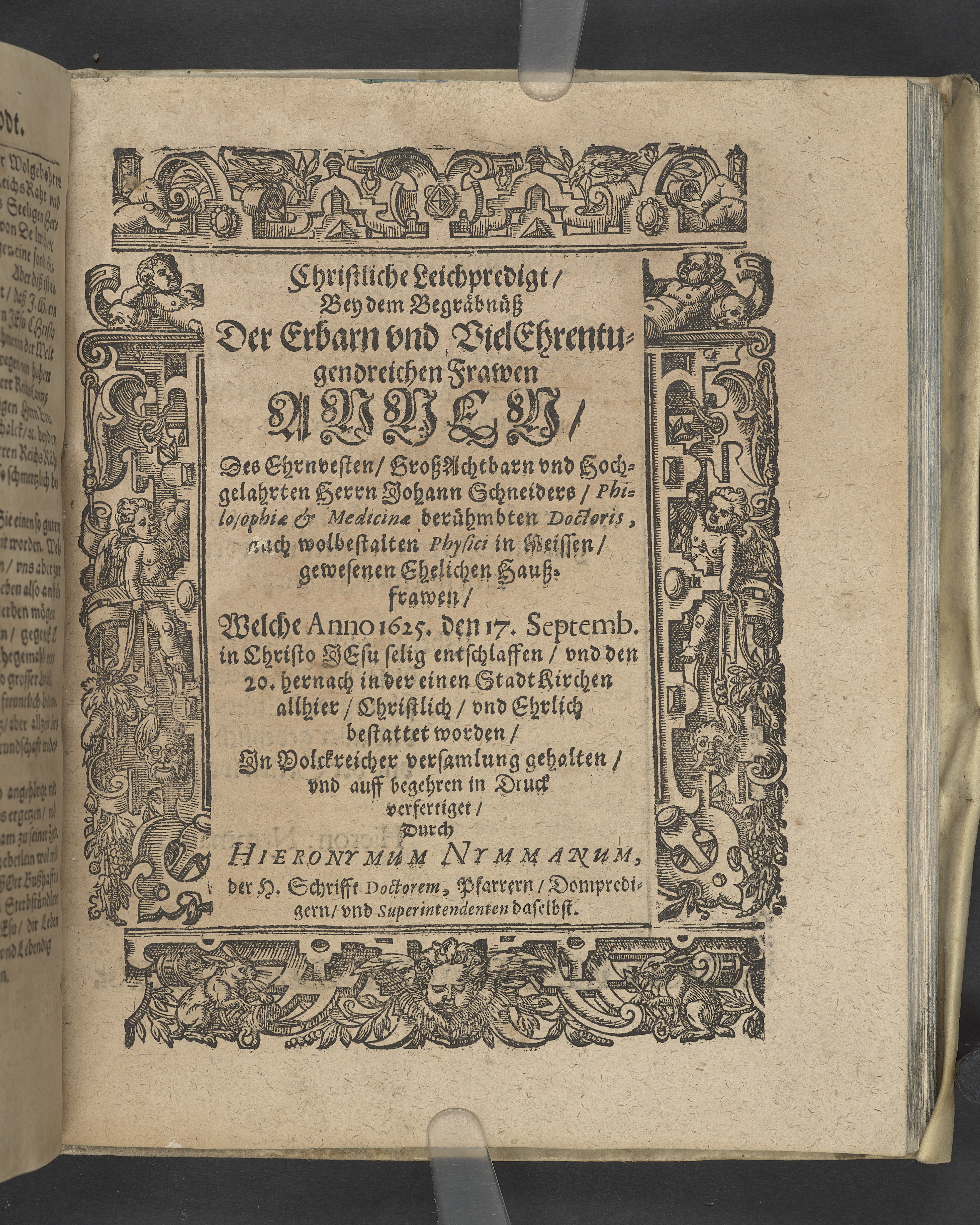 Christliche Leichpredigt, bey dem Begräbnuss der... Frawen Annen, des... Herrn Johann Schneiders... Haussfrawen, welche anno 1625 den 17 septemb... entschlaffen, und den 20. hernach in der einen Stadt Kirchen... bestattet worden...