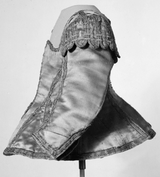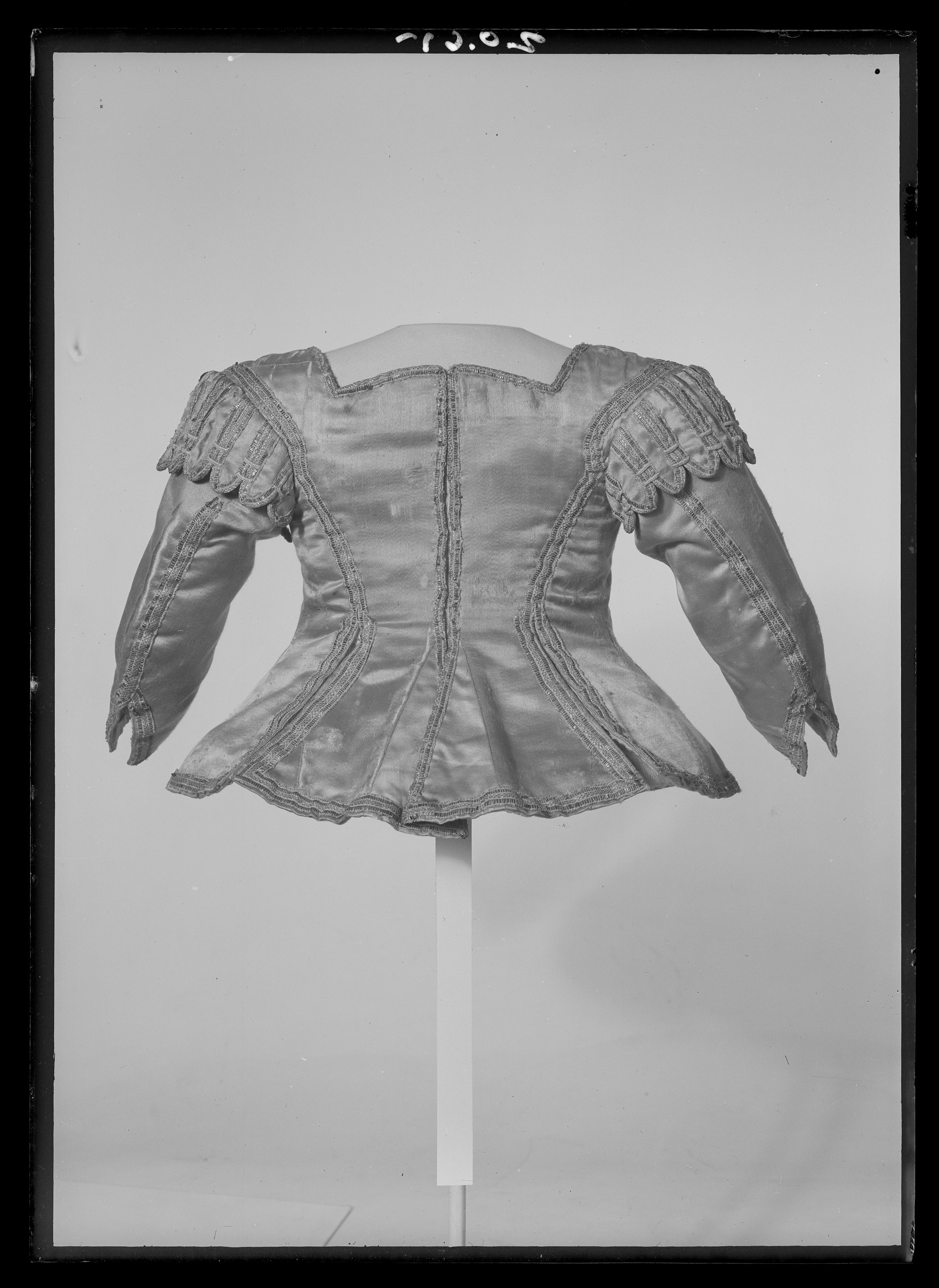 Skörttröja med långa ärmar, sydd av starkrosa, numera mycket blekt sidenatlas. Relativt djup, fyrkantig urringning. Livet öppet bak, där det knöts med fyra sidenband (numera är blott de fastsydda ändarna synliga på baksidan). Insvängt midjeparti med svängda skört, formade genom insydda kilar, 2 fram och 2 bak. Långa ärmar med sprund i större delen av den främre sömmen och sprund för handleden nedtill på den bakre. Över axelpartiet går en i ärmsömmen fastsydd axelkarm med 12 uddformade flikar. Tröjan garneras längs ytterkanter och som markering av snittet med en 11 mm bred silvergalon (med silverlan invävda intill ytterkanterna). Tröjan är på insidan fodrad med vit yllekypert (23 x 23 trådar / cm2). Tröjan har sytts av påfallande många små stycken som skarvats samman. Livet är sytt av 16 delar (8 till varje sida), ärmarna av 5 delar vardera (axelkarmarna inräknade). Över silvergalonen på axeltungorna har sytts 2 och 2 tränsar av vitt silke (l: 10 mm) över inalles 10 av tungorna. Plagget har tillhört fröken Sara Larsdotter (*1608-1689), sedermera gift med assessorn Nils Stiernflycht (1600*-1658). Sara Larsdotter Stiernflycht var kammarjungfru först hos drottning Kristina d.ä., sedan hos drottning Maria Eleonora och har därefter i flera år skött och uppvaktat arvprinsessan, sedermera drottning Kristina (Elgenstierna).