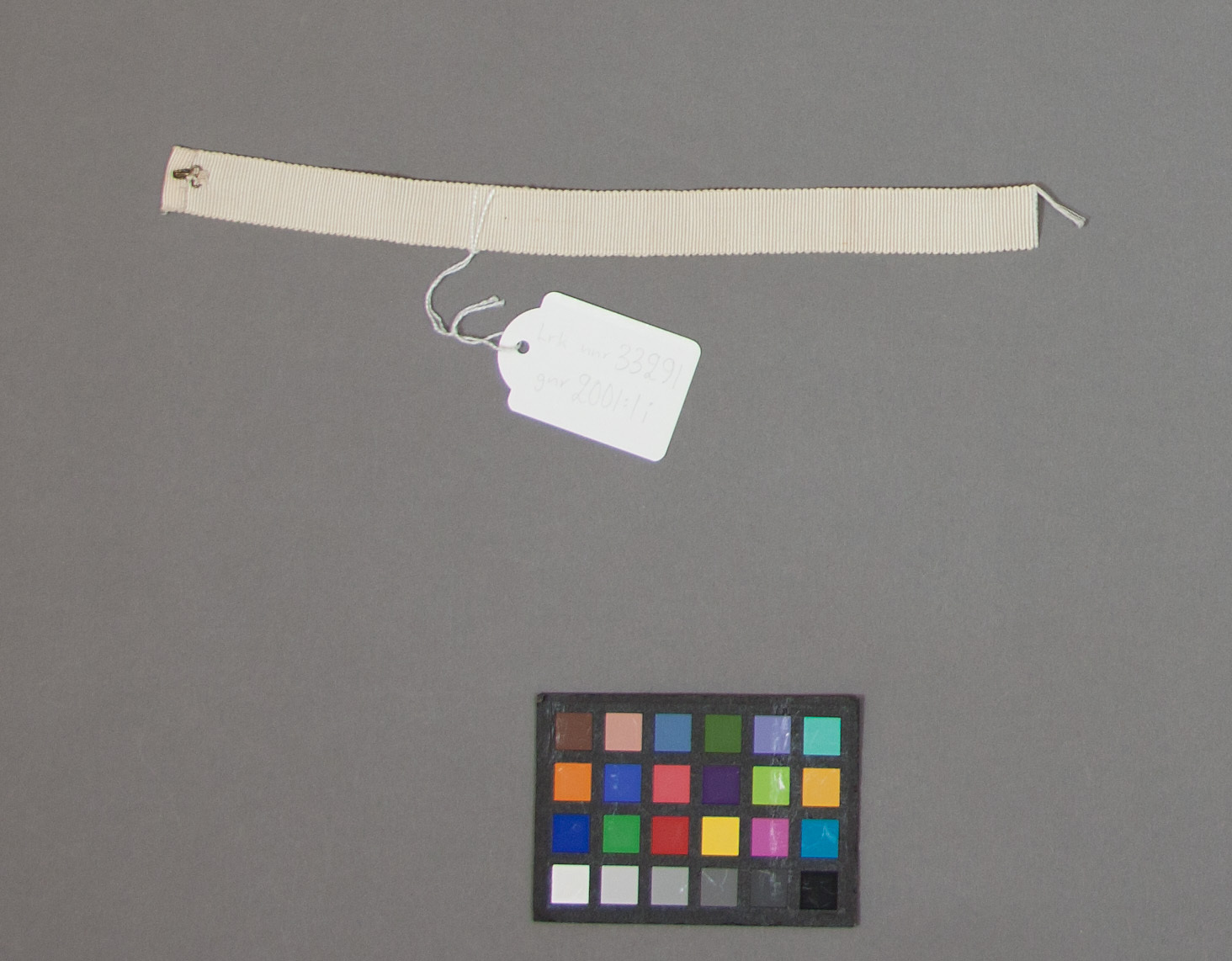 Del av ripsband som ev kan ha suttit upptill på släp nnr 33285. Linningen på släpet saknar en del som ev kan vara denna. Detta band är fållat i ena kortsidan där det sitter en hake.