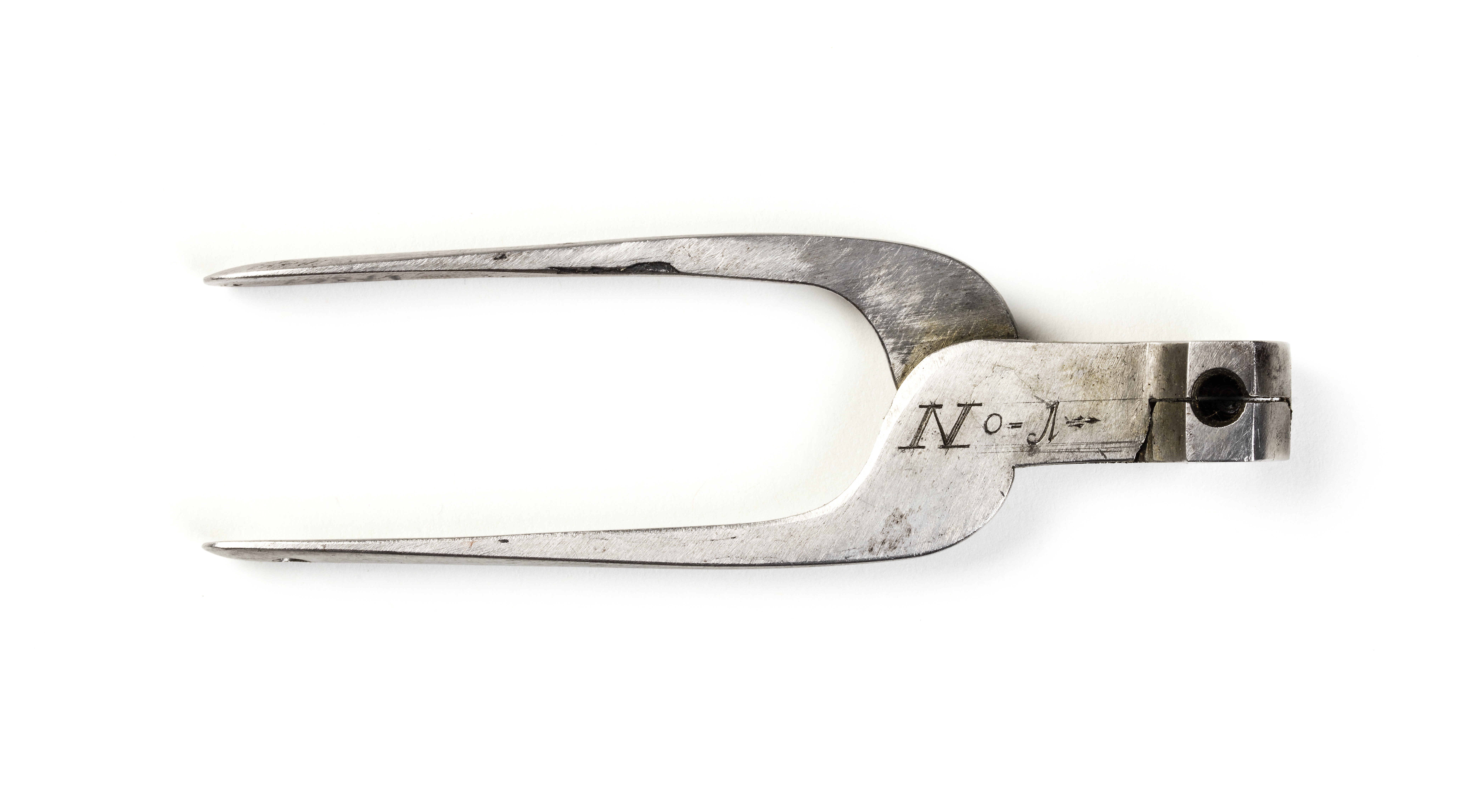 Kultång med bakåt avsmalnande rundade skänklar och cylindriskt gjuthus, kulläge d: 9,4 mm. På ena sidan vid axeln graverat: "No-1". Tureholm