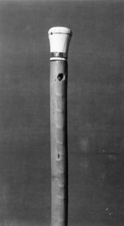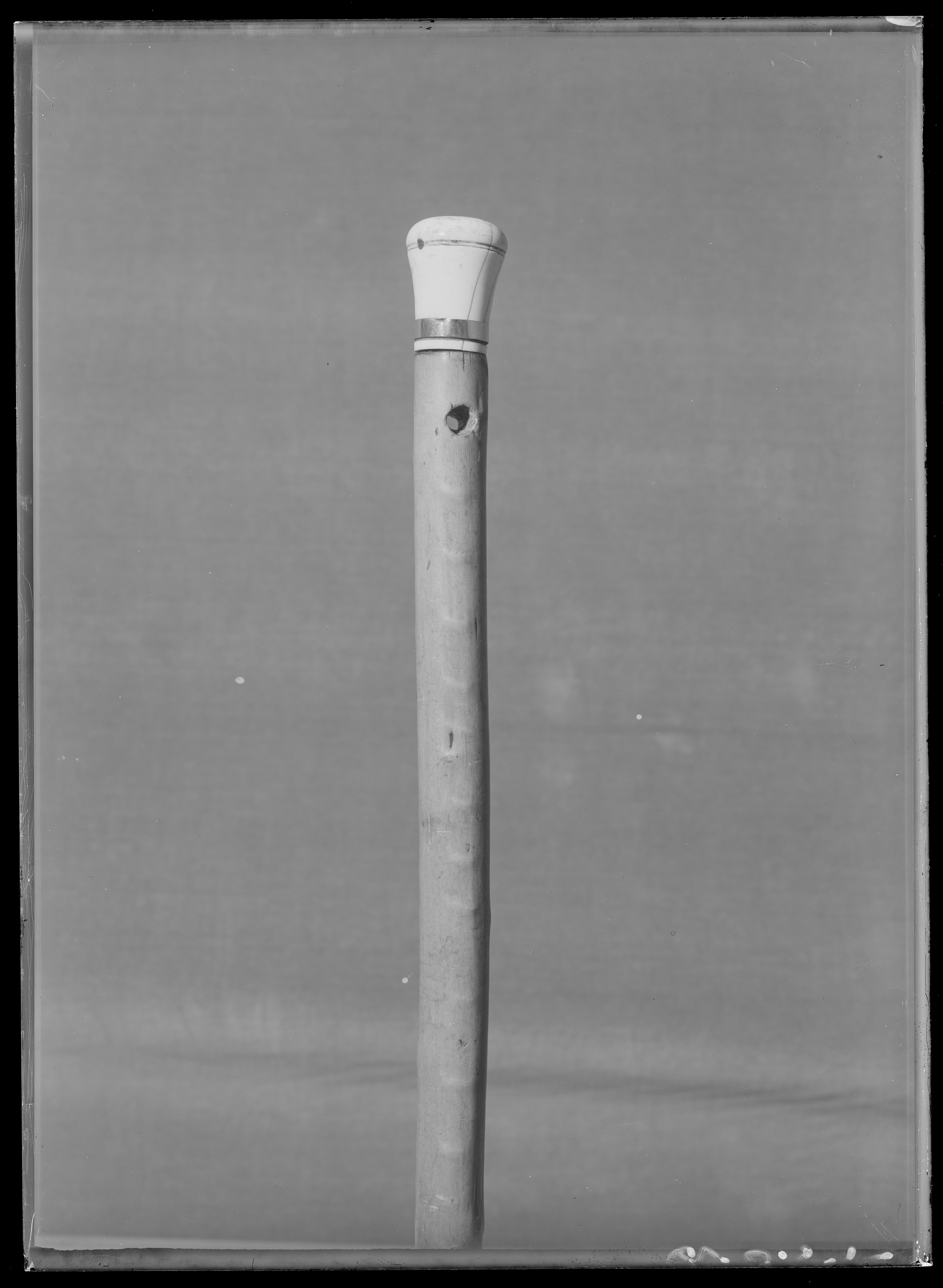 Knopp i två delar av elfenben, h: 44 mm, d: 32,6 mm. Svagt konkava sidor och välvd överdel, med inskuren ring vid nederkanten, fäst med två stålstift. Nedtill en slät guldring, b: 6 mm, h: 67 mm.