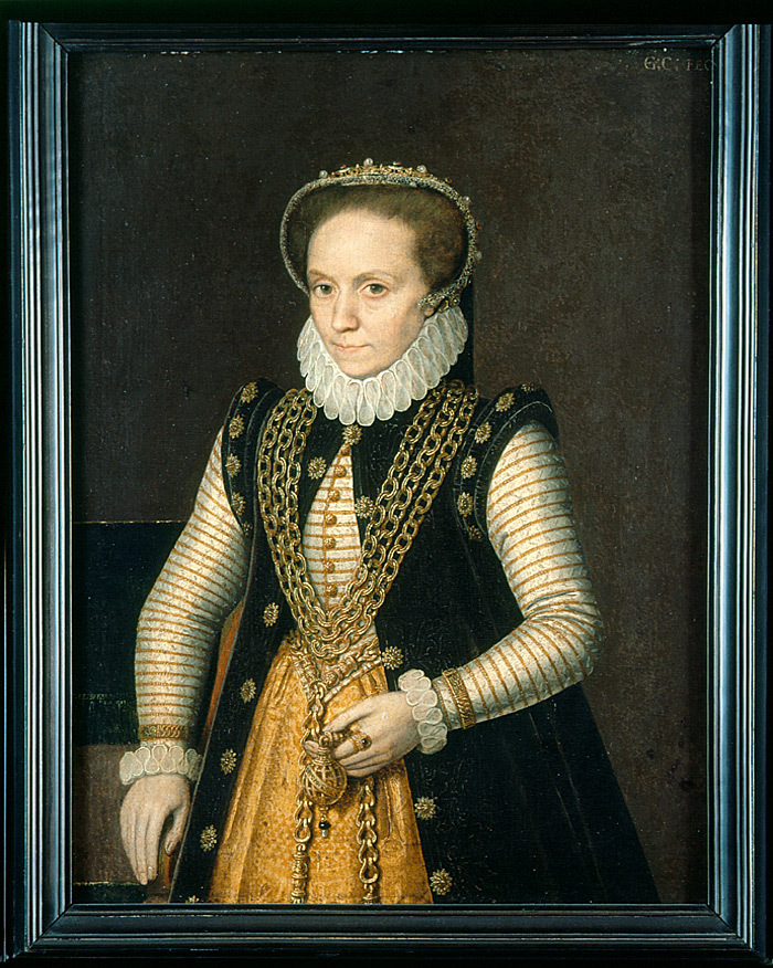 - Porträtt af medelålders förnäm dam. Knäbild, stående vänd halft åt vänster, hufvudet i halfprofil åt vänster, bredvid en klädd länstol med mörkbrun sits och mörkgrön rygg; högra handen hvilande å armstödet, vänstra handen hållande i slutlänken af en gördelkedja; bruna ögon, blicken åt åskådaren; bakåtkammadt brunt hår, något utstående vid sidorna; å hufvudet ett diadem i gul-, röd- och blåspräcklig emalj med vid öronen framåt böjda ändar, ofvanpå i midten ett pålagdt gult ornament, det hela besatt med hvita pärlor, omväxlande med röda stenar; vid diademet fast en bakåt nedfallande svart slöja, något synlig vid vänstra sidan. Hvitt pipkrås. Framtill öppen, ärmlös rakskuren svart öfverklädning med höga ärmvulster, å de senare samt längs framkanterna en rad af månguddade guldrosetter. Gulhvitt snibblif med långa smala ärmar, garneradt med tvärgående gula snodder samt framtill knäppt med en rad refflade kullriga guldknappar. Kring handlederna hvitt pipkrås, därofvanför å hvardera ärmen ett guldarmband, ledadt i flere delar, hvar-annan med ornament och hvarannan med pansarkedja. Veckig vid, rikt brunfasonerad gul kjortel. Kring halsen * en långt ned till midjan hängande treradig guldkedja af stora runda refflade länkar. Dessutom gördelkedja af guld med hyskformiga länkar och profilerade mellanstycken, vid den i vänstra handen hållna slutlänken en kula af korsade stafvar, bildande ett fyrsidigt rutverk; snedt öfver kulan ett band med devis i svart å franska: GsTOimtNL/Cf; under kulan ett hänge af en svart mindre kula med hvit smal afslutning. Å samma hands pekfinger två guldringar, den yttre slät, den inre med en stor fyrsidig mörk sten. Bakgrund mörkt gråbrun. Ljuset från vänster. I högra öfre hörnet signerad: På trä (ek). Baksida svartmålad, målningen fläckvis bortfallen. Å baksidan till vänster upptill en lapp af ljusgult papper, hvarå i svart och rödt tryckt och skrifvet (orig. 2/i): I öfre högra hörnet å baksidan skrifvet med blyerts några ord, af hvilka synliga: M(argareta) M(other) of H(enry) Darnley; därunder några rader otydlig skrift. Höjd: 0.365 m.; bredd: 0.275 m. Anm. Pendang till B.154. Tañan gick vid inköpet som ett verk af François Clouet (omkring 150° I572)» hvilket uppenbarligen ej stämmer med signeringen, som tydligen utgöres af initialerna G. C. (G. E.? C.). Vidare har tañan ansetts föreställa Margareta Tudor (1489 I541)» dotter af konung Henrik VII af England och Elisabeth af York samt förmäld i Augusti 1503 med konung Jaköb IV af Skottland, f. 17 Mars 1473 och som stupade i slaget vid Flodden 9 September 1513, då Margareta blef landets regentinna, hvarefter hon i Augusti 1514 i hemlighet gifte sig med Archibald Douglas, 6:e earl af Angus (omkring 1489—1557; i detta äktenskap föddes dottern Margaret, d. 1587» i äktenskap med Matthew Stuart, earl af Lennox, mor till Henry Stuart, lord Darnley, drottning Maria Stuarts gemål, f. 1545, d. 1567), skild från honom 1528 samt omgift i hemlighet med Henry Stuart, lord Methuen. Enligt en otydlig anteckning med blyerts å taflans baksida skulle tañan föreställa just ofvannämnda mor till lord Darnley. — Devisen »Espoeir en la..........* å gördelkedjans slutlänk har ej kunnat identifieras i Chassant: »Dictionnaire des devises historiques et héraldiques», Paris 1878, med supplement áf Henry Tausin år 1896. Ram (ny): Af päronträ, svartbetsad och polerad; på blindram af furu. Profil som figuren (orig. 8/i): Glas. Höjd: 0.535 m.; bredd: 0.435 m. Inköpt af Wilhelmina von Hallwyl, f. Kempe, å auktion hos Aktiebolaget H. BUKOWSKIS Konsthandel, Arsenalsgatan 2, Stockholm, 5 Oktober 1915. Katalog 205 n:r 21, se räkning samma dag. Betald 1 November 19x5, se Wilhelmina von Hallwyls privata Kassabok. Pris: Kr. 4000, se räkning. Kända tidigare ägare, se auktionskatalog 205, sid. 4: 1. Friherre Gotthard Mauritz von Rehausen, f. 29 September 1762, d. 8 December 1822, gift 26 Juli 1801 i Lissabon med Harriet Lovisa Bulkeley, f. 18 September 1776 i Lissabon, d. 21 Oktober 1834 i Jönköping. Af friherre von Rehausen inköpt i England i böljan af 1800-talet, då han var c svensk minister vid storbritanniska hofvet. 2. Öfverhofstallmästaren grefve Gustaf Adolph Fredrik Wilhelm von Essen, Vik, Balingsta socken, Uppland, f. 15 Juli 1803, d. 3 Oktober 1874, gift 7 April 1831 med Ida Mary von Rehausen, f. 13 Mars 1811, d. 2 Maj 1893, dotter till föregående. Se Bernhard Schlegel: »Svenska slott — Wijk», Stockholm 1876, Taf-velsamlingen, n:r 150. 3. Hofmarskalken friherre Reinhold Thure Gustaf Carl Gabriel Rudbeck, Edsberg, Sollentuna socken, Uppland, f. 16 December 1825, d. 13 Mars 1915, gift 2:a gången 24 Maj 1864 med friherrinnan Ida von Essen, f. 10 December 1838, d. 23 Juli 1922, dotter till föregående. 4. Friherre Reinhold Rudbecks arfvingar. Af dessa försåld å ofvannämnda auktion. Ramen förfärdigad efter beställning af Wilhelmina von Hallwyl, f. Kempe, 9 December 1915 hos snickaren Edv. JOHANSSON, Kammakaregatan 7, Stockholm, se räkning 29 Mars 1916. Betald 30 Mars 1916, se Wilhelmina von Hallwyls privata Kassabok. Pris: Kr. 60, se räkning.