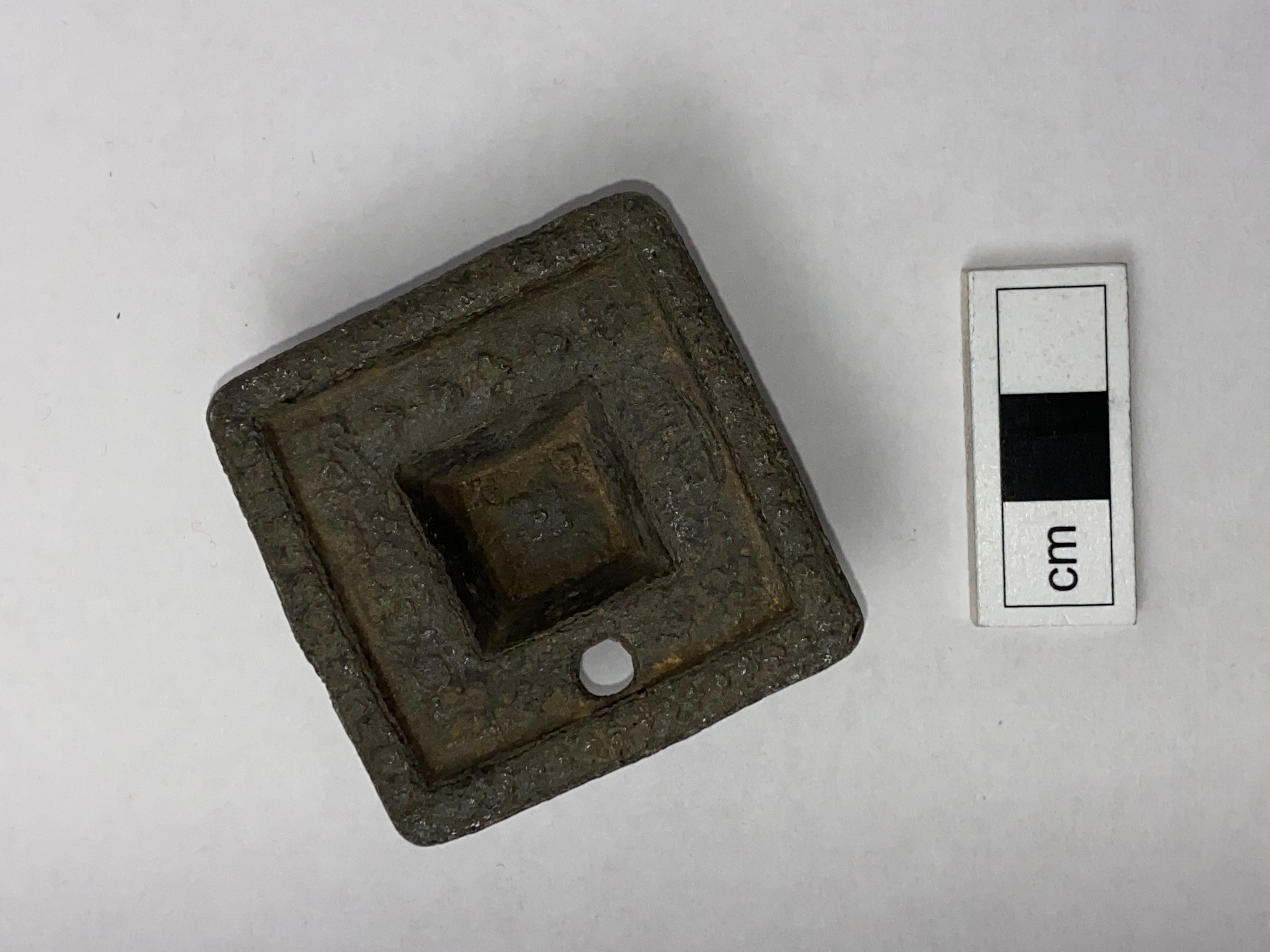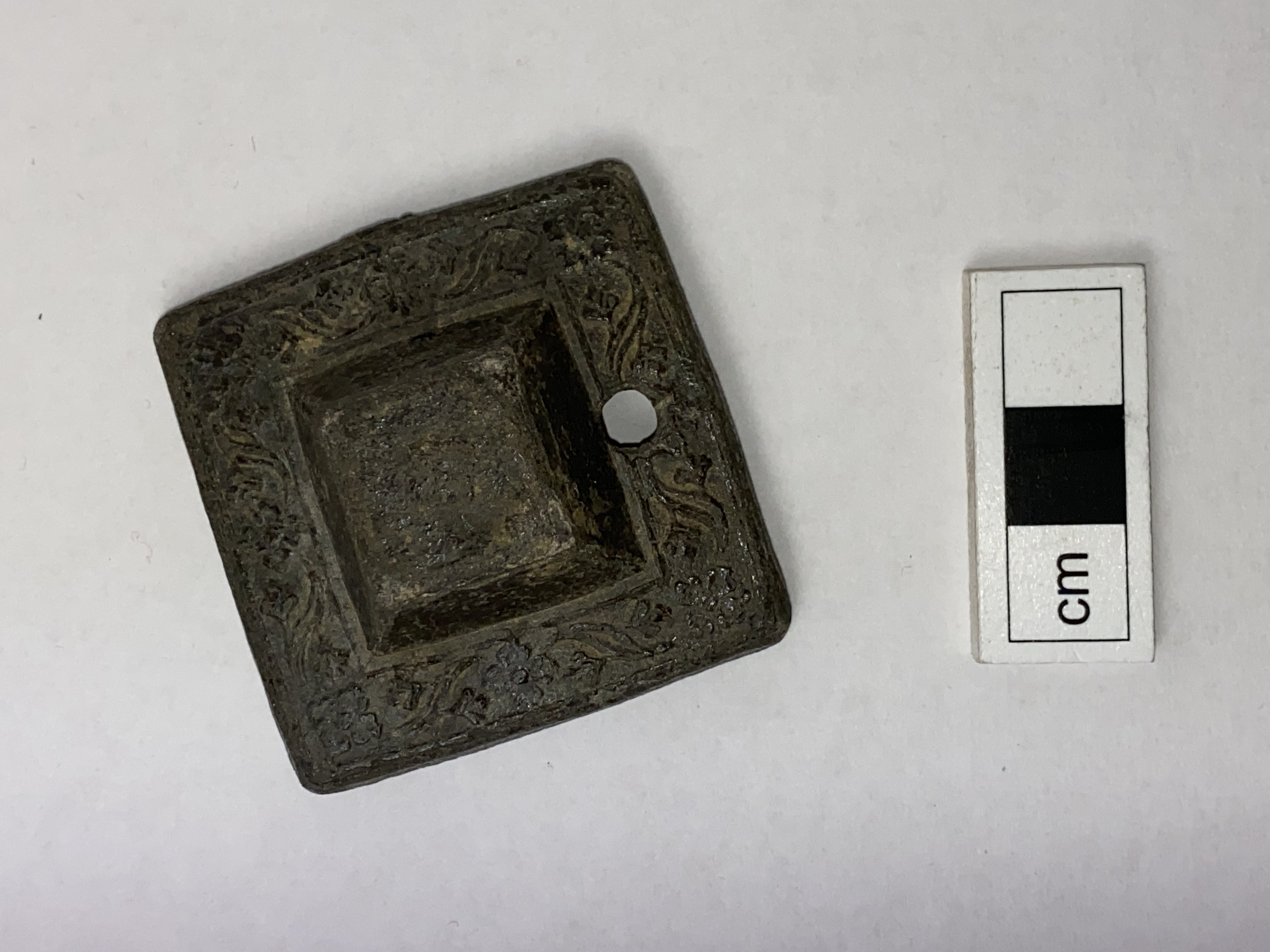 Ornamenterat tennstycke i form av en hatt med runt hål vid kanten