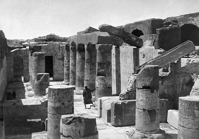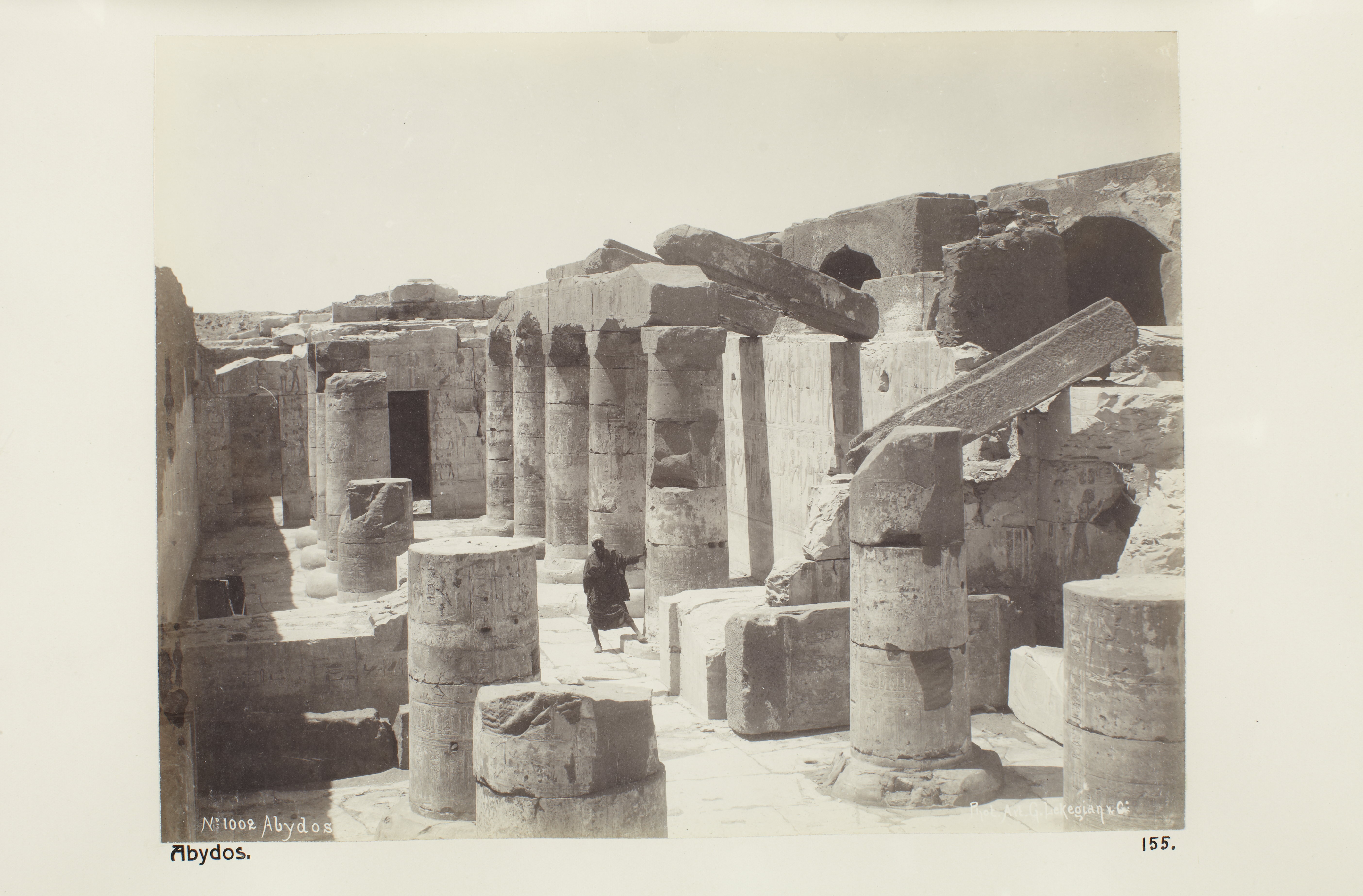 Abydos, Egypten. Text på fotografiet: Abydos. Fotografierna LXVI:M.01.- 201. kommer från resan till Egypten och Sudan som Wilhelmina och Walther von Hallwyl gjorde vintern 1900-1901. De lämnade Sverige den 5 november 1900 och fortsatte från Egypten till Palestina den 28 mars 1901. Med på resan var döttrarna Ellen med maken Henric de Maré och Irma med maken Wilhelm von Geijer. Wilhelminas sällskapsdam, fröken Ida Uhse reste också med. Under en del av resan anslöt sig ledamoten av Internationella domstolen i Kairo, assessorn Otto Conrad Waldemar Cedercrantz med makan Anna Elisabeth. Vid resan uppför Nilen hade Walther von Hallwyl hyrt ångfartyget Columbia med besättning. Båtresan startade i Kairo 27 december 1900, gick ända till Wadi Halfa varifrån man reste vidare med tåg till Khartum och tillbaka till Wadi Halfa. Båten vände åter i riktning mot Kairo, men det verkar som att sällskapet tog tåg sista biten, från Luxor. Henric och Ellen de Maré samt fru Cedercrantz lämnade båten redan då de passerade Luxor första gången. Resten av sällskapet återvände till Kairo den 1 mars. Fotografierna LXVI:M.01.-120. togs av resenärerna själva, de största av Ellen de Maré, de mellersta av Wilhelmina von Hallwyl och de minsta av Wilhelm von Geijer. Resten köptes av professionella fotografer i Kairo, de flesta från Studio Photogr. Artistique G. Lekegian & Cie. Alla uppgifter kommer från Ida Uhses reseanteckningar. Inköpt hos studio Photogr. Artistique G. Lekegian & Co.