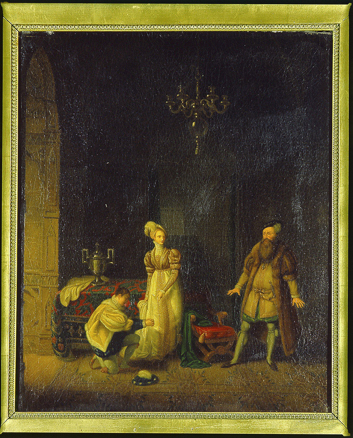 Renässansinteriör. Svante Sture på knä framför drottning Margareta i gulvit atlasklänning. Till höger Gutav Vasa i lång brun kappa och gul jacka. Kilad spännram. På ramens tvärslå papper med längre text på franska, skildrande den målade episoden. På dukens baksida skrivet "N.12", 10 cm h. På ramen lapp med text: "Svante Sture och Drottning Margaretha öfveraskas af Gustaf Vasa", samt senare tillskrivet "Hängde en gång i nuv. 1700 t. rum 11 tr.". På ramen skrivet med svart penna "Mr Senave" (?) samt överkorsat "166". Förgylld profilerad ram med bladstavar av pastellage. Ramlistens bredd 10, 5 cm. Bakpå högra ramlisten liten rest av förgylld papplapp.