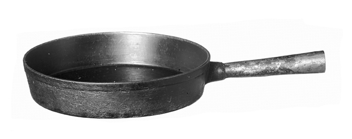 STEKPANNA Av järn, gjuten. Rund, med något snett uppstående kant, på denna kring brädden ett svagt utstående, smalt band, skarp bottenkant, plan botten och snett utstående skaft. Skaft av plåt, runt, ihåligt och avsmalnande inåt samt fäst i en från kanten utgående gjuten holk; vid ytteränden på översidan ett runt hål. Höjd: 4,6 cm.; diameter: 21 cm. Skaft, längd: 13 cm.