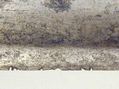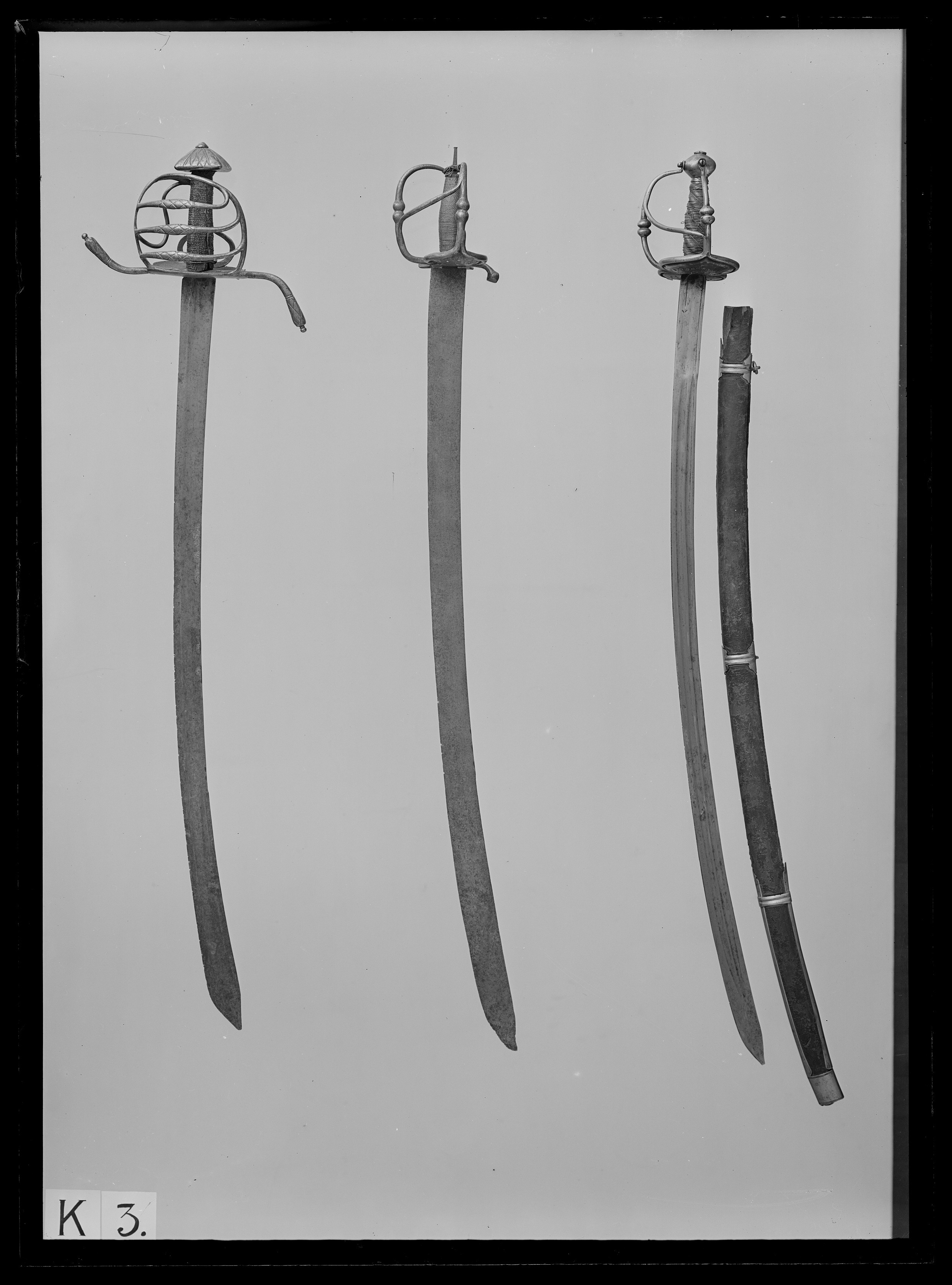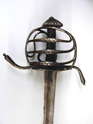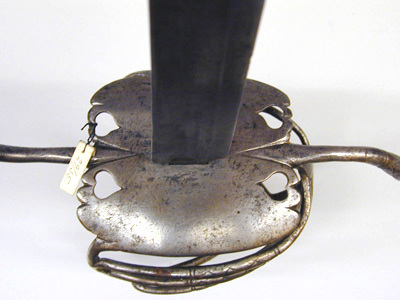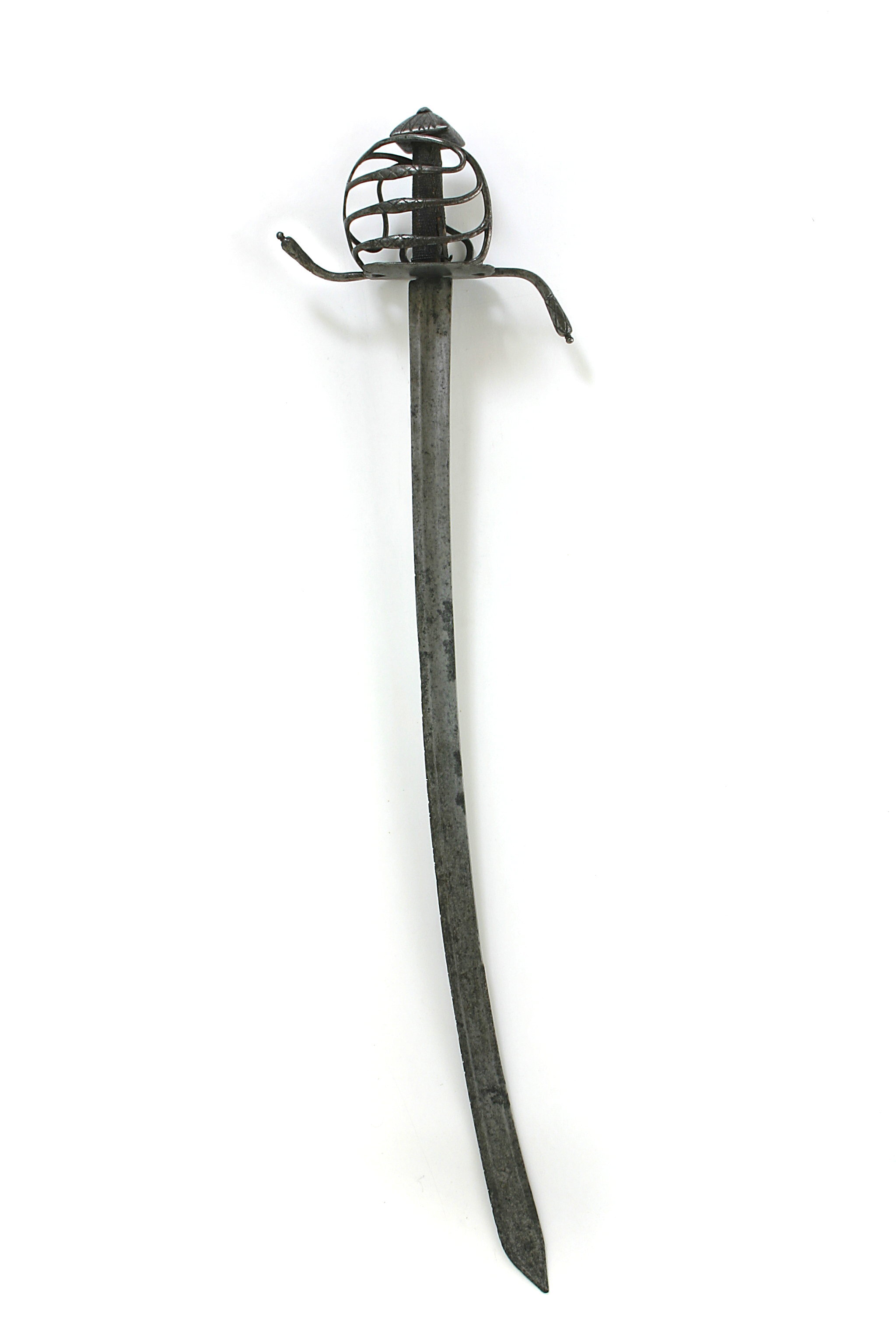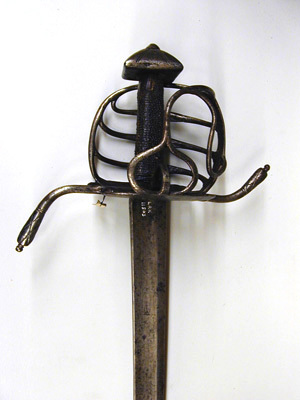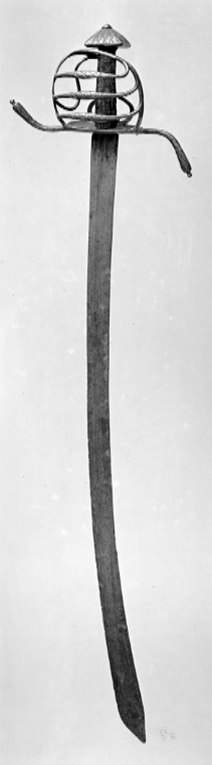 Korgfäste av stål med knapp. Fästet monterat med sabelklinga. Knapp fyrsidigt pyramidformig, låg, ornerad med punsade, raka ränder och romb i rutmönster. Den korgformiga pareranordningen bestående av en platt handbygel, som ej ansluter till knappen, från dess utsida utgår upptill en trind överbygel rakt bakåt-nedåt, anslutande till den yttre parerplåtens bakre kant. Mellan handbygeln och överbygelns bakre led tre tvärgående parallella sidobyglar, vilkas mittpartier är smyckade med punsat, rombiskt rutmönster. Insidans pareranordning bestående av asymmetriskt böjda, trinda och jämförelsevis smala sidobyglar, mellan inre parerplåtens kant och krysset en tumbygel. Parerstänger långa, trinda med vidgade ytterändar, avslutade med en liten kula, främre parerstången uppåtsvängd, den bakre bakåtsvängd. Parerplåtar symmetriska, närmast fyrsidigt ovala, ändarna genombrutna med ett ornament i form av ett hjärta. Kavel med rundat, rektangulärt tvärsnitt och klädd med mörkt, brunaktigt fiskskinn (?). Klinga något böjd, eneggad med jelman, l: ca 273 mm. På båda sidor utmed klingans hela längd en bred, grund hålkäl. På klingryggen intill jelmanens början två slipade fasningar på vardera sidan. På insidan av denna ca 105 mm från basen en inslagen, otydlig mästarstämpel.