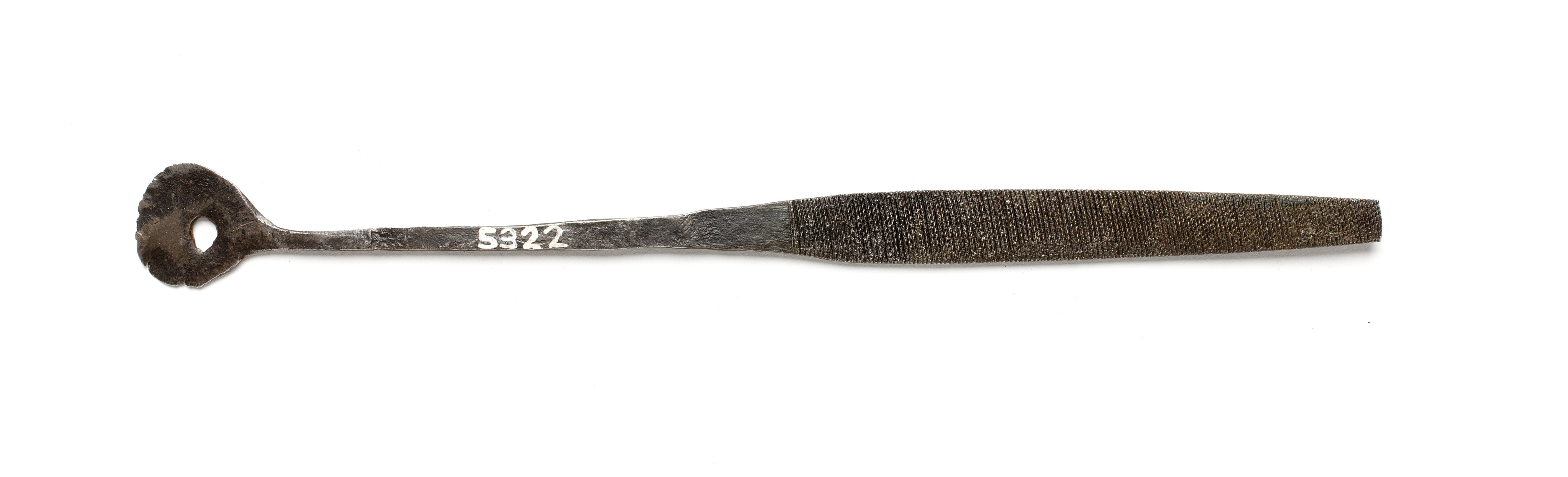 Utsmitt fyrsidigt skaft med rund platta med hål. Stämpel: I avslutat med cirkelsegment i ändarna och med tvärstreck på mitten.