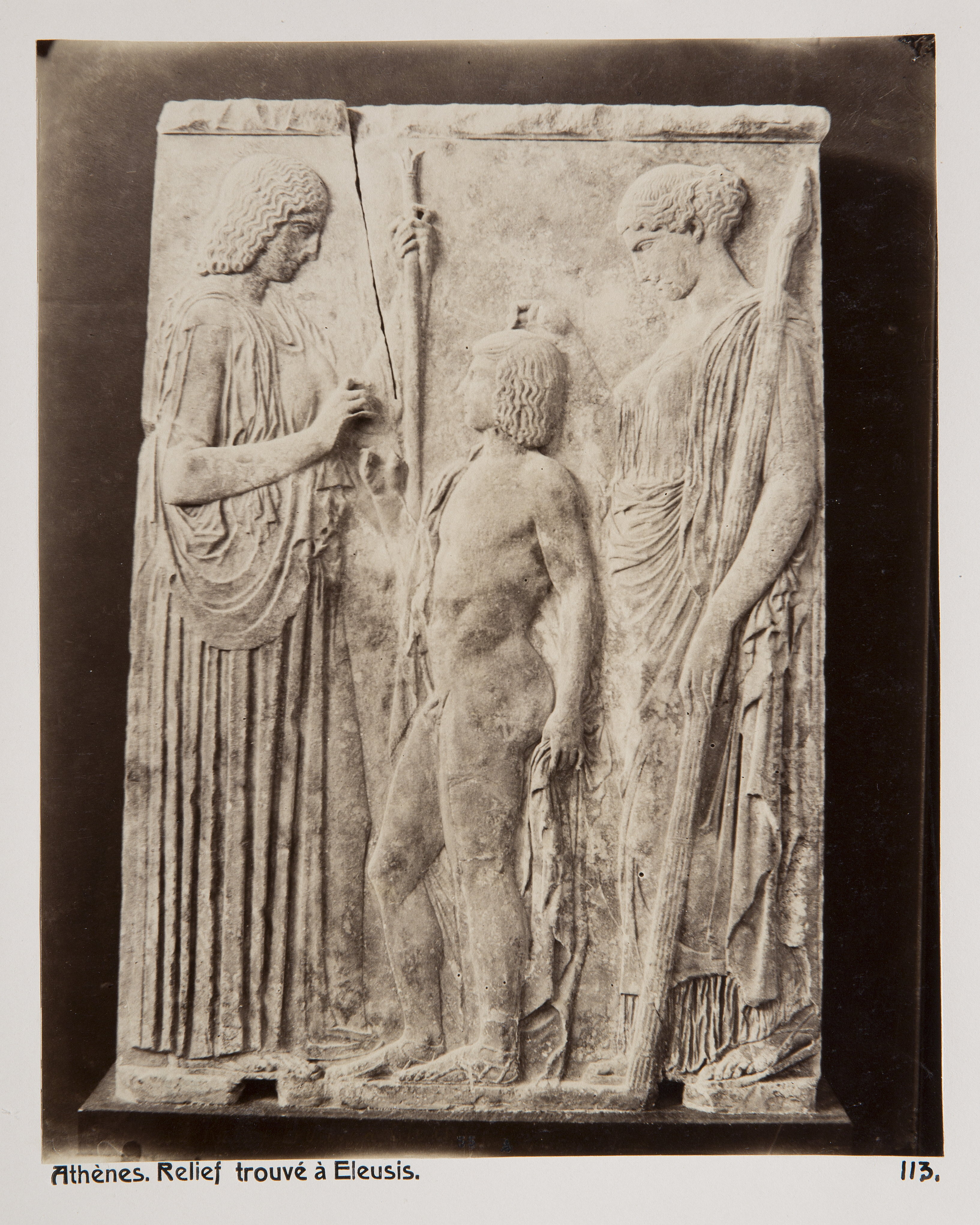 Relief från Eleusis. Aten, Grekland. Text på originalet: Athènes. Relief trouvé à Eleusis. Foto från resa genom Grekland, Makedonien och Serbien, 15 mars-6 juni 1896. Fotografierna LXVI:K.18.-147. är köpta av Wilhelmina von Hallwyl, f. Kempe på Korfu samt i Patras, Nafplion, Aten, Thessaloniki och Belgrad. Med på resan var maken Walther von Hallwyl och fröken Ida Uhse. Uppgifterna kommer från Ida Uhses reseanteckningar.