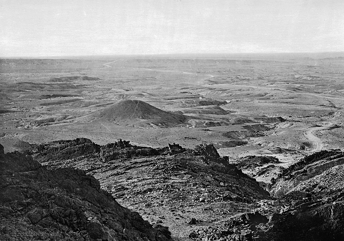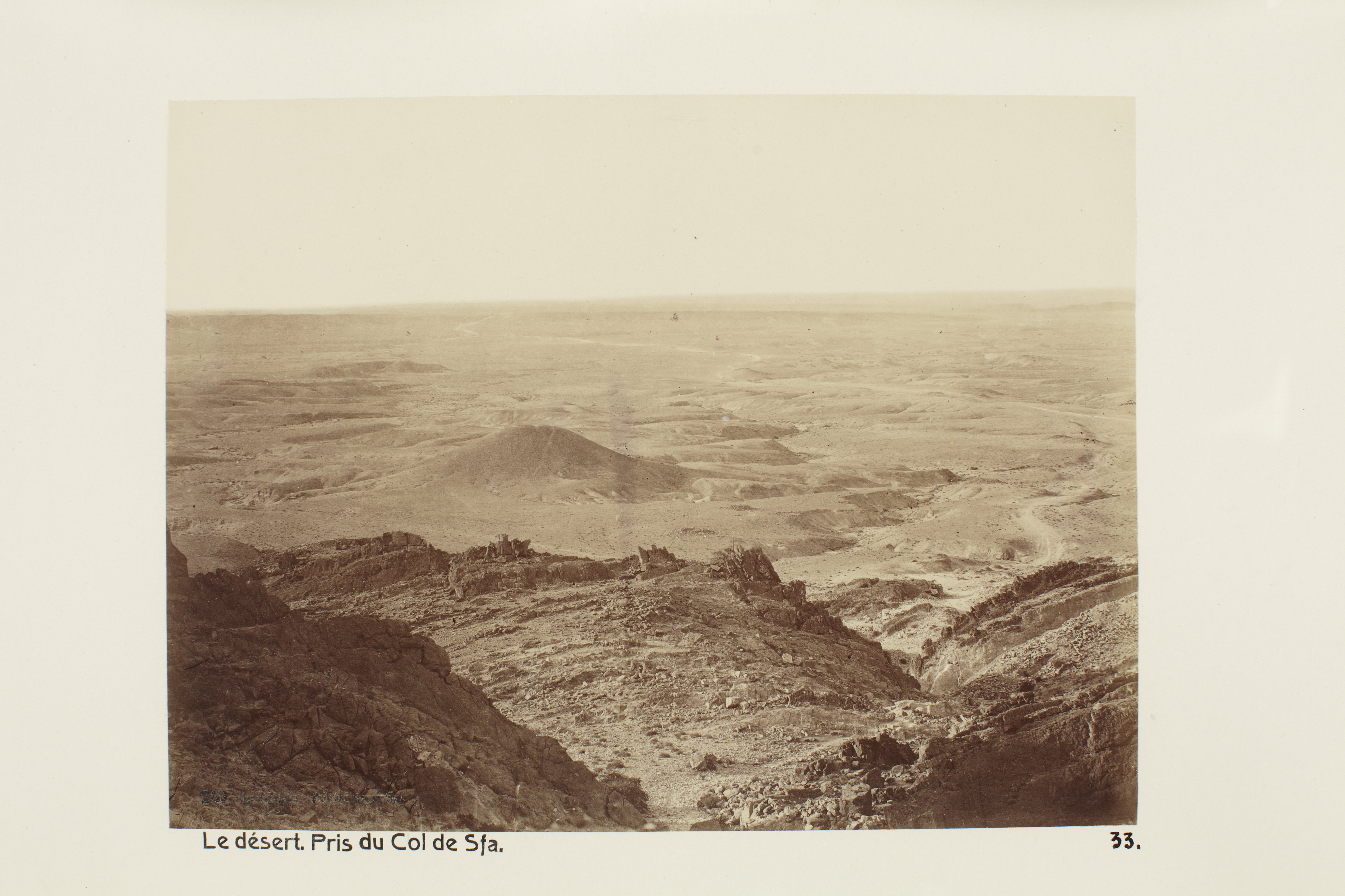Algeriet. Öknen. Fotograferat från Col de Sfa. Foto från resa genom Algeriet och Tunisien samt åter över Schweiz, 11 februari - 19 maj 1889. Samtliga foton i gruppen LXVI:F. är inköpta av Wilhelmina von Hallwyl i Alger, Biskra, Tunis, Constantine, Oran och Blidah vid hennes vistelse i nämnda städer tillsammans med sin make, Walther von Hallwyl, sin mor, Johanna Kempe, f. Wallis, dottern Irma samt fröknarna Caroline Pflaum och Ida Uhse. Uppgifterna kommer från fröken Ida Uhses reseanteckningar.