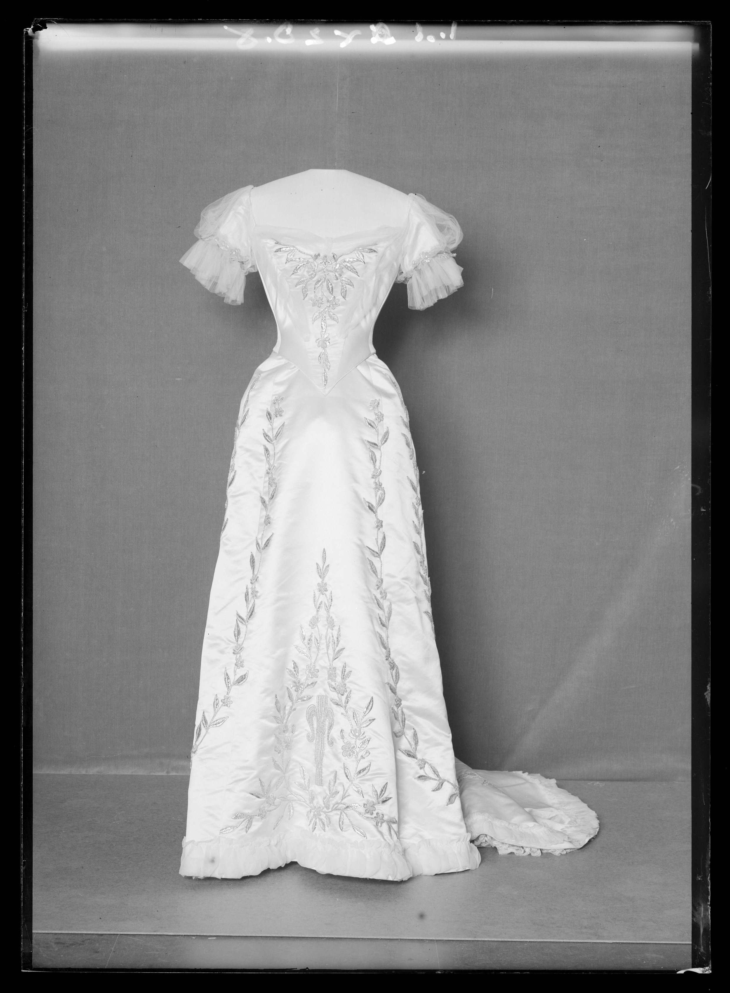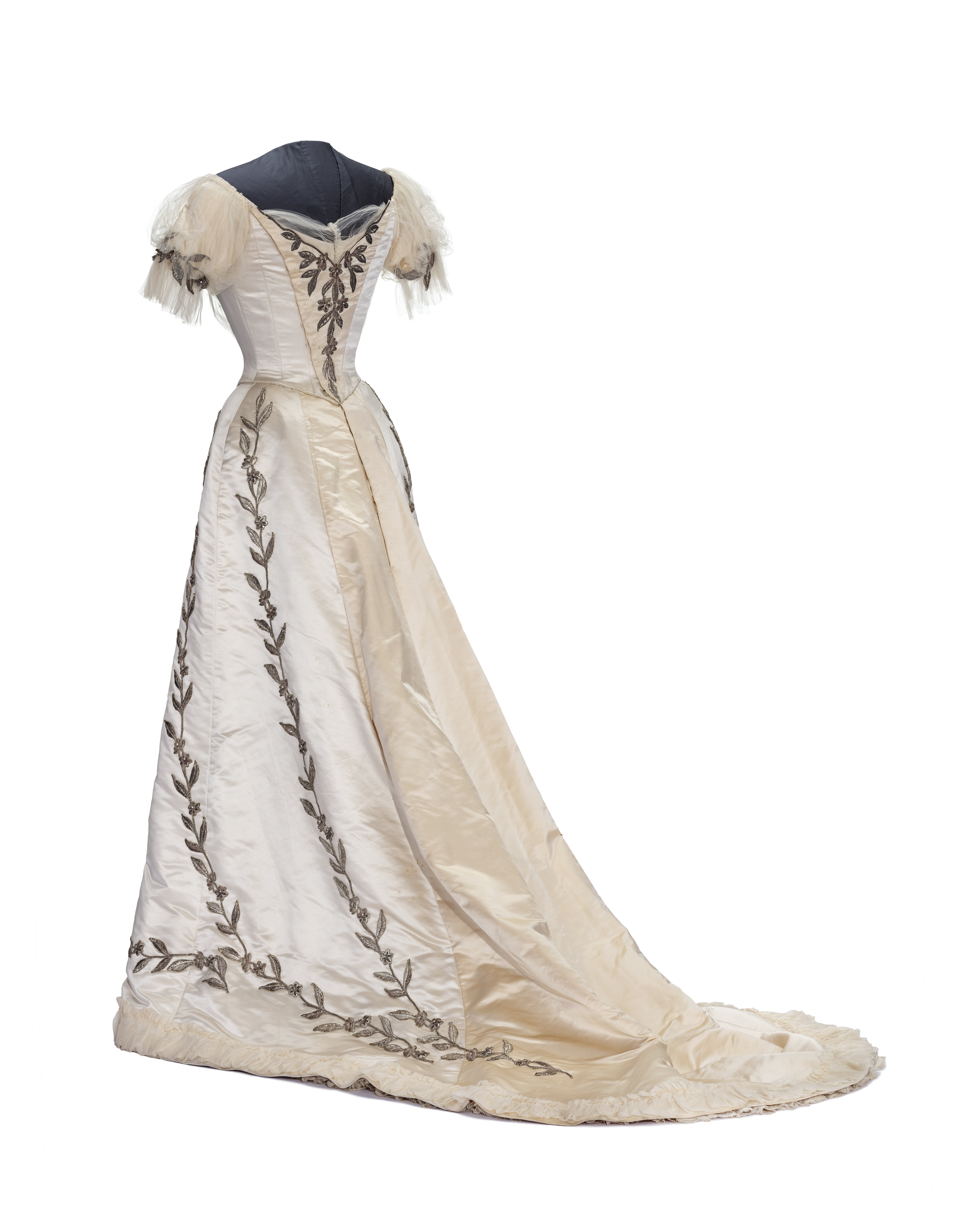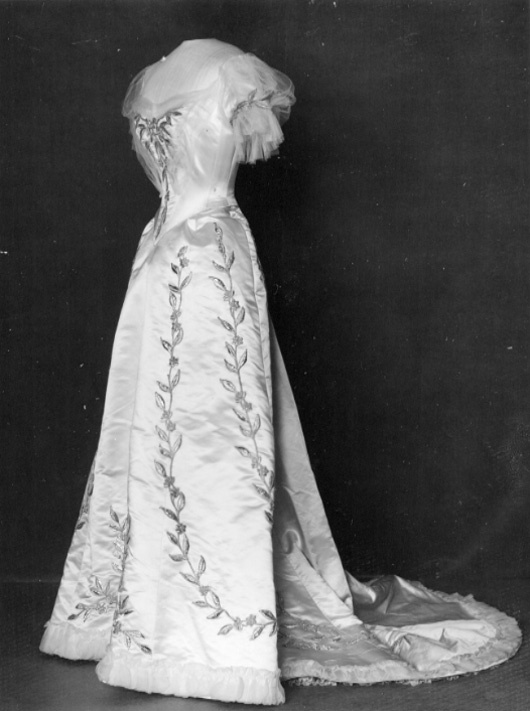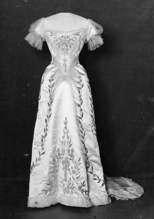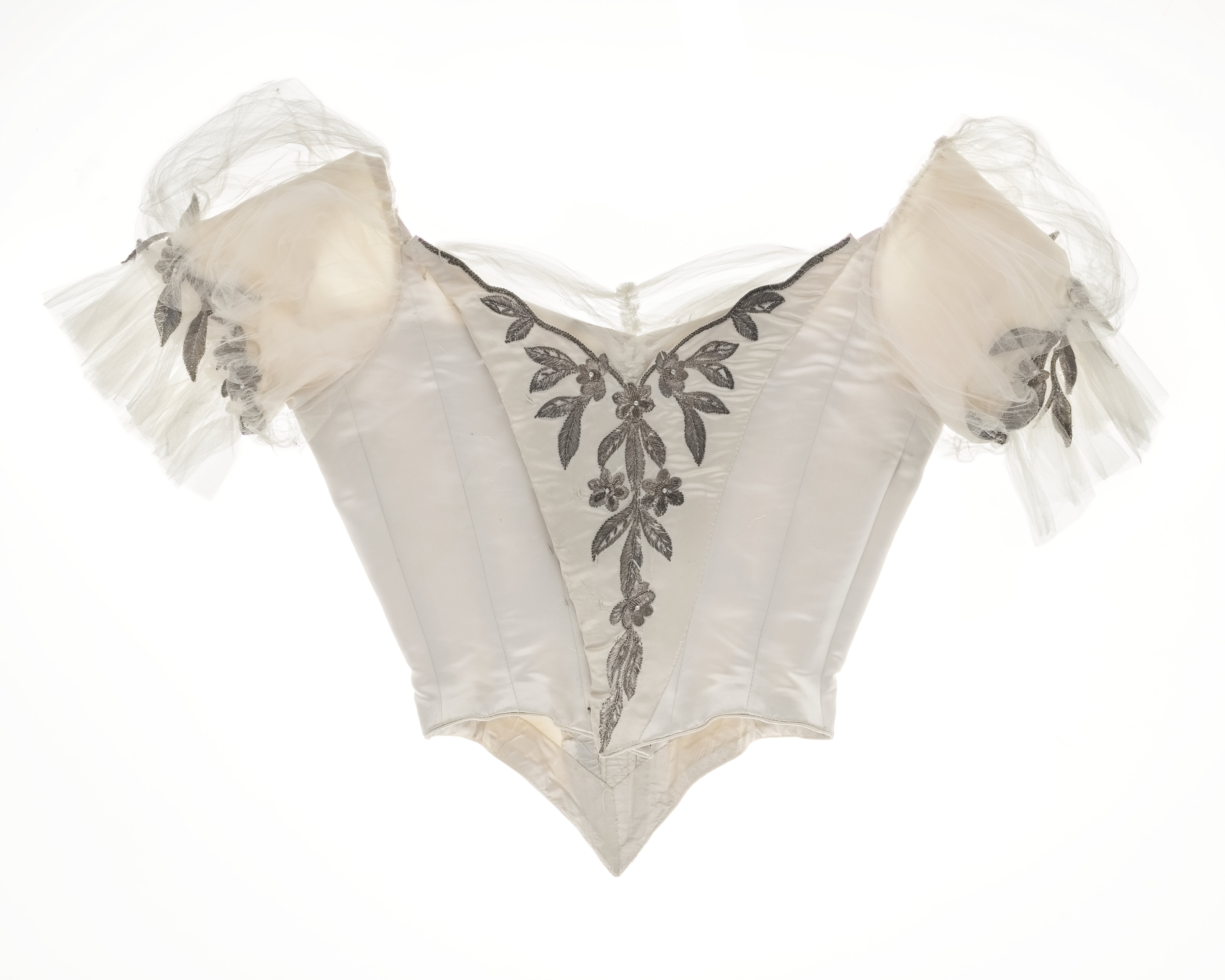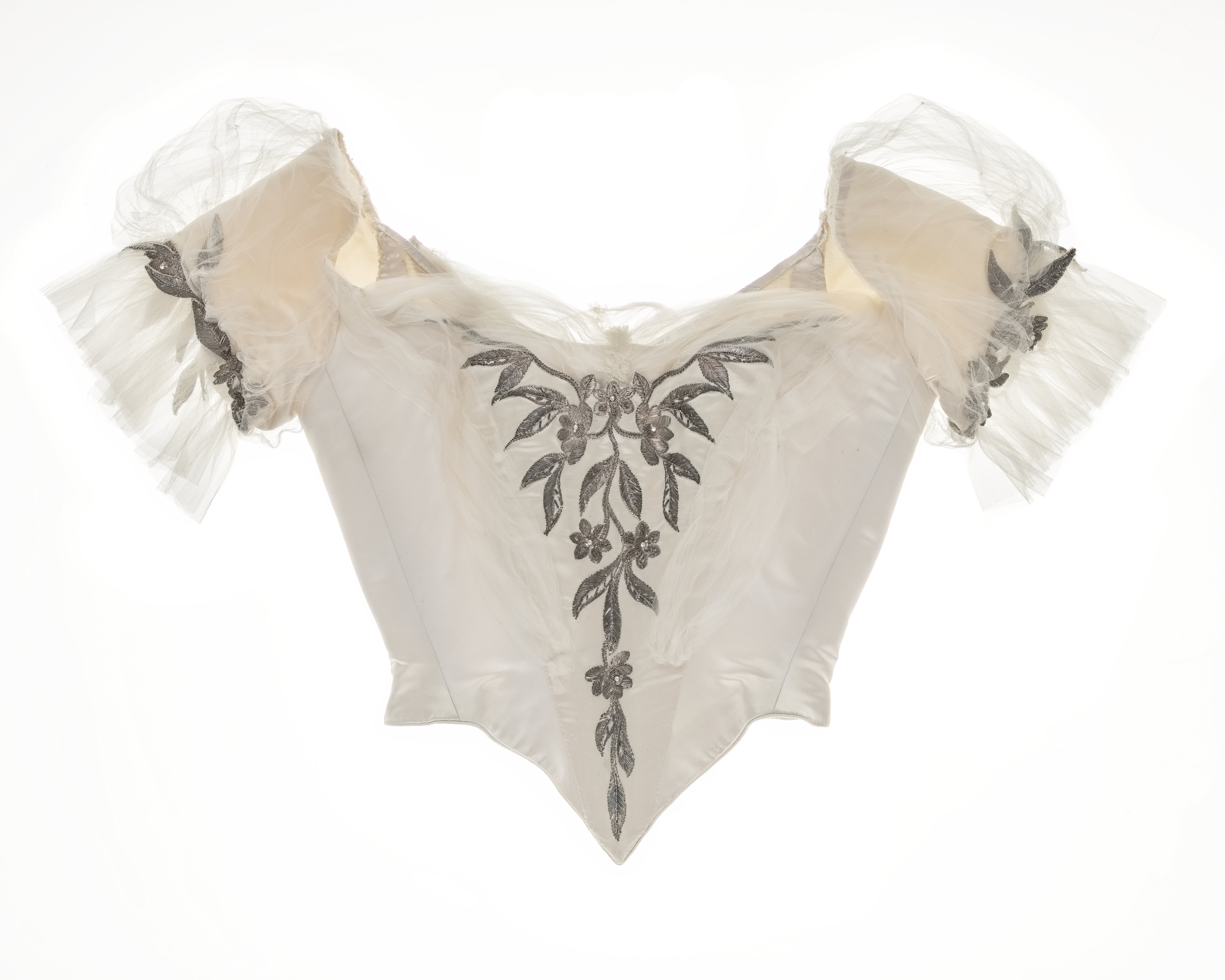 Livet har en snibb längst fram, är sytt i vitt sidenatlas och fodrat med tunn sidentaft. Livet är sytt i 12 våder, 4 fram och 4 på vardera sidan om öppningen bak. Över de två mittenvåderna på framlivet är en snibb med broderi i silvertråd och silverlan fastsydd. Korta puffärmar där ärmavsluten har dekorerats med sliverbroderi och veckad tyll. Även urringningen har dekorerats med tyll (sk. fishy) samt på vardera sida av mittstycket fram till. Invändigt förstärkt med skenor i något hårt material ev. ben. I ryggen hyskor i dubbla rader, den yttersta till att fästa den broderade dekorsnibben som i sin tur döljer hyskorna på livet. De båda snibbarna samt ärmarna är av annan kvalitet än tyget i övriga livet. Invändigt i midjan (allra närmast kroppen) sitter ett sidenripsband som stängs med två hyskor. På bandet står tillverkaren angiven: "Anna Gröber Robes et Confections, Kärntnerstrasse 10, in der Passage (Wien)".