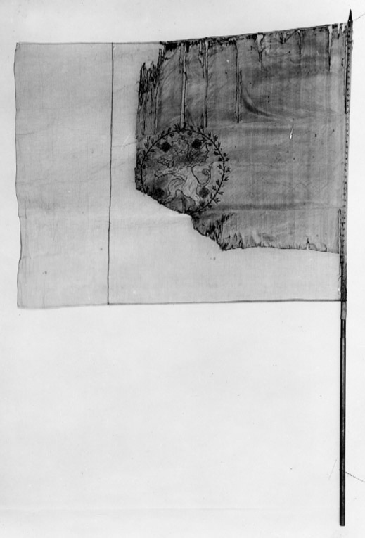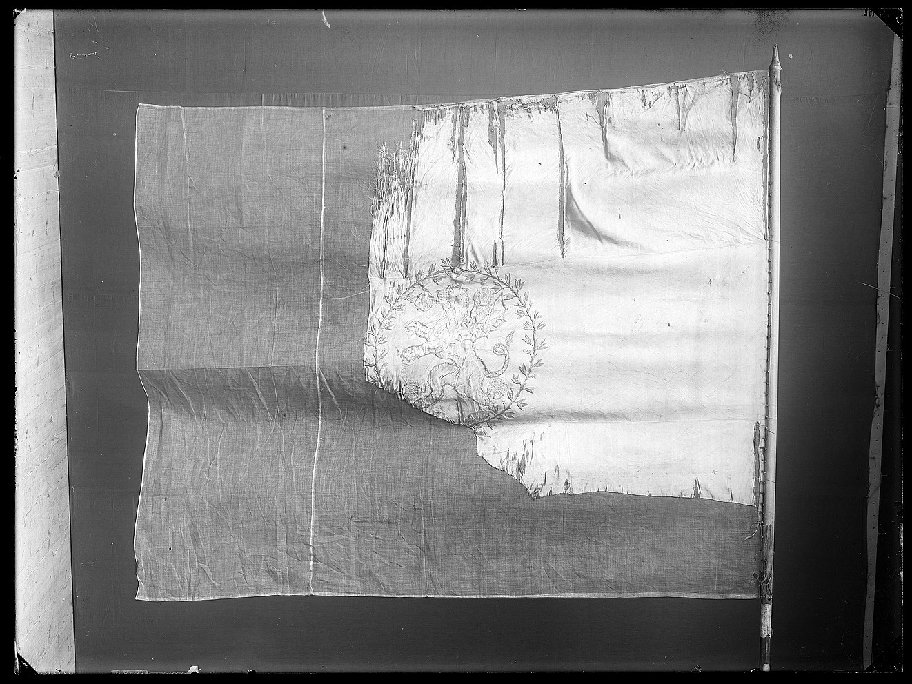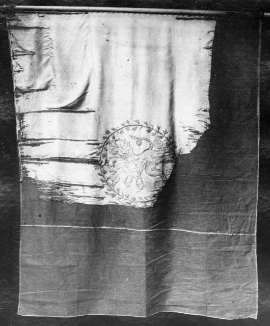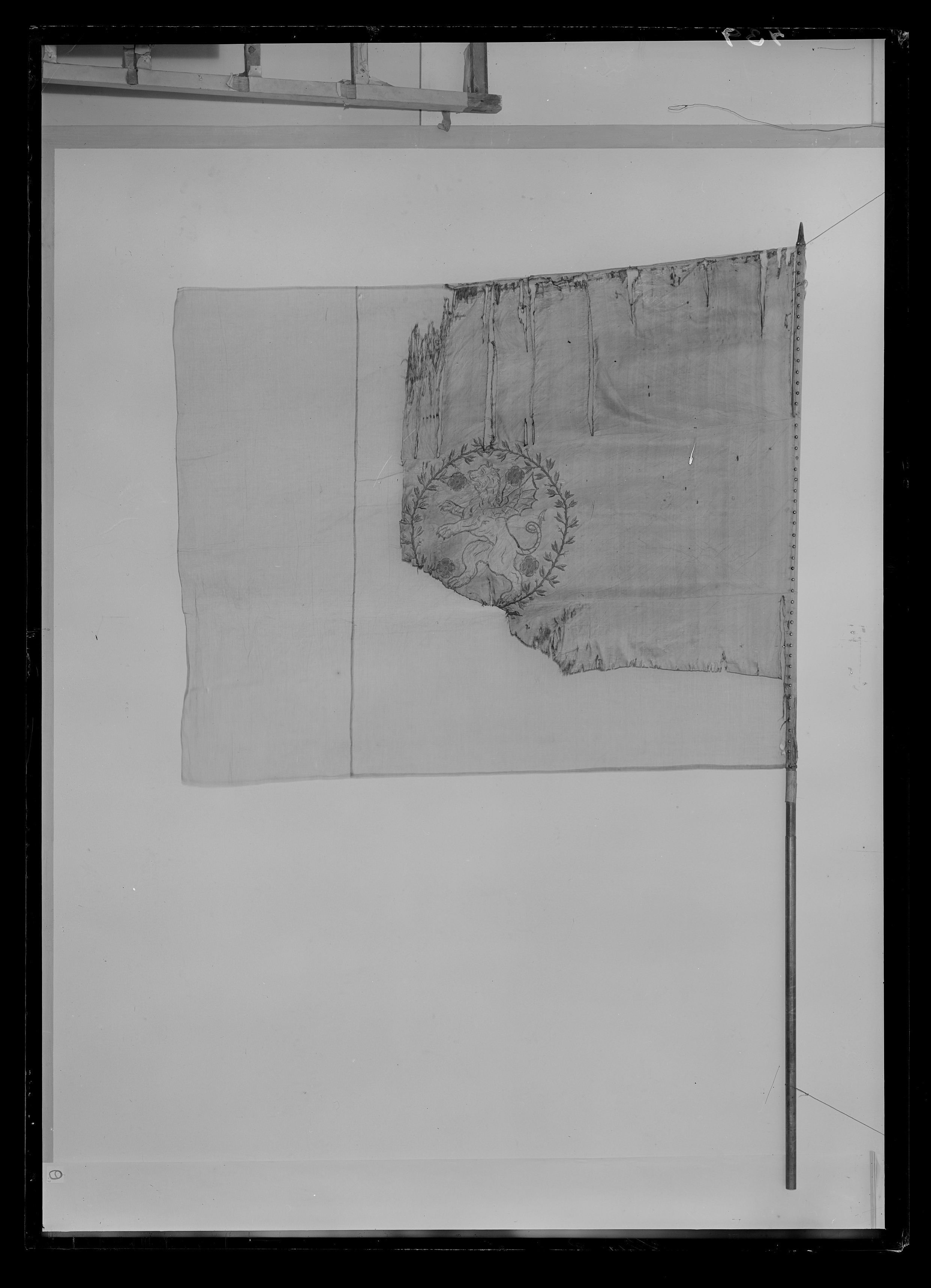 Duk av enkel röd sidenkypert. Sydd av tre horisontella våder à 580 mm. Dekor: Broderad lika på båda sidor, i mitten Östergötlands sköldemärke, en grip (drake) av gult silke och applicerat siden följd av fyra rosor blått silke och applicerat siden, omgivna av en krans diam. 520 mm av två lager kvistar i brunt silke medgröna blad och bär i gult silke. Upptill och nedtill hopknutna, nedtill med en gul rosett. Duken kantad med en röd silkessnodd. Fäst vid stången med förgyllda spikar på rött sidenband. Stång: av rödmålad furu. Mässingsförlängning.Total l: 3320 mm.