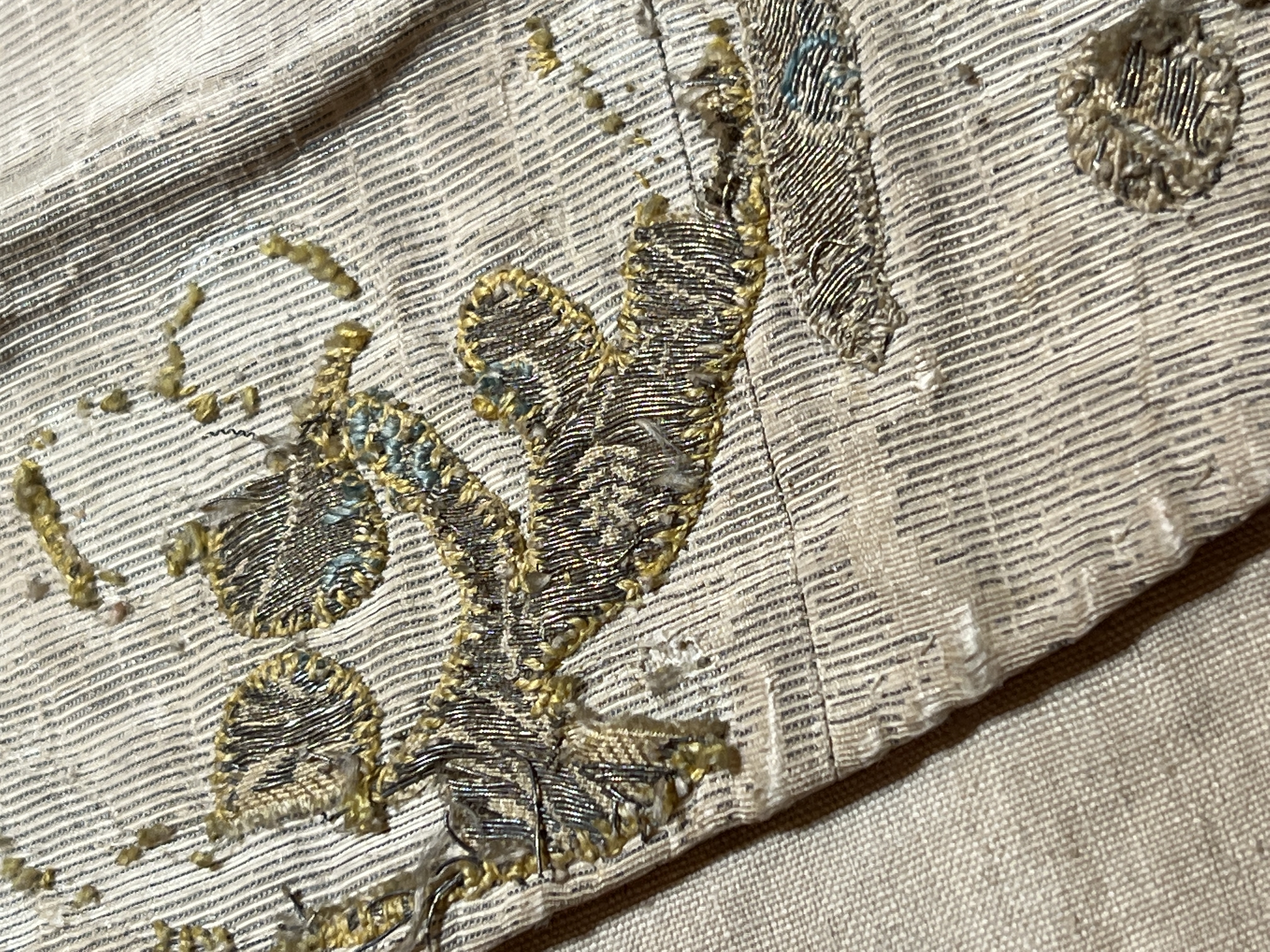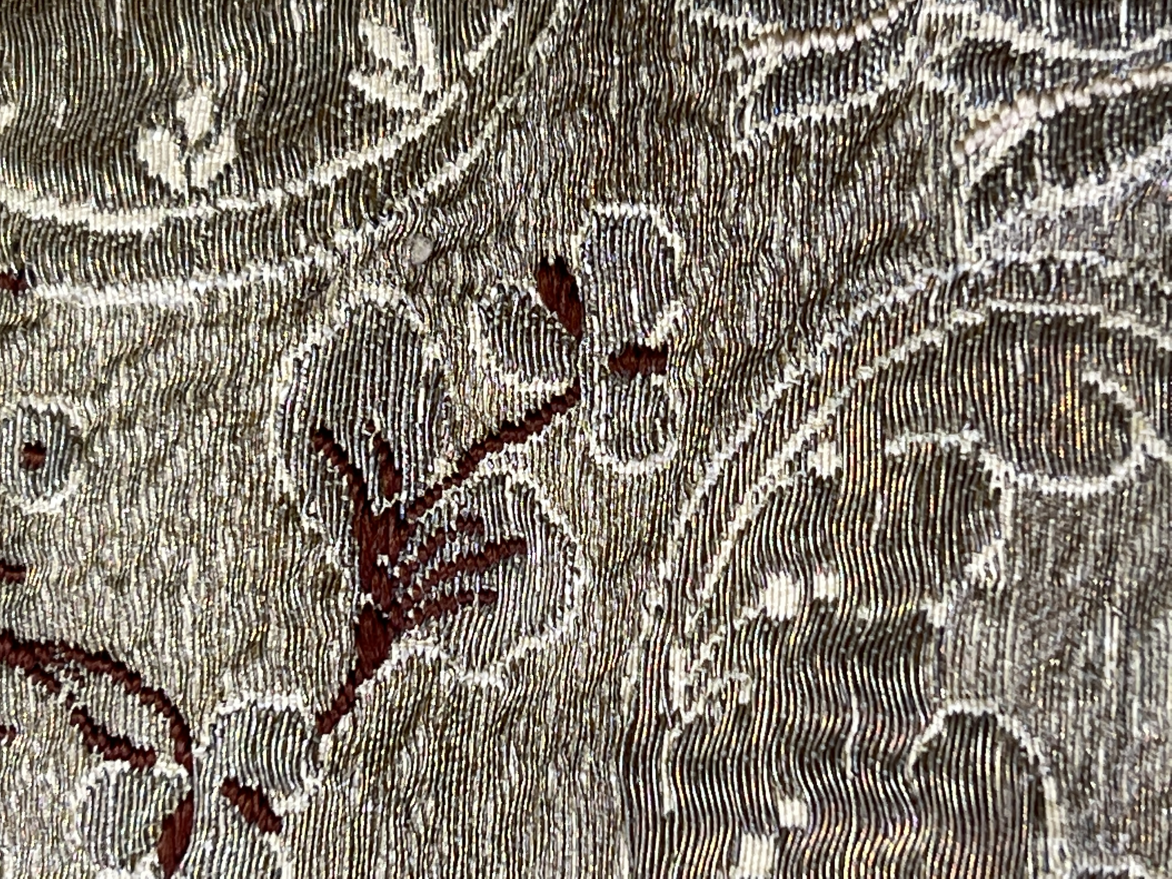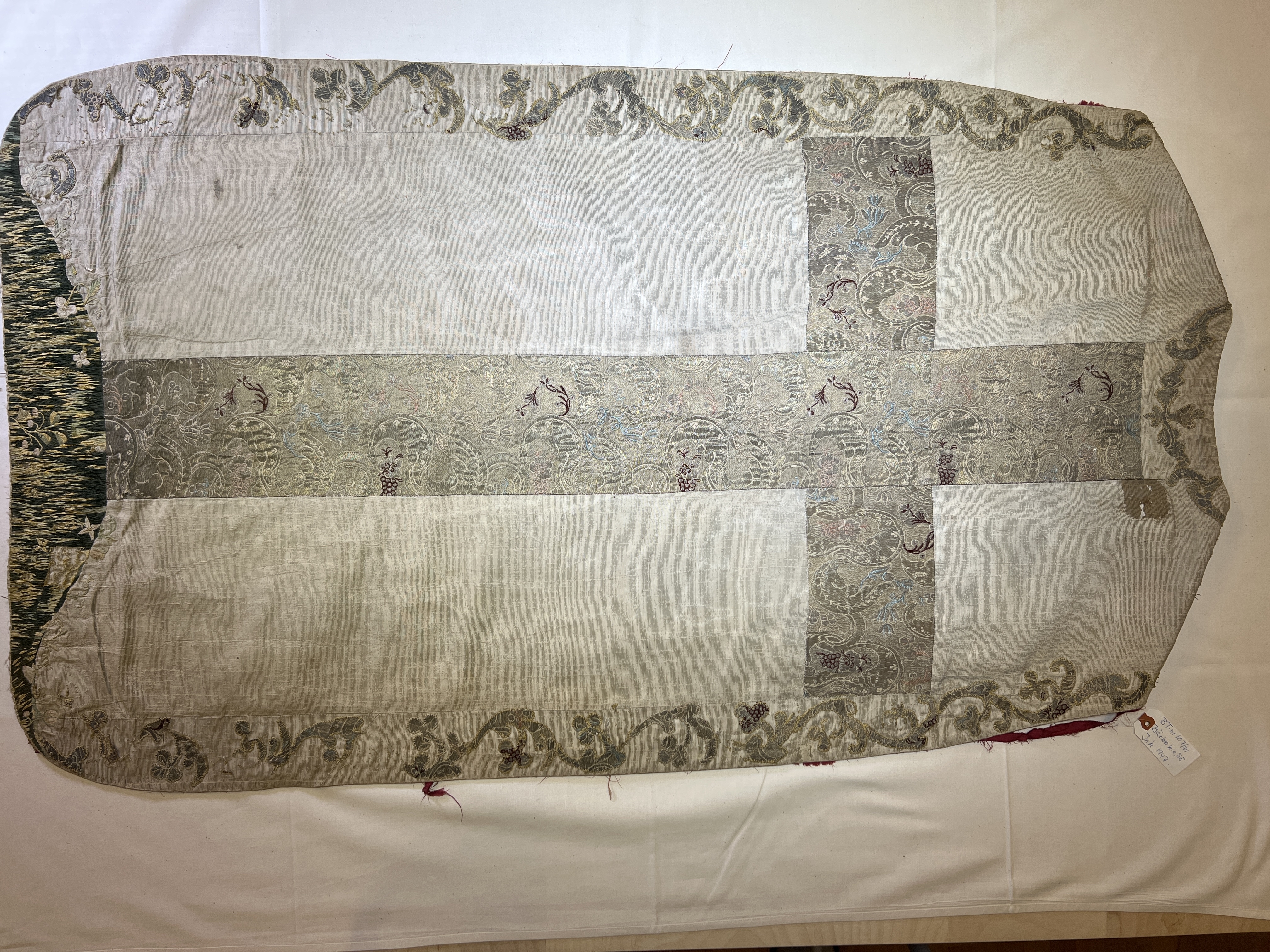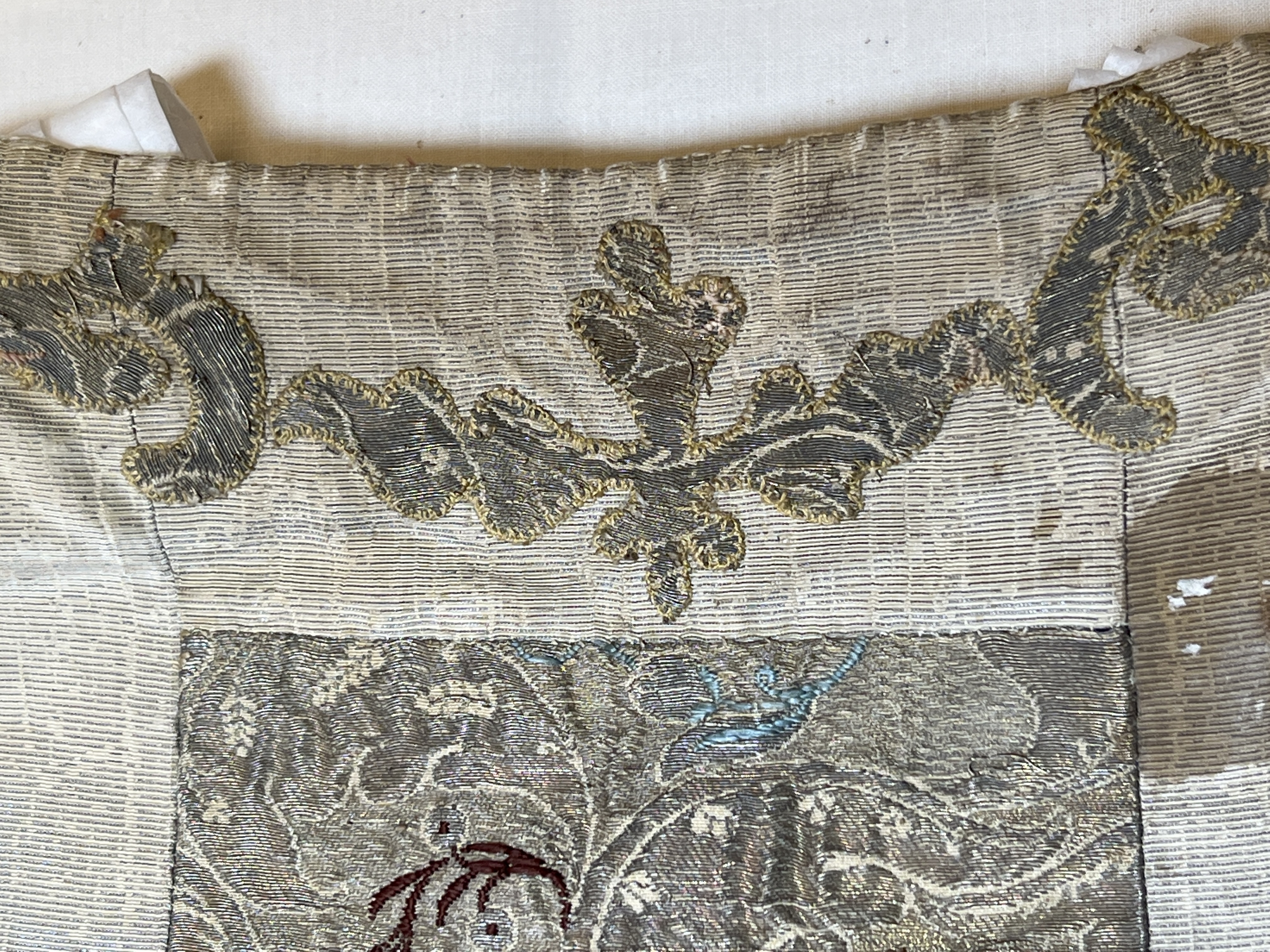 Silvermoiré, kors av guldbrokad, broderi, rött sidenfoder. Deponerad 1985.