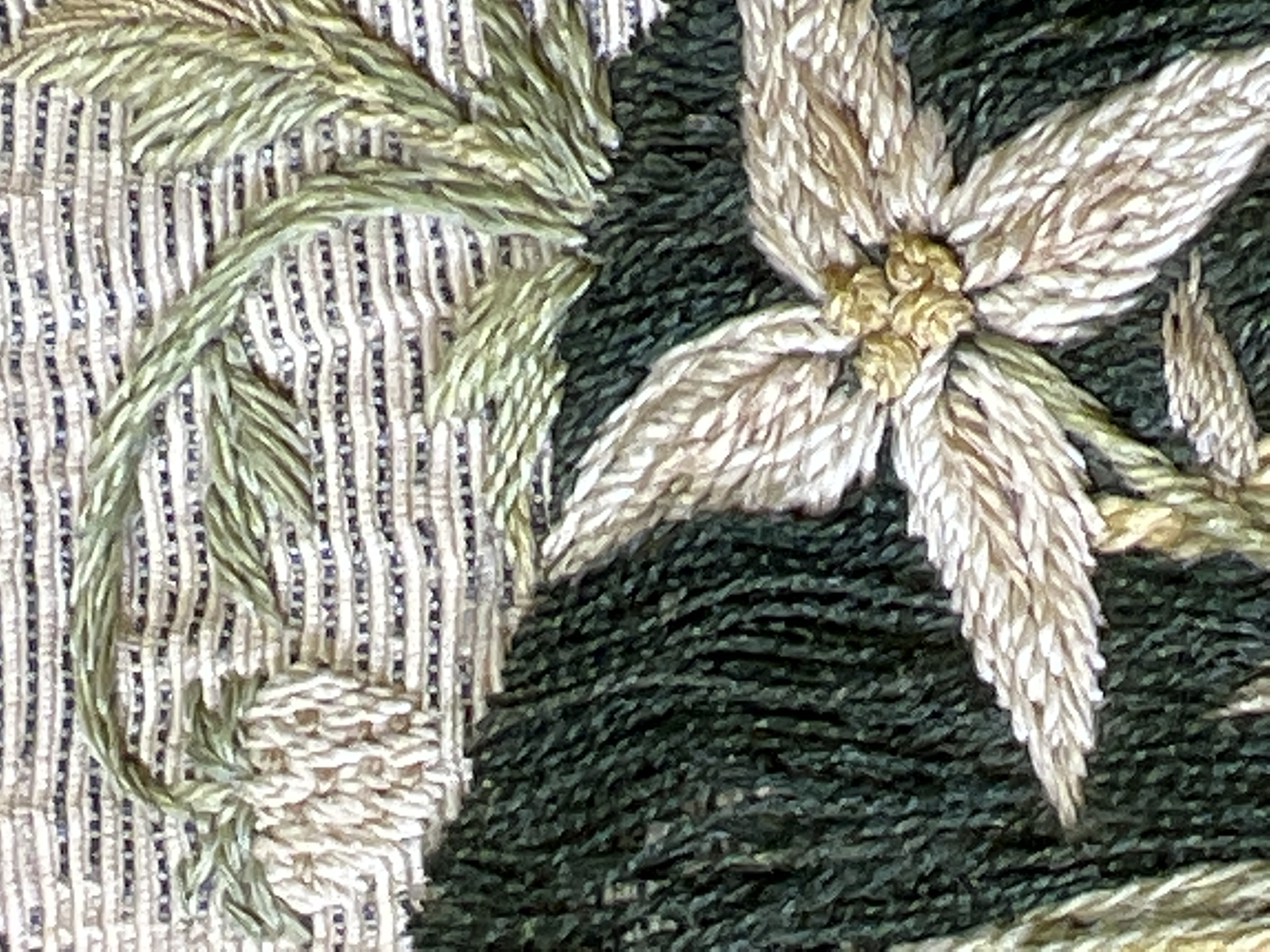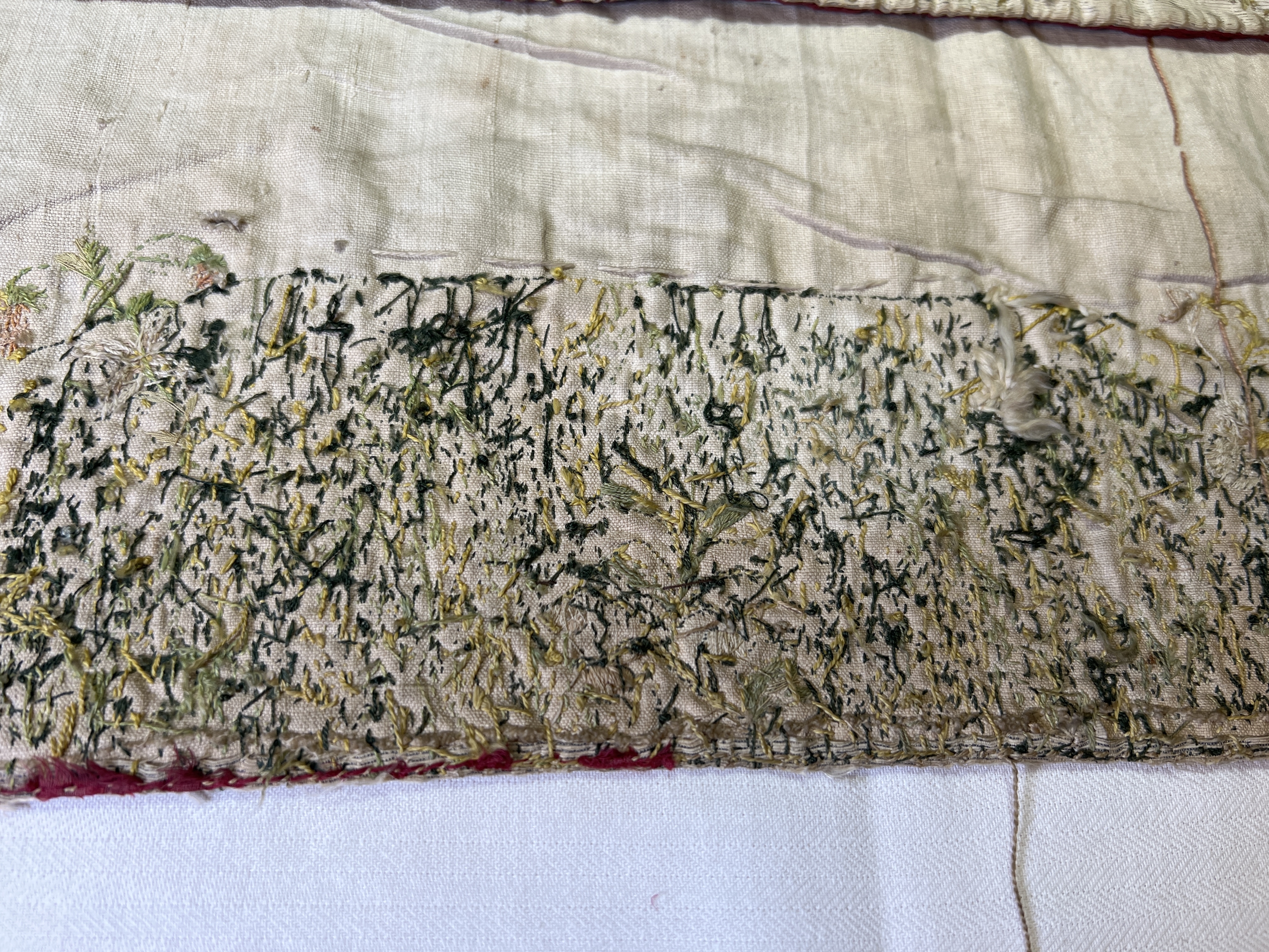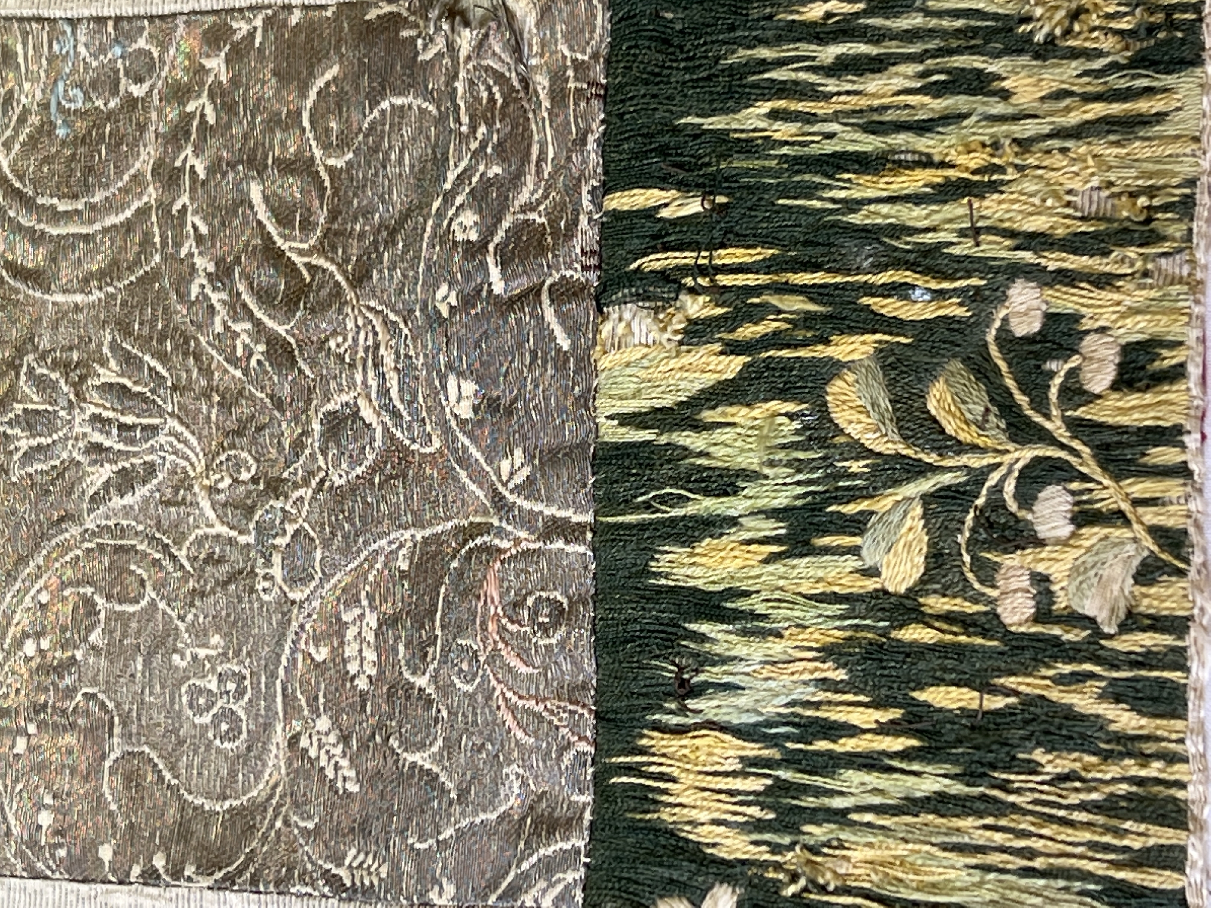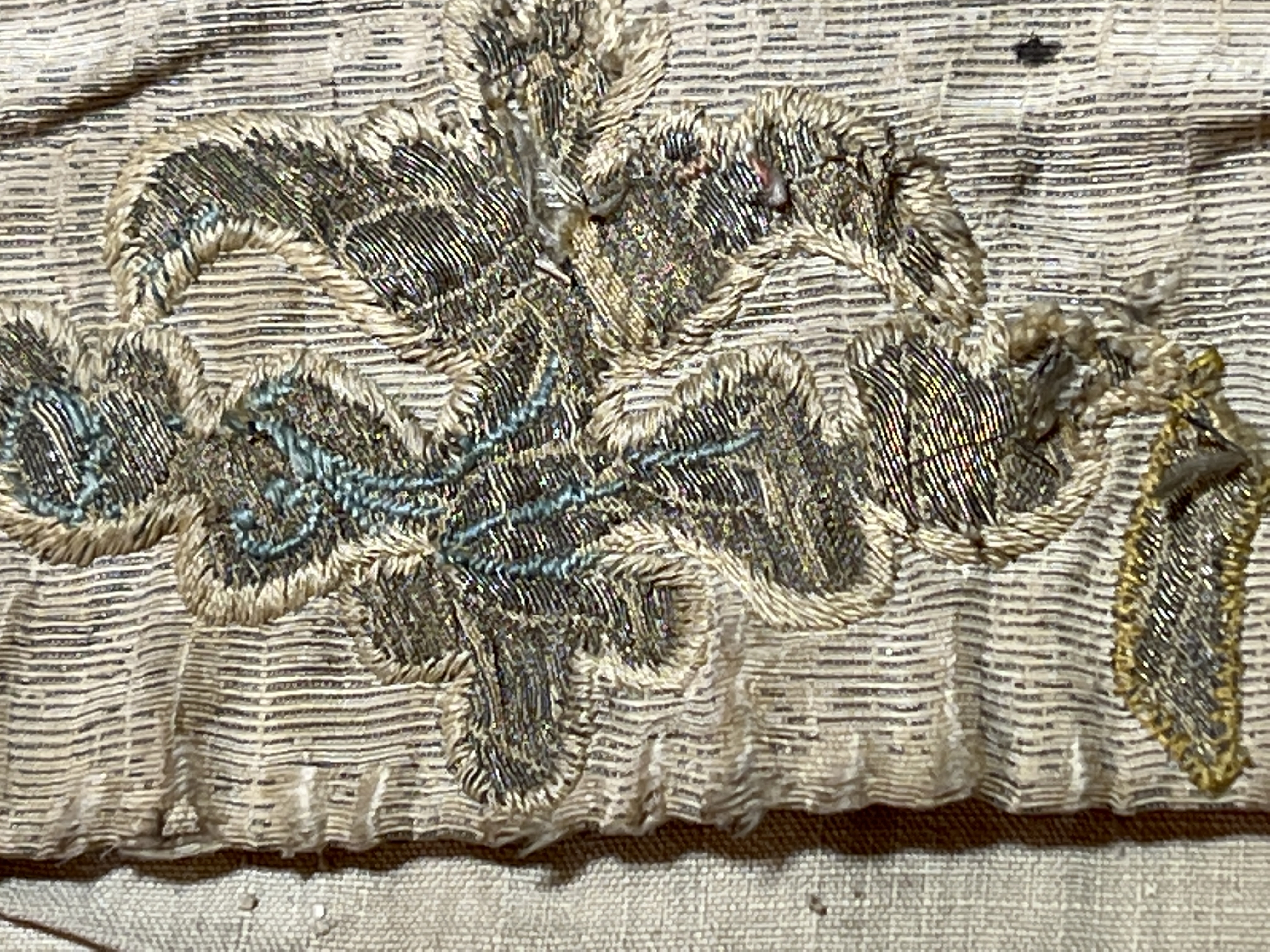 Silvermoiré, kors av guldbrokad, broderi, rött sidenfoder. Deponerad 1985.