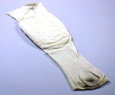 Naturvit lösvad i form av en strumpa stickad i ylle med öppen tå. En söm mitt bak som löper ner under hälen. Vaden förstärkt inuti med en vaddering i ett glansigt tyg, fastsydd för hand med stora spridda sömmar på utsidan över hela området.