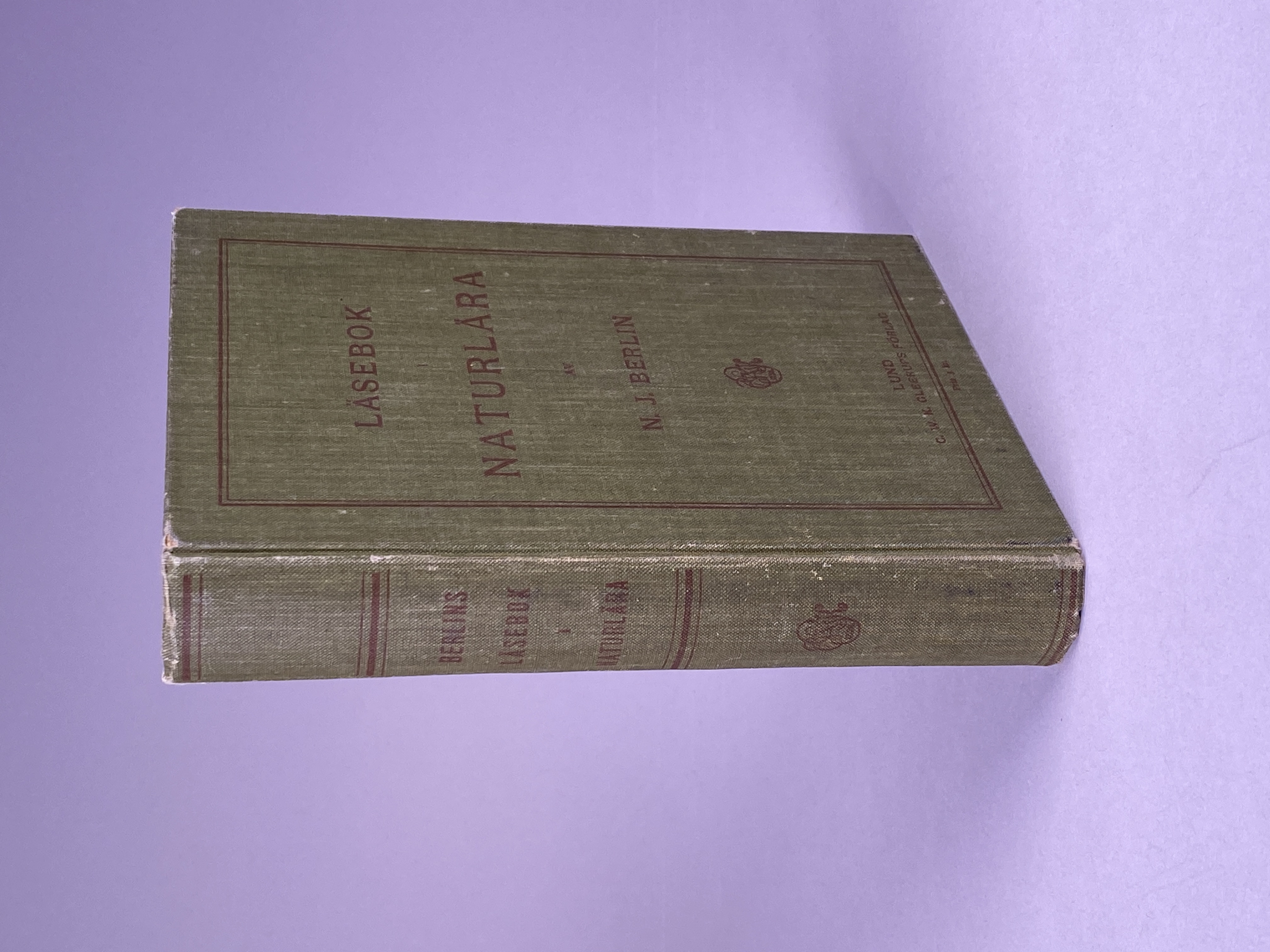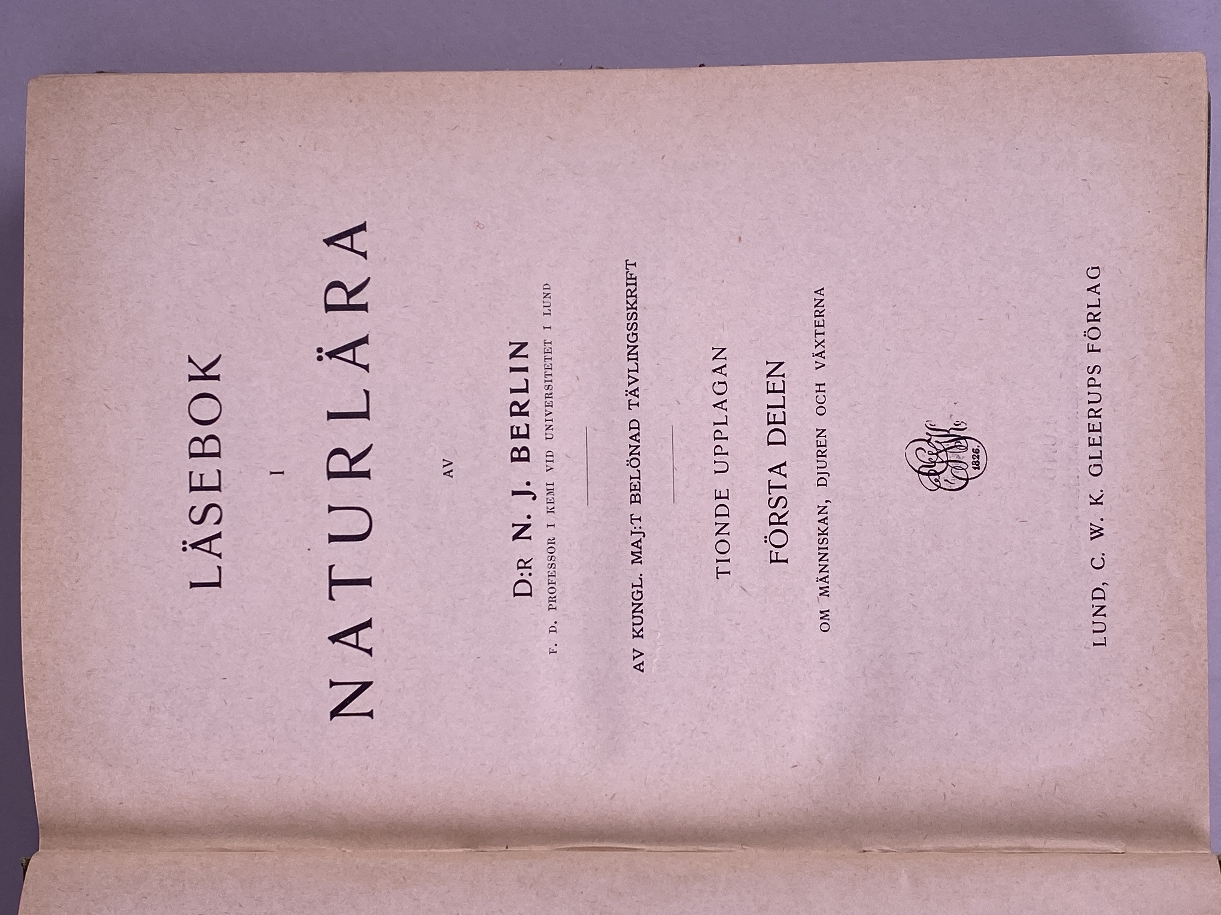 Bok, skriven av N. J. Berlin. "Läsebok i Naturlära av D:R N. J: Berlin, F.D Professor i kemi vid Uppsala Universitetet i Lund. Av Kungl. Maj:t belönad tävlingsskrift. Tionde upplagan. Första delen. Om människan, djuren och växterna". Grönt klotband med pärmar av papp. Framsida och rygg med titeln tryckt i brunt. Pärmarnas insida klädda i rosa papper, den främre pärmens insida med påskrift i bläck: "V. Tumba bruks folkskola 1908". Brunstänkt snitt. Tryckt år 1907 av Berlingska boktryckeriet i Lund.
