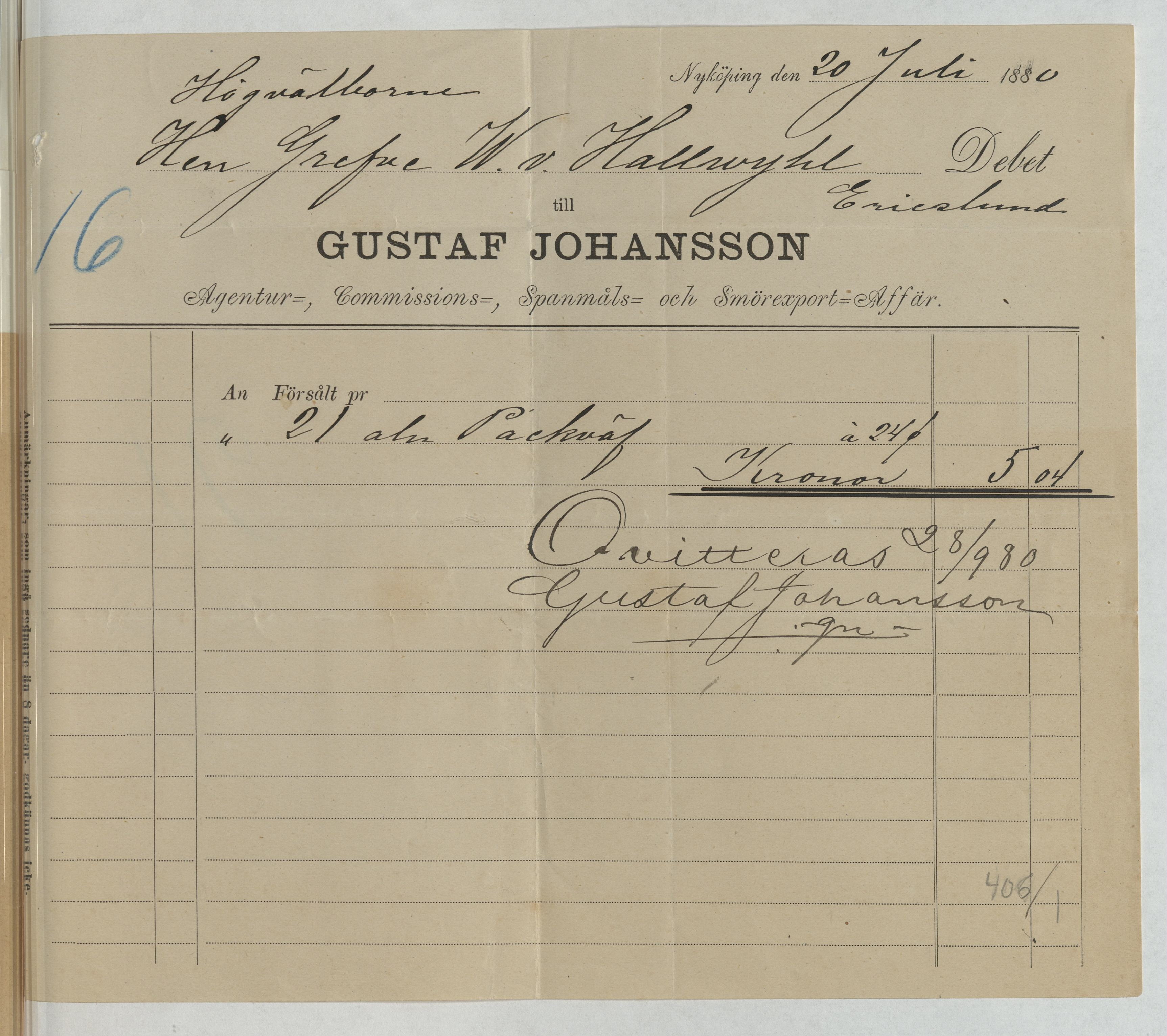 Kvitto från Gustaf Johansson. Agentur-, Commissions-, Spanmåls- och Smörexport-Affär. Nyköping, 1880.