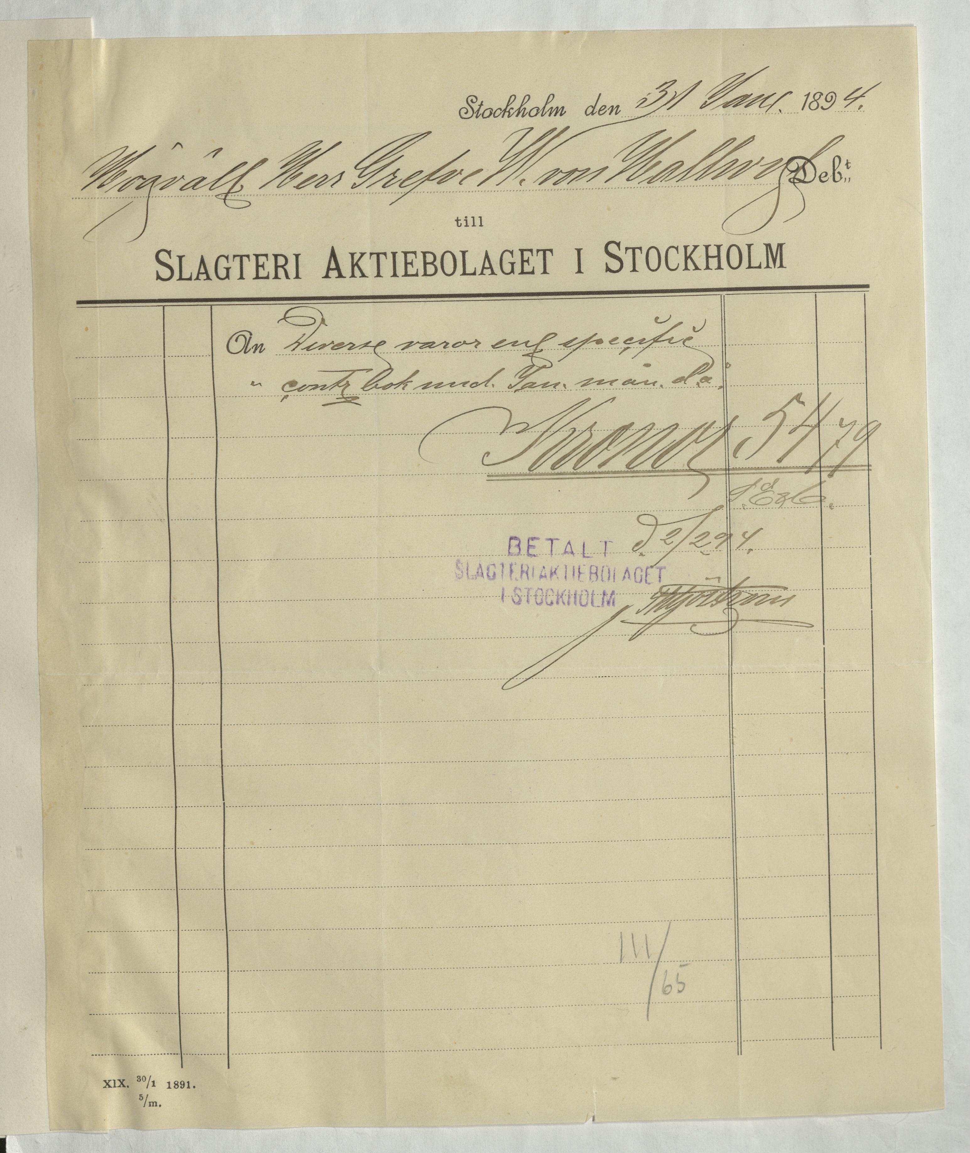 Kvitto från Slagteri Aktiebolaget i Stockholm