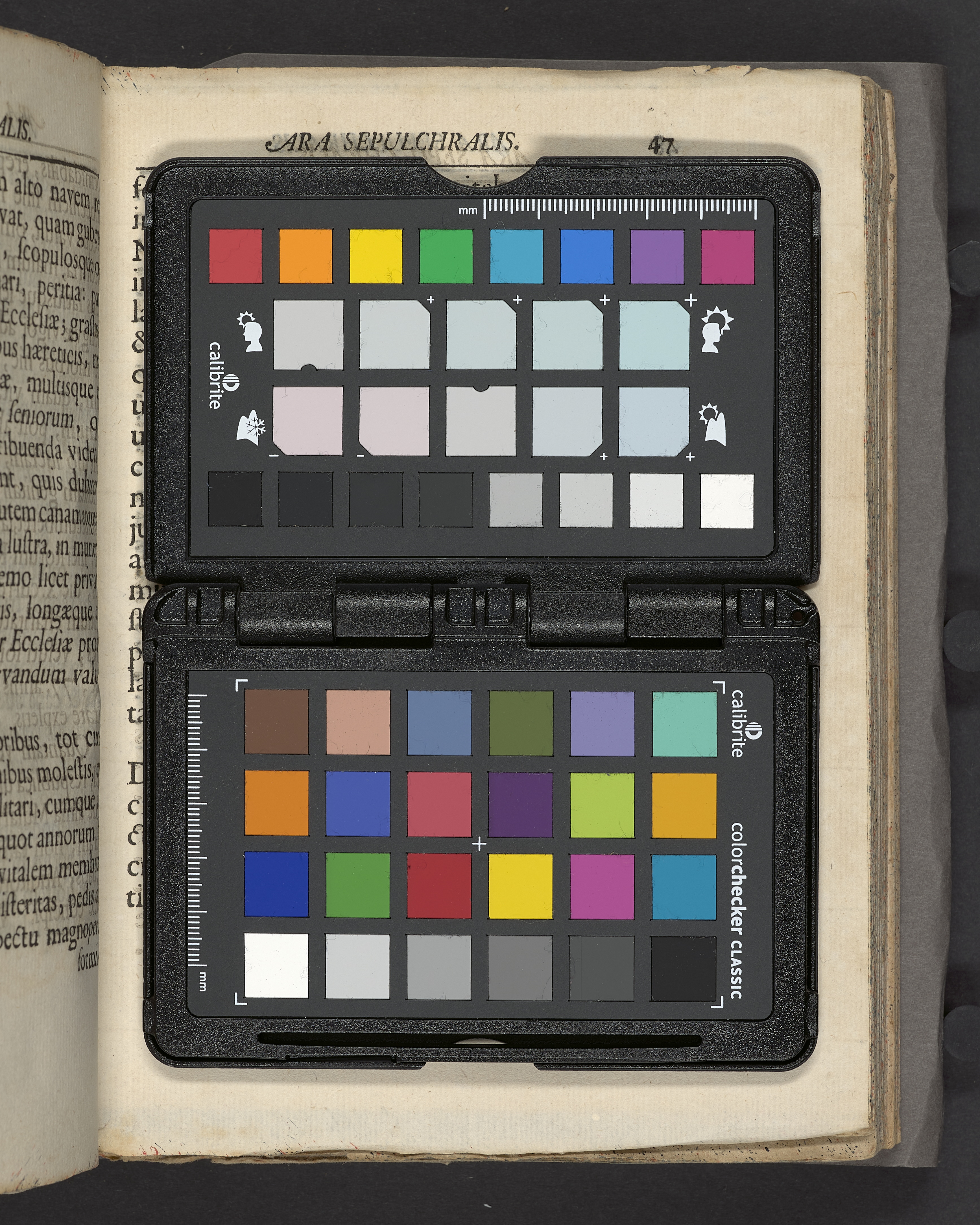 Antikva. Snitt stänkt i rött och blått.